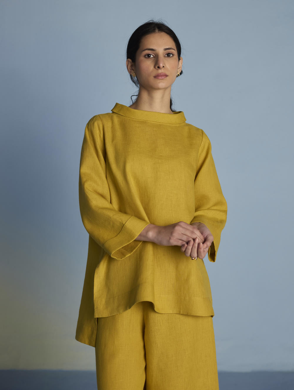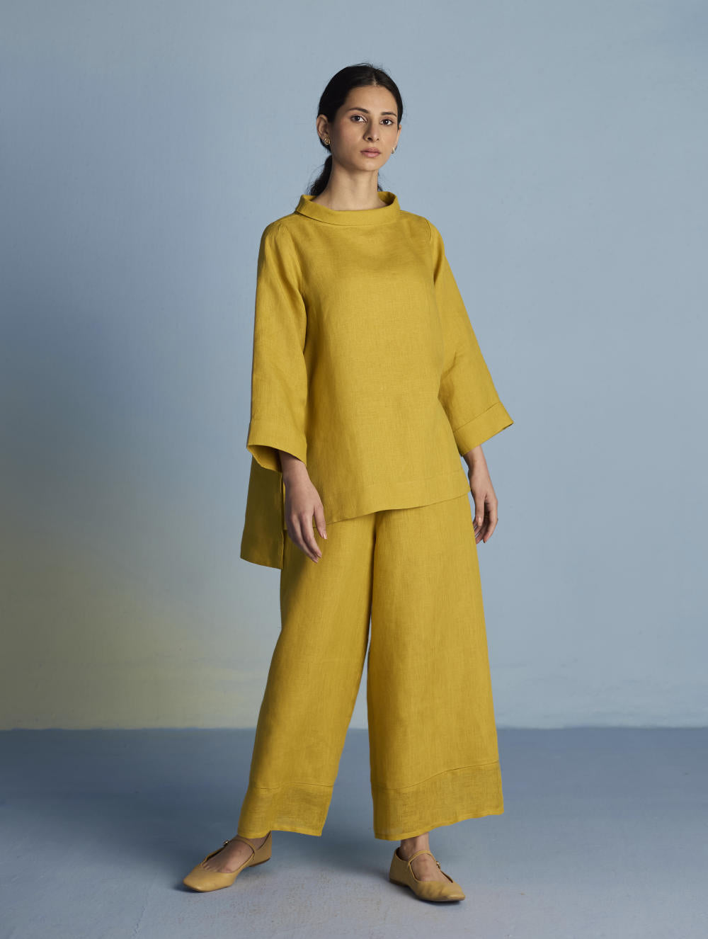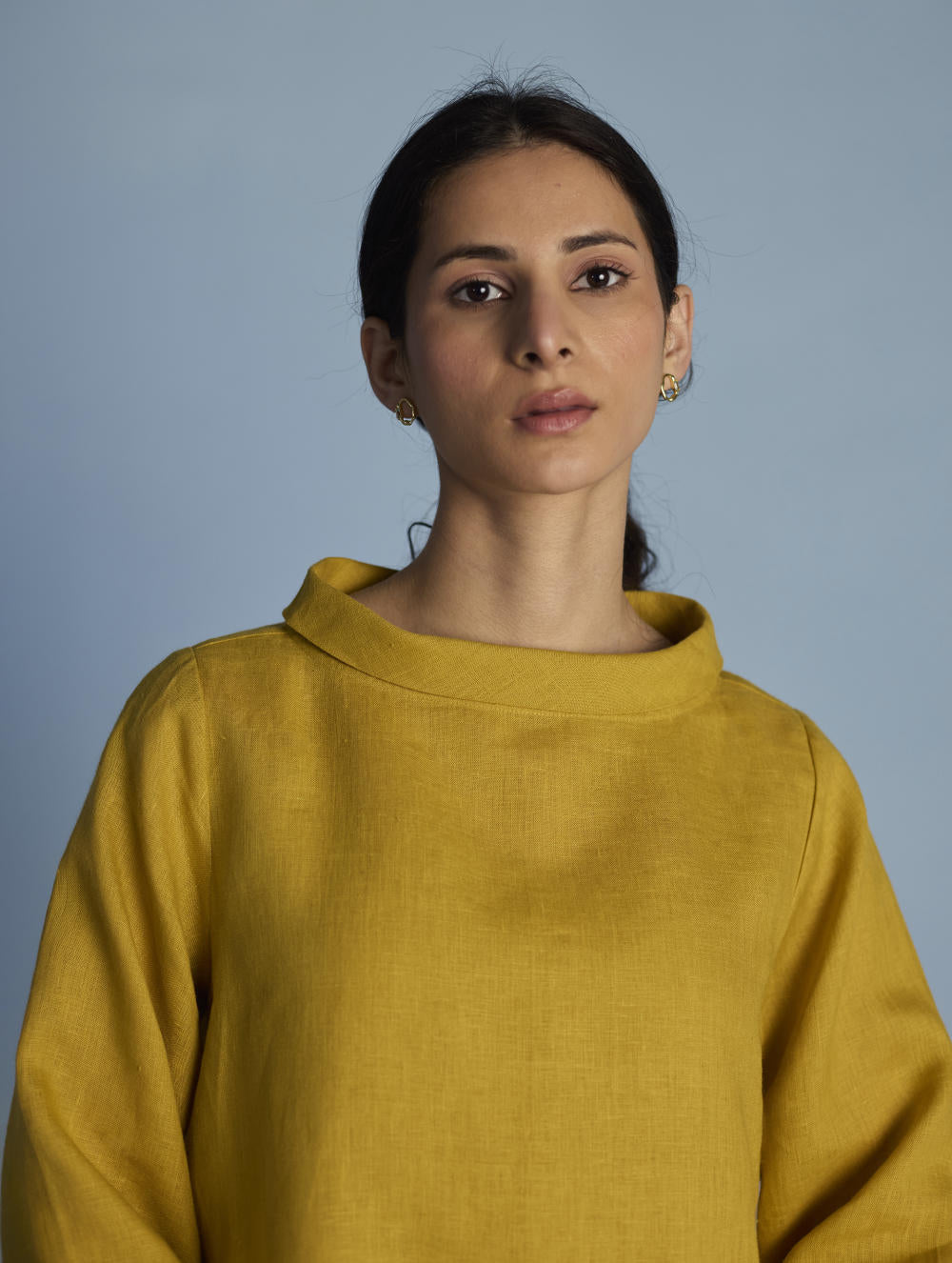 A statement boat neck top with 3/4th flared sleeve handcrafted in our signature soft yarn-dyed linen. The boat-neck top pairs beautifully with our linen pants or your favourite denims and is finished with delicate hand painted floral print facing and long slit sides for easy movement.