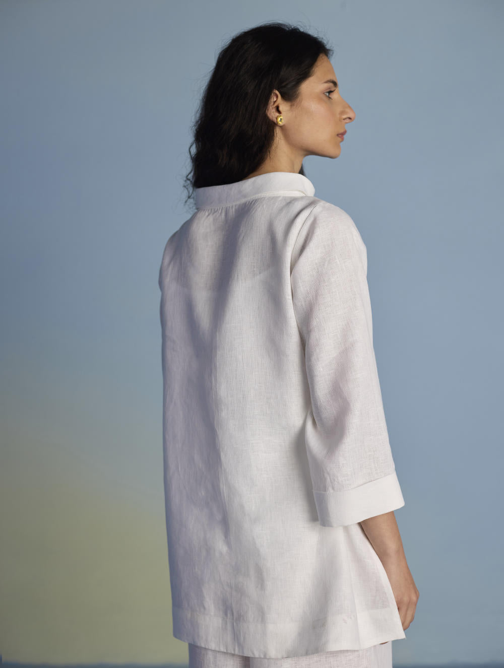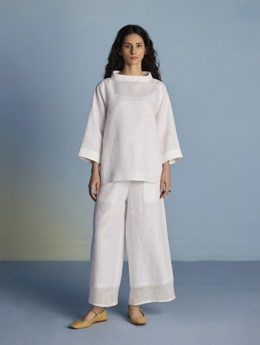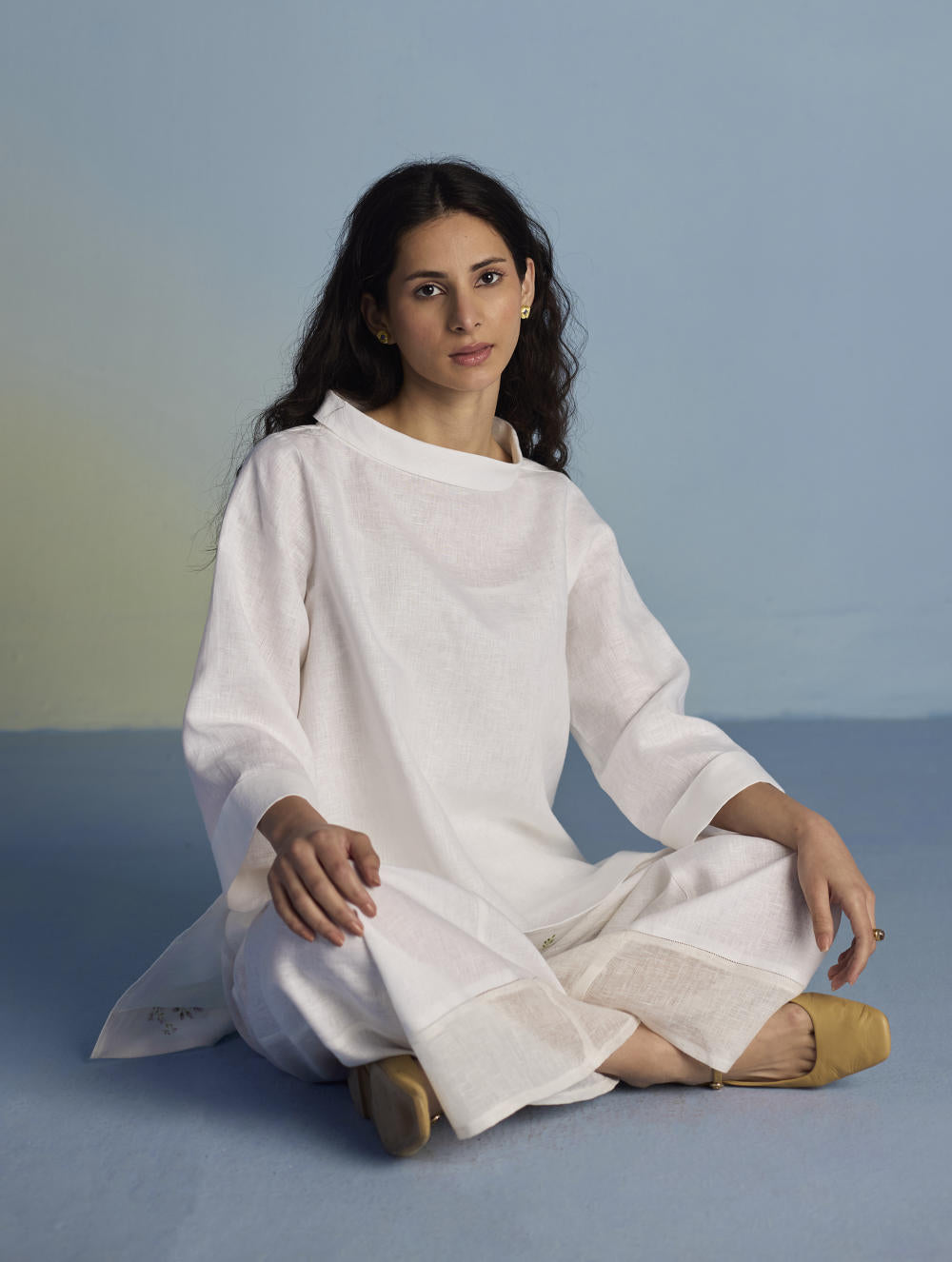 Their signature linens soften beautifully with time, eventually returning to the earth. They work with eri (ahimsa) silk, celebrated for its strength and gentle texture, and craft thoughtful blends of viscose, cotton, silk, and linen for pieces designed to last. Yarn-dyed techniques minimise chemical use and create the subtle, heathered tones that have become a quiet Manan signature.