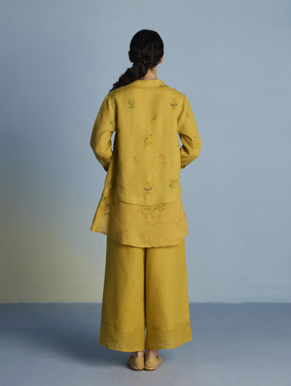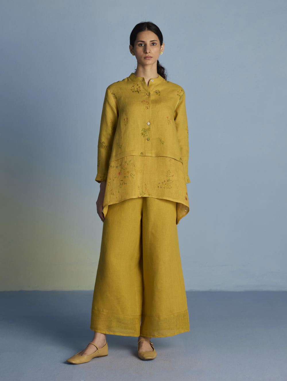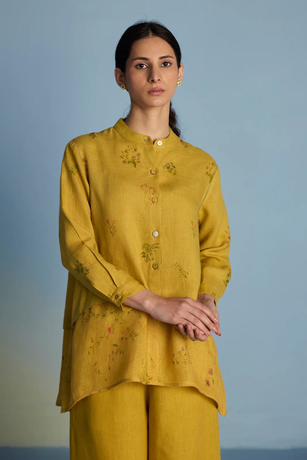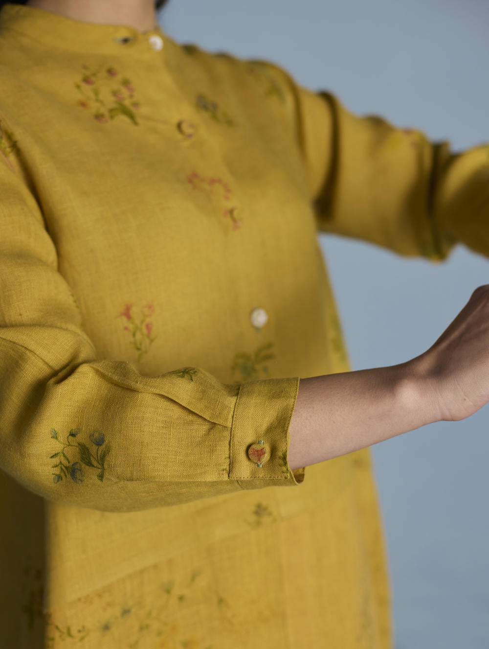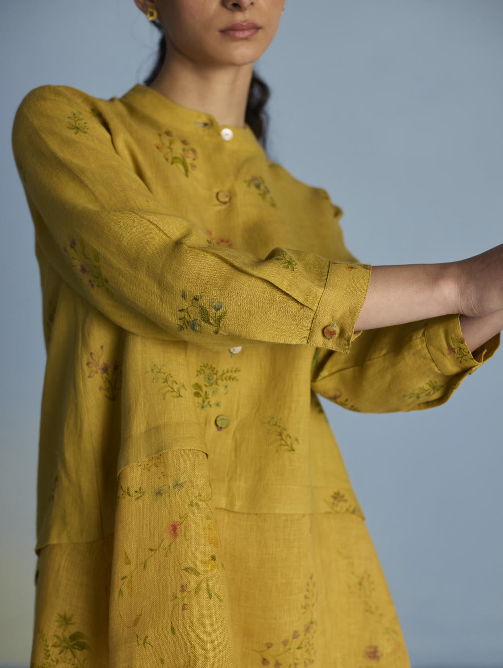 A statement A-line shirt crafted from our signature soft pure linen and soft flowing sheer linen. Featuring two hand-illustrated delicate multi-colour floral prints - a jaal print and a buta print, the shirt is finished with unique mixed material buttons including linen fabric buttons and a crochet button, colourful thread buttonholes and faggoting stitch detailing. Leina is perfect for evening gatherings and social events, offering both comfort and versatility.