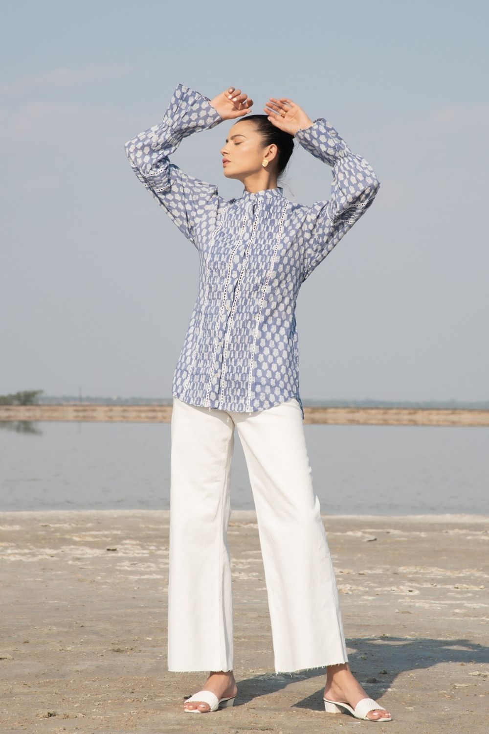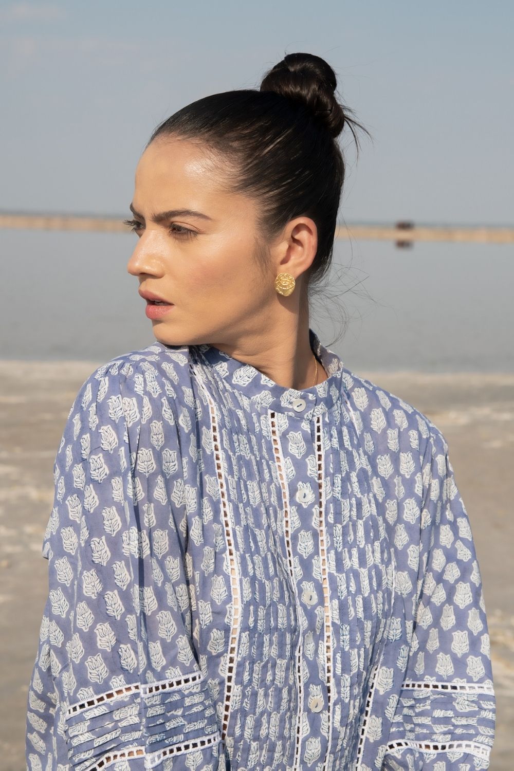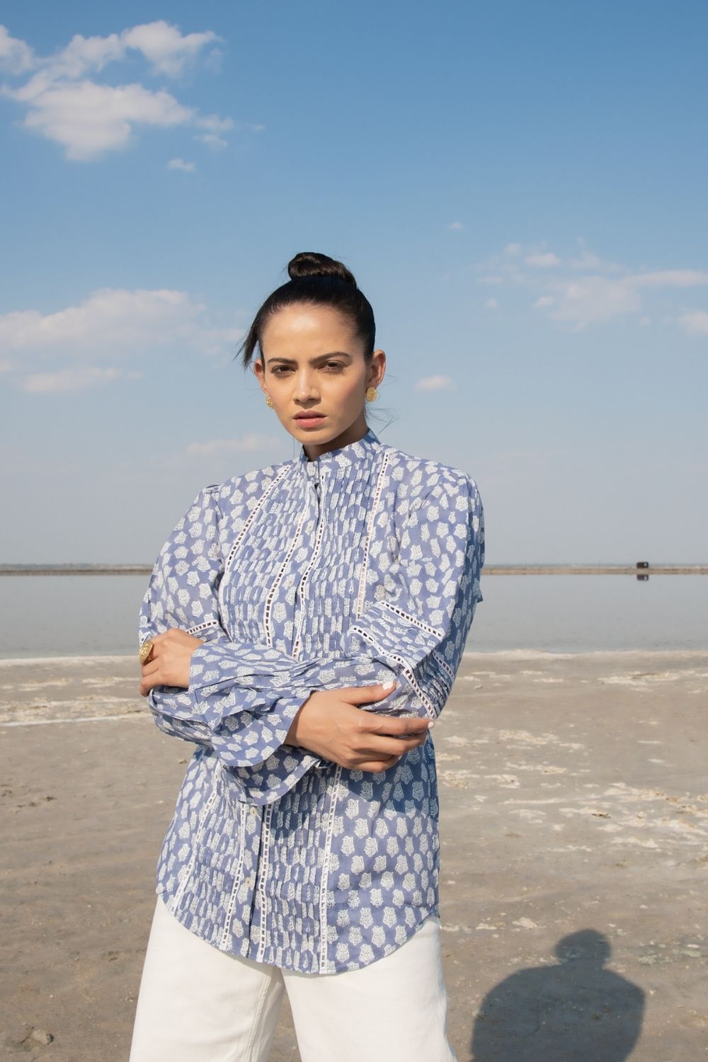 A classic full sleeves shirt with handblock printed lotus flowers in blue on the softest cotton base. Impeccable sleeve detailing with a simplistic collar to tie the look together.