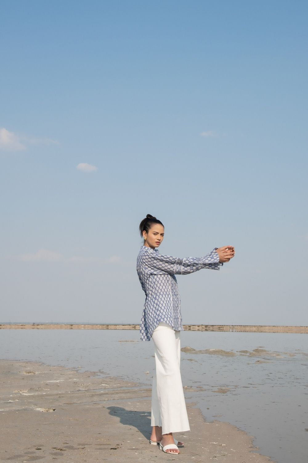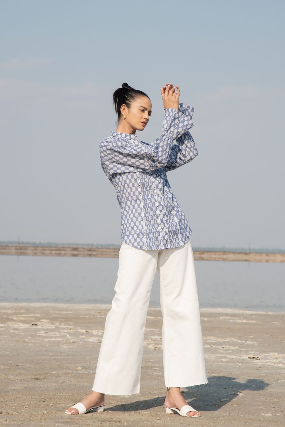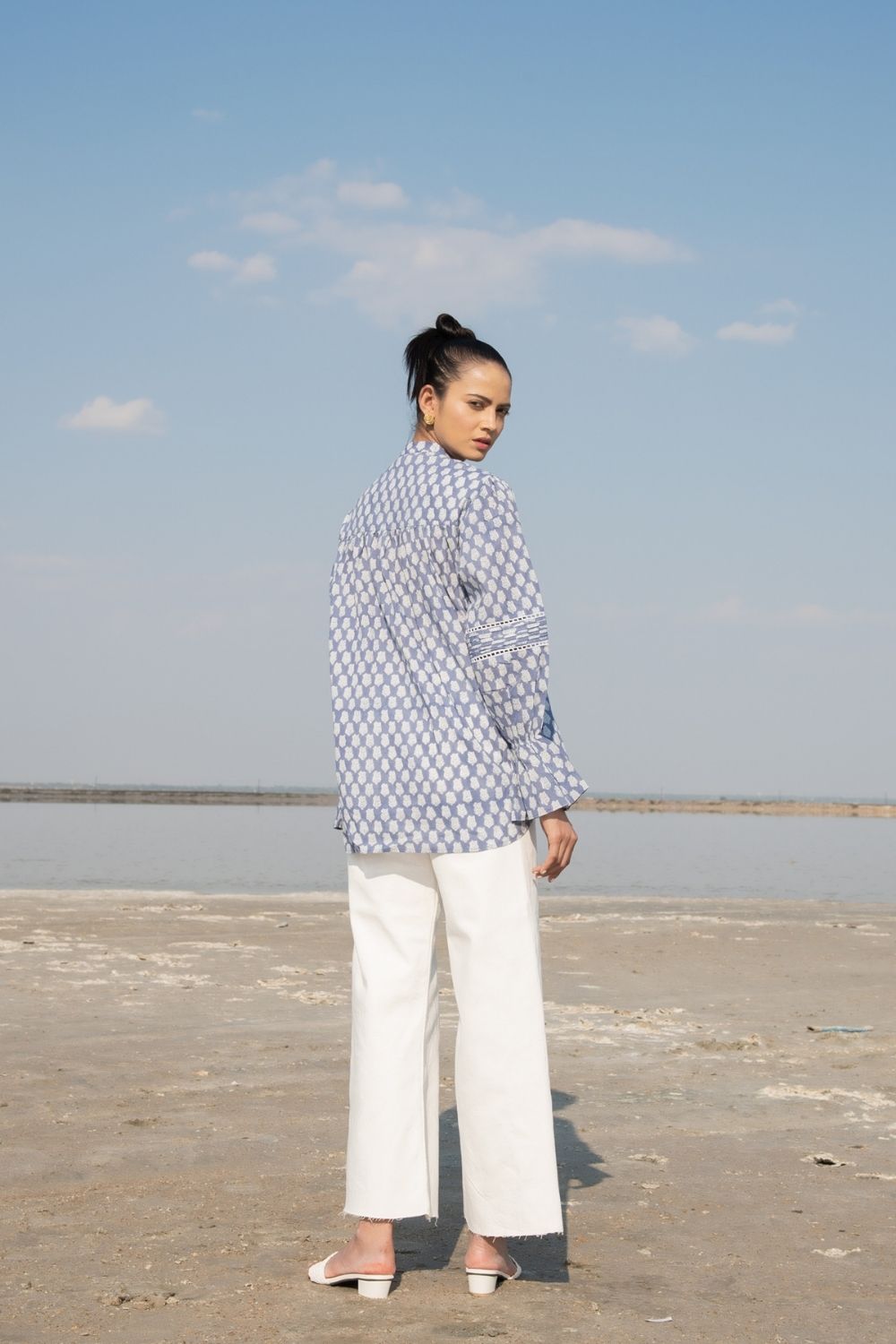 A classic full sleeves shirt with handblock printed lotus flowers in blue on the softest cotton base. Impeccable sleeve detailing with a simplistic collar to tie the look together.
