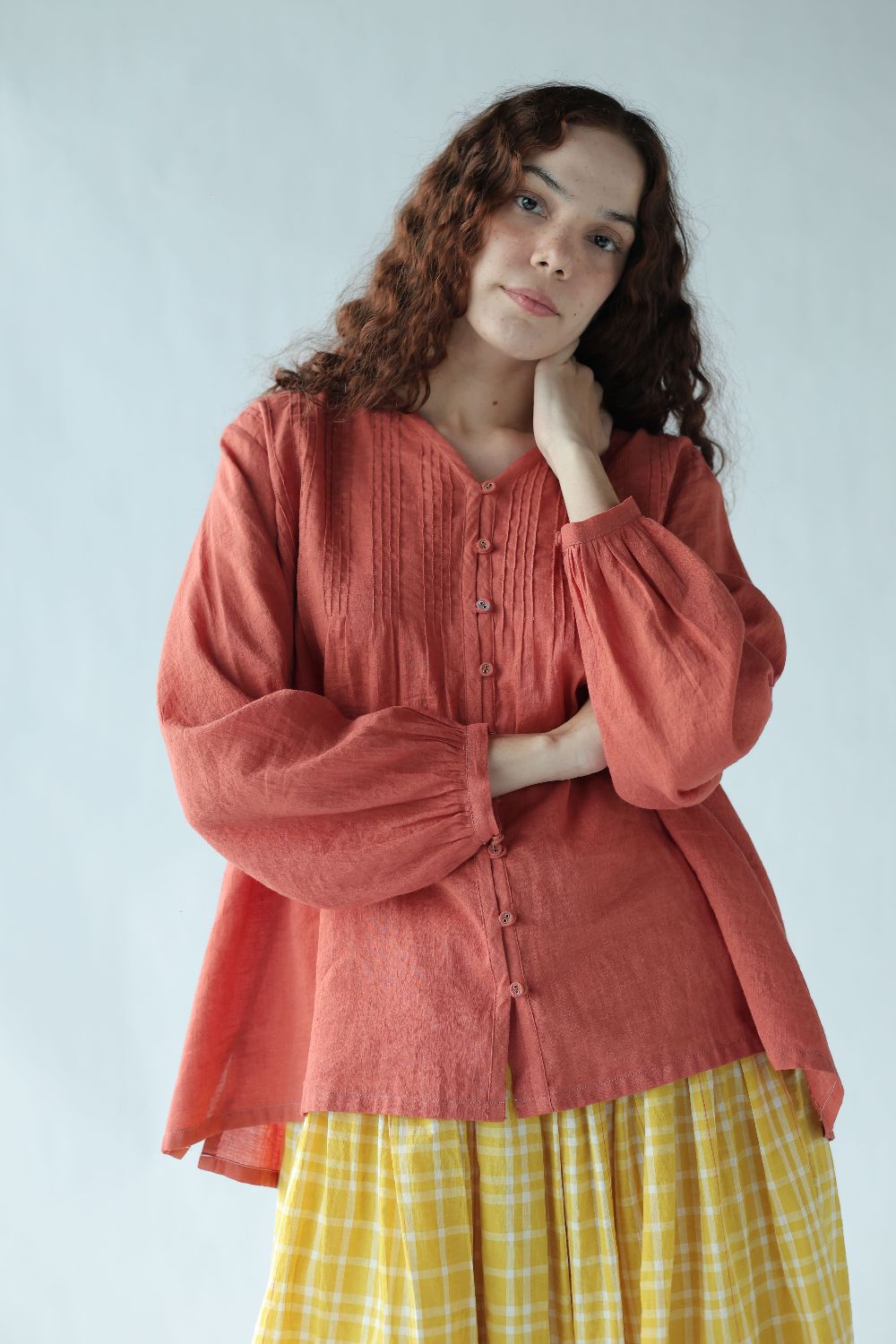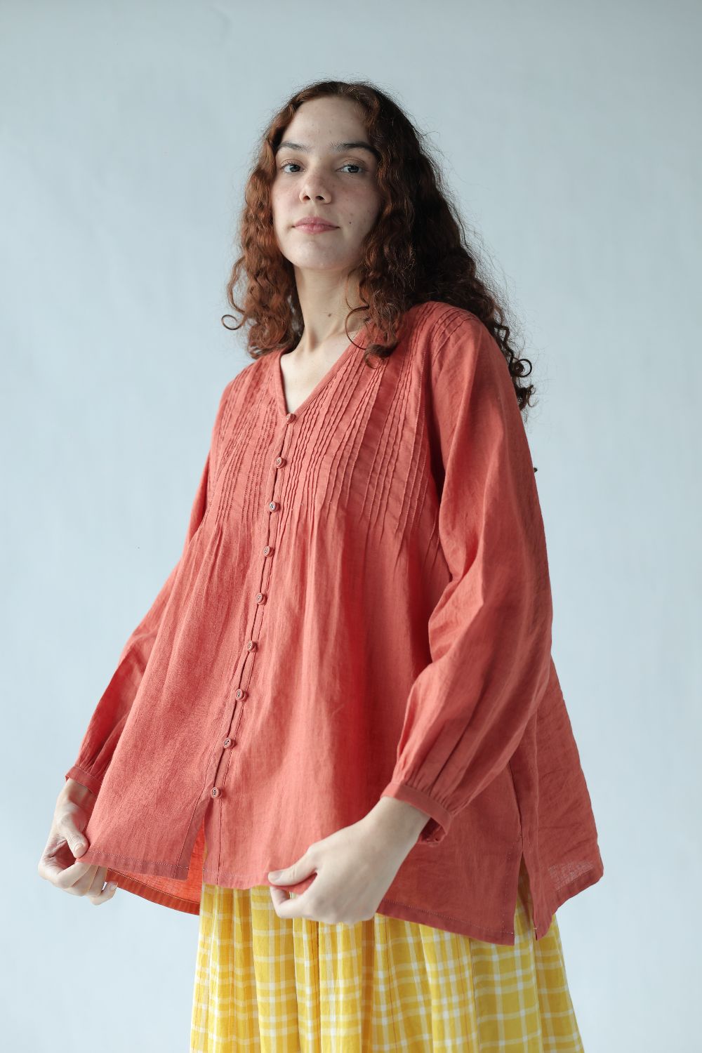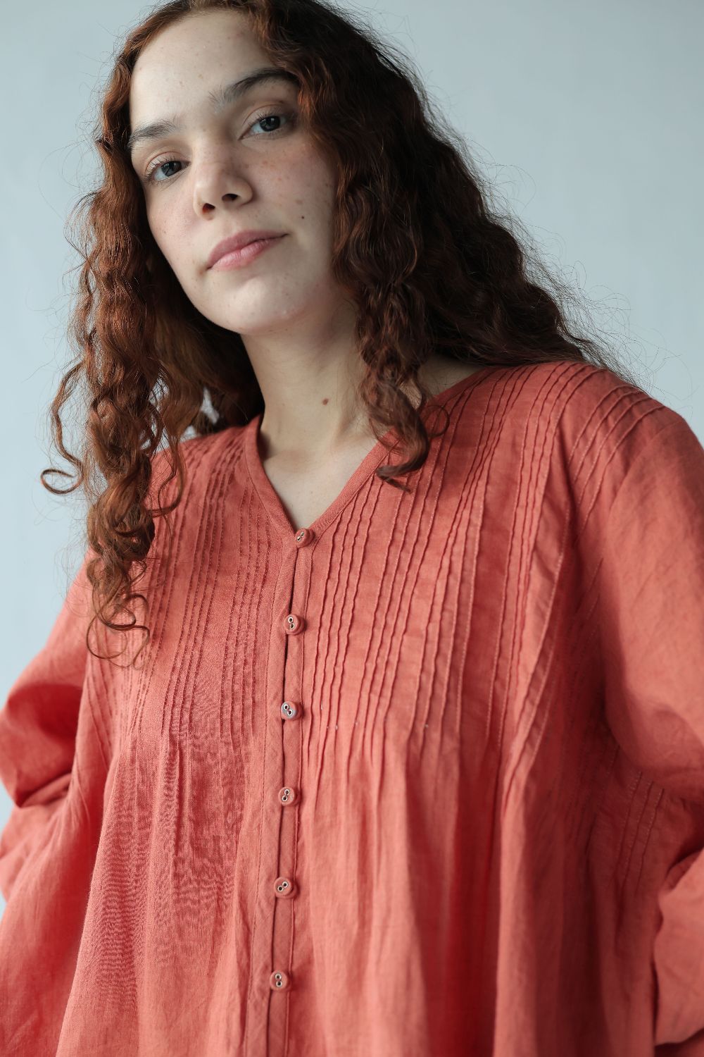 This top features pintucks suspended from the shoulder and loop buttons along the centre front. Crafted in handwoven cotton linen for a refined, textured look.