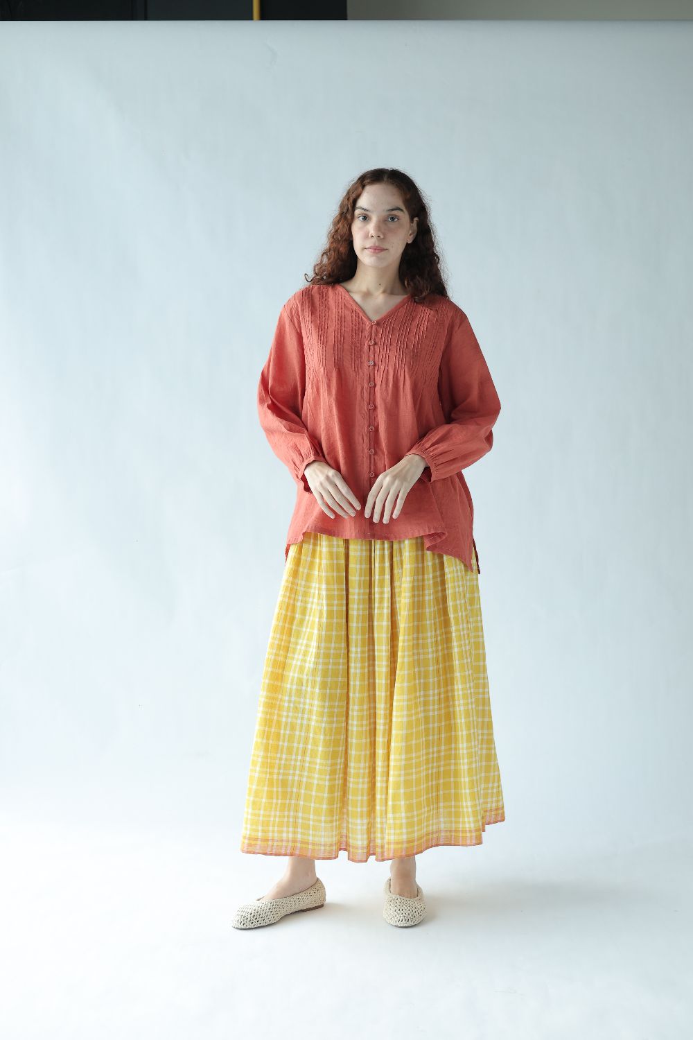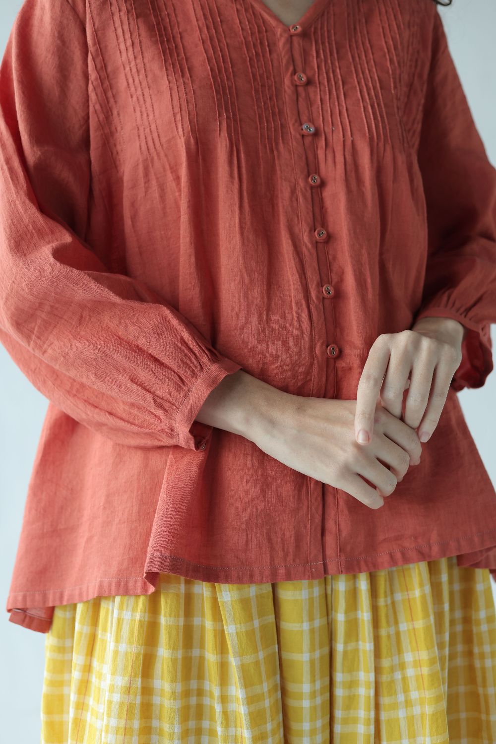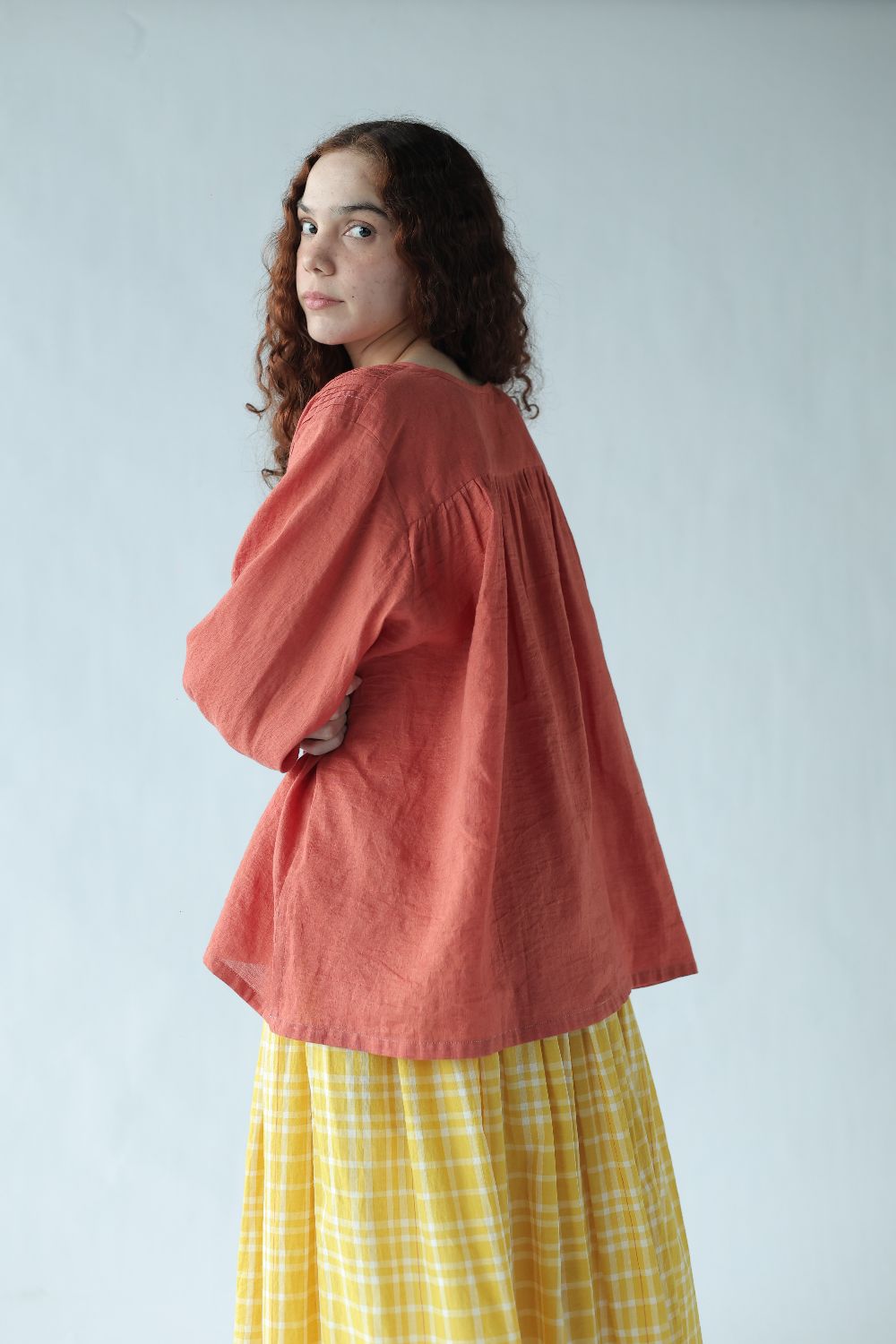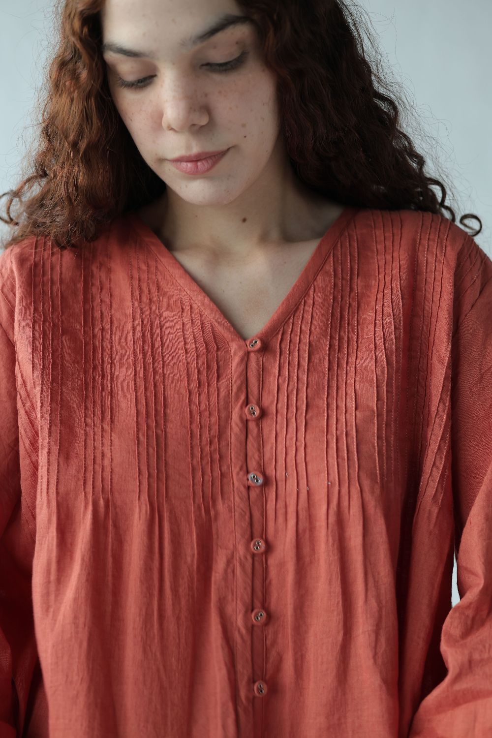 This top features pintucks suspended from the shoulder and loop buttons along the centre front. Crafted in handwoven cotton linen for a refined, textured look.