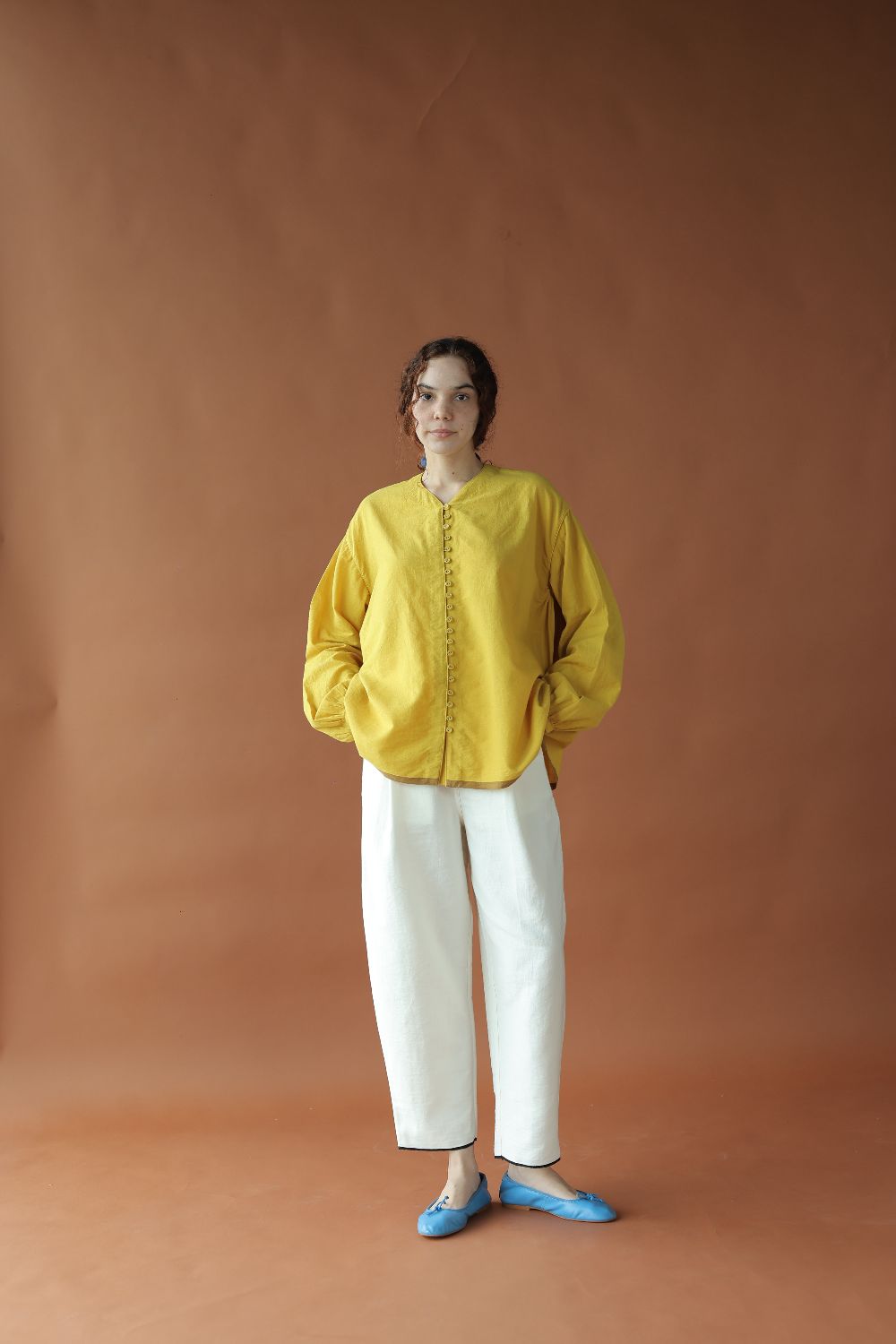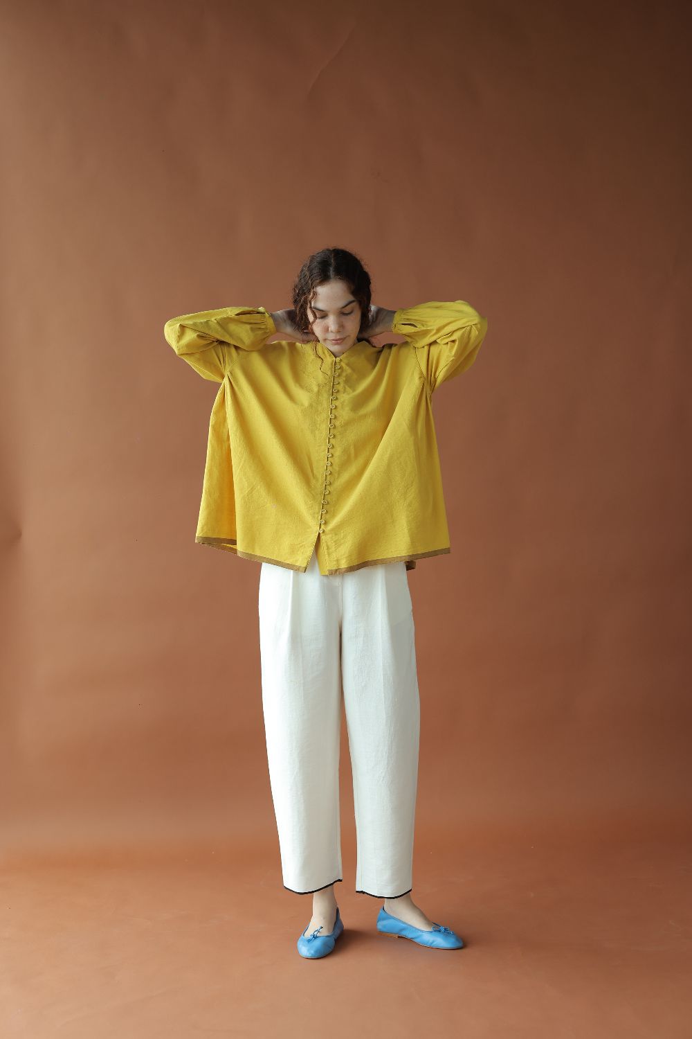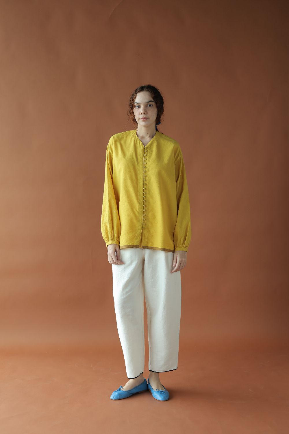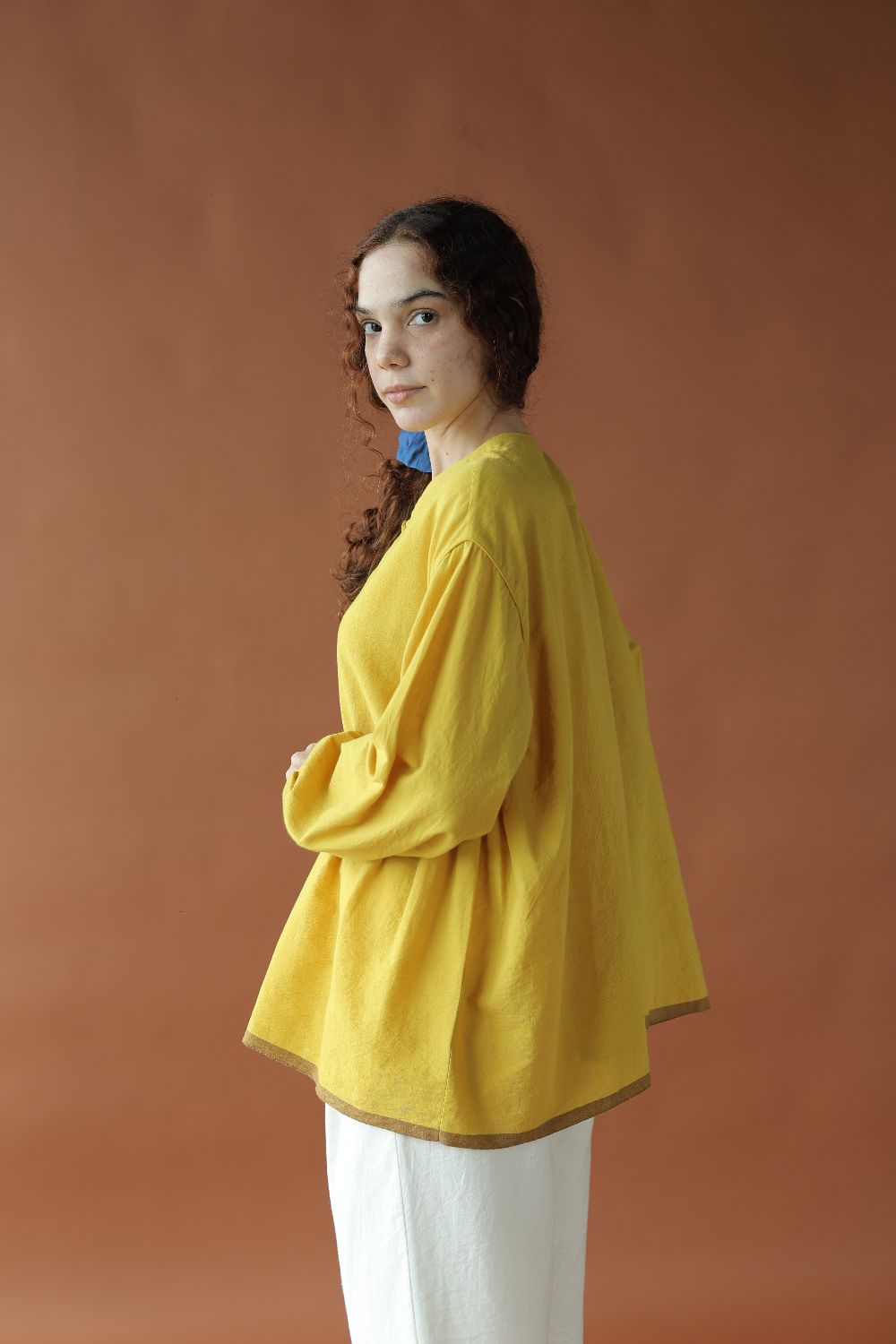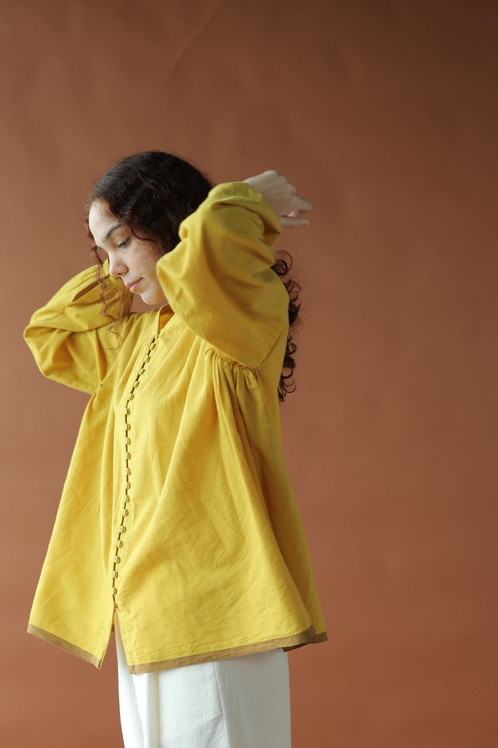 Cut in a vibrant handwoven cotton, 'Ira' is fuss-free oversized top with an open front and gathers along the sides. A small V-neck and voluminous sleeves to complete the look.