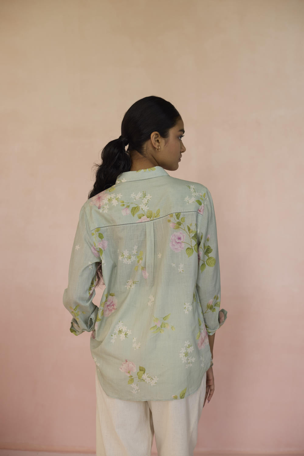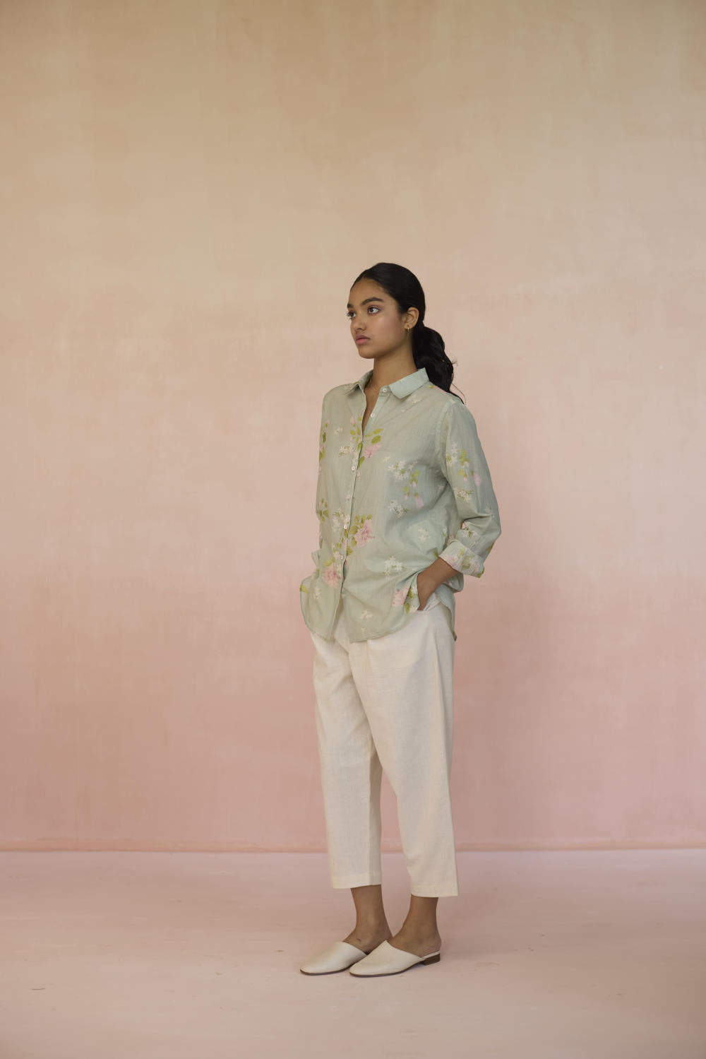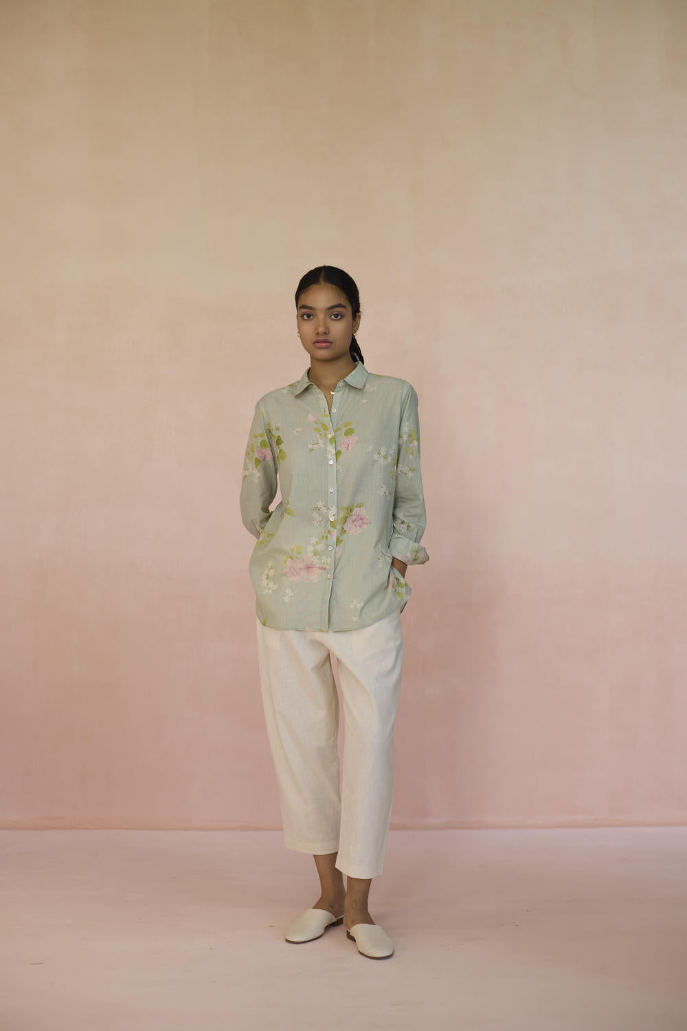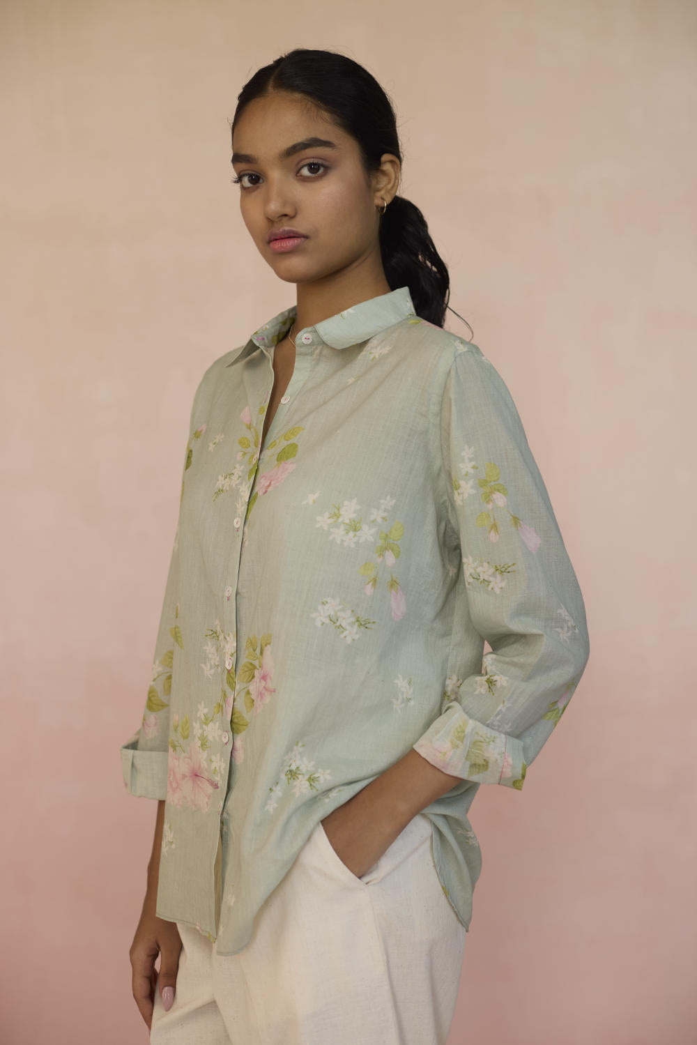 The Hibisucs flower blooms with a quiet confidence, a symbol of beauty that’s alive. Our Hibiscus shirt in soothing pistachio green colour embodies a world of fleeting moments,reminding us that there is power in simplicity, and beauty in everything. The shirt is made from 100% handspun, handwoven cotton that lends grace and form to the fabric. Hand-sewn shell buttons and hand-swen seams adds a touch of individuality. The Hibiscus shirt is a breezy style statement for those evening outings or everyday wear.