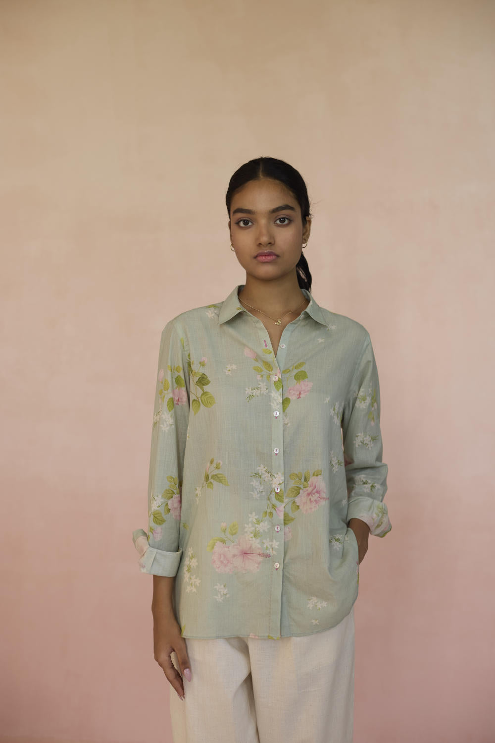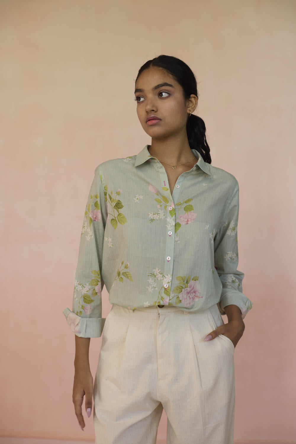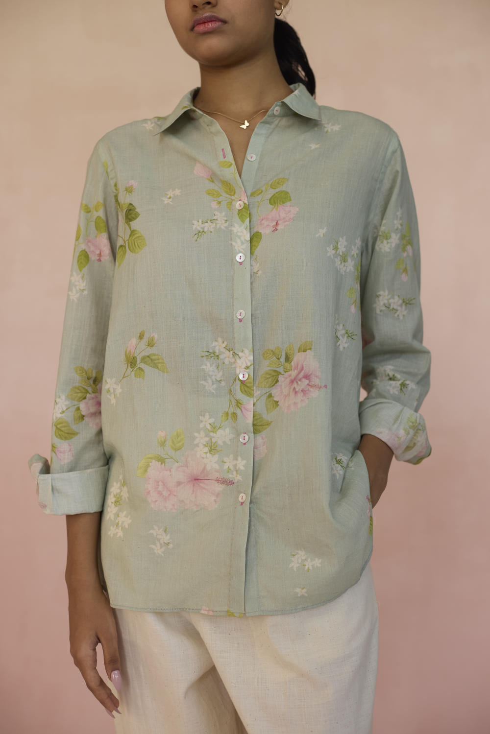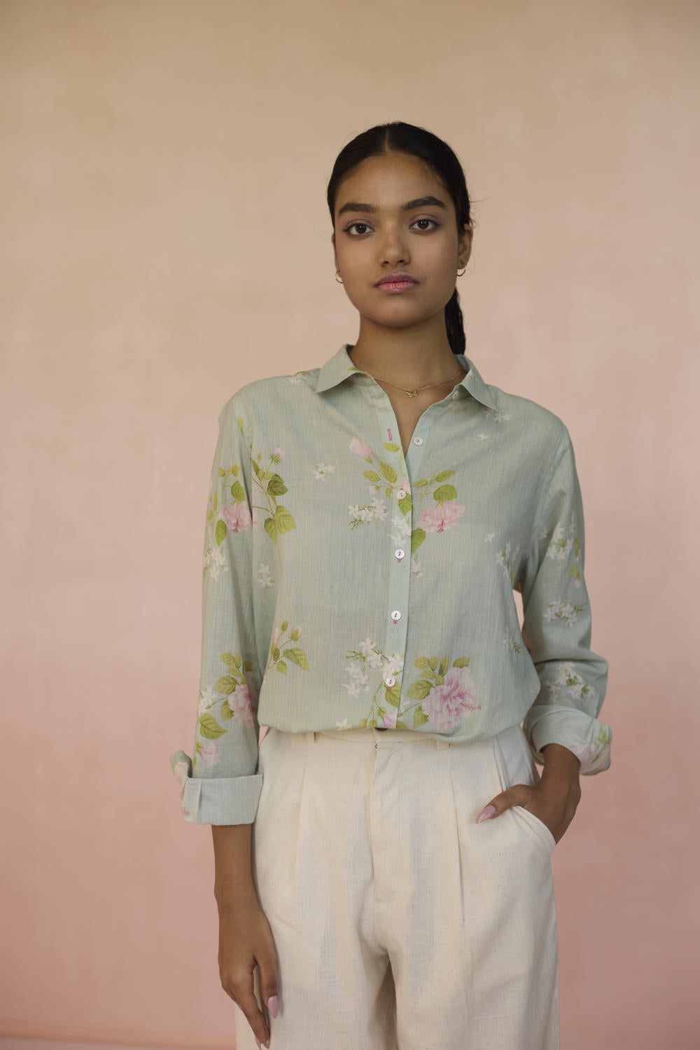 The Hibisucs flower blooms with a quiet confidence, a symbol of beauty that’s alive. Our Hibiscus shirt in soothing pistachio green colour embodies a world of fleeting moments,reminding us that there is power in simplicity, and beauty in everything. The shirt is made from 100% handspun, handwoven cotton that lends grace and form to the fabric. Hand-sewn shell buttons and hand-swen seams adds a touch of individuality. The Hibiscus shirt is a breezy style statement for those evening outings or everyday wear.