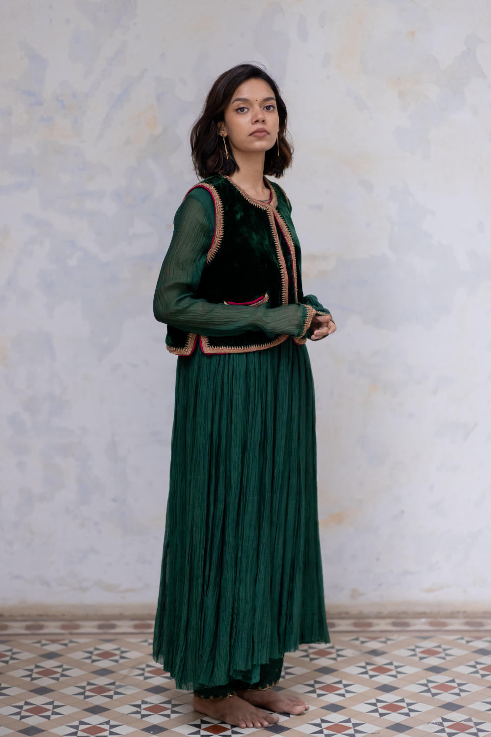 Velvet Sadri with traditional embroidered crescent pockets and Kangri edges in Marodi Embroidery. It has a contrasting magenta magji and a quilted lining for warmth