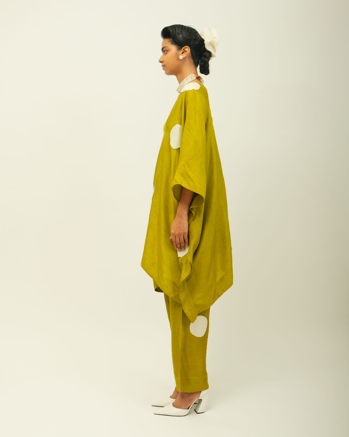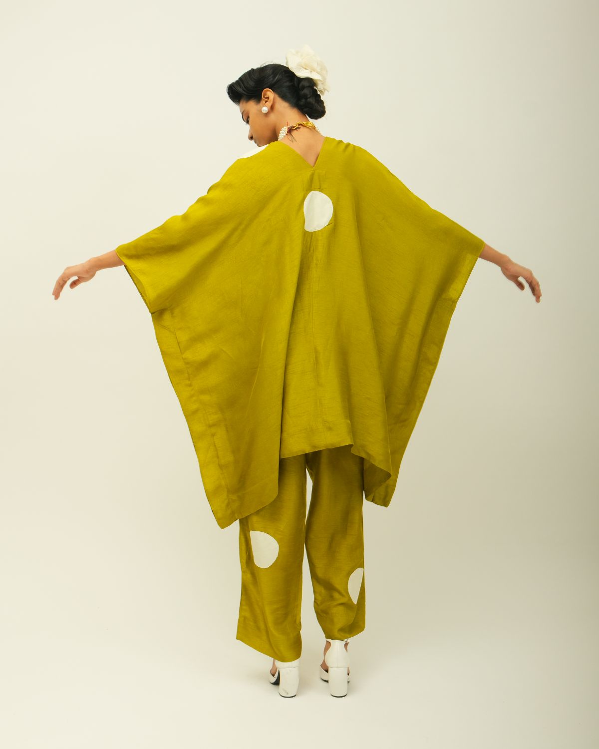 Anti-Fit, shirt collar, bellle sleevs, bead detailing, hand embroidered polka motifs appliqued --single piece.