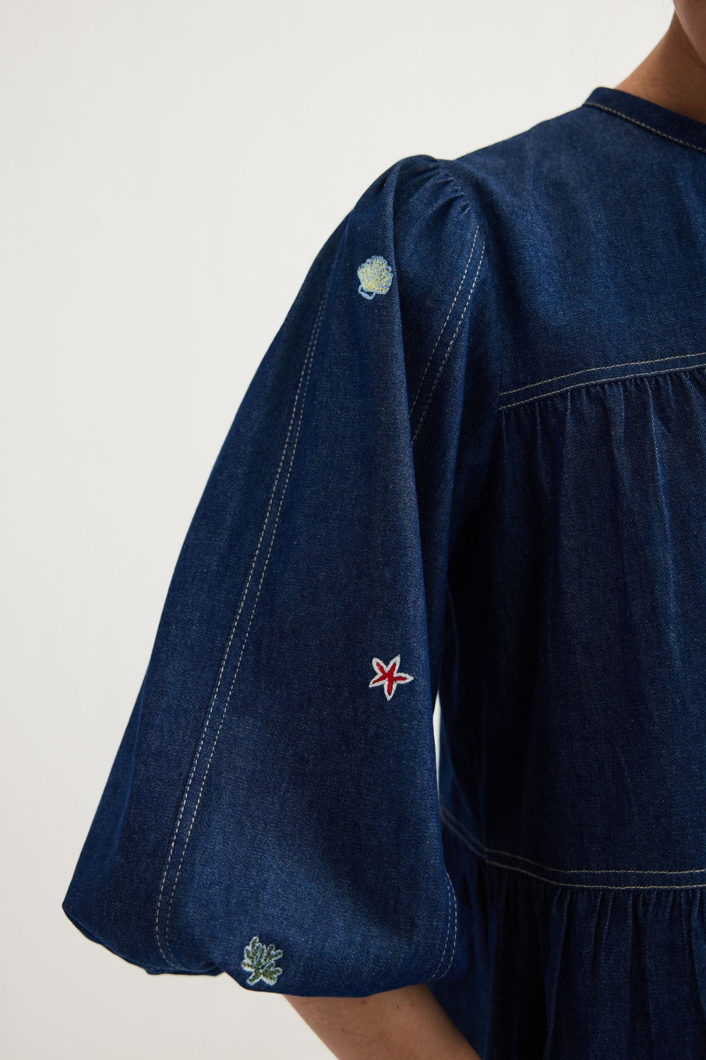 Regular fit, three quarter puff sleeve, gathered and tiered shirt with a keyhole neckline that fastens with fabric ties, crafted in indigo dyed cotton denim fabric created with a blend of cotton and recycled cotton fibres, machine and hand embroidered with ocean-inspired motifs.