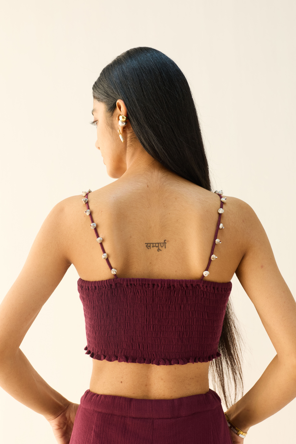 Fitted, bustier crop top that has shell detailing along the straps, crafted in azo-free dyed double gauze organic cotton fabric.