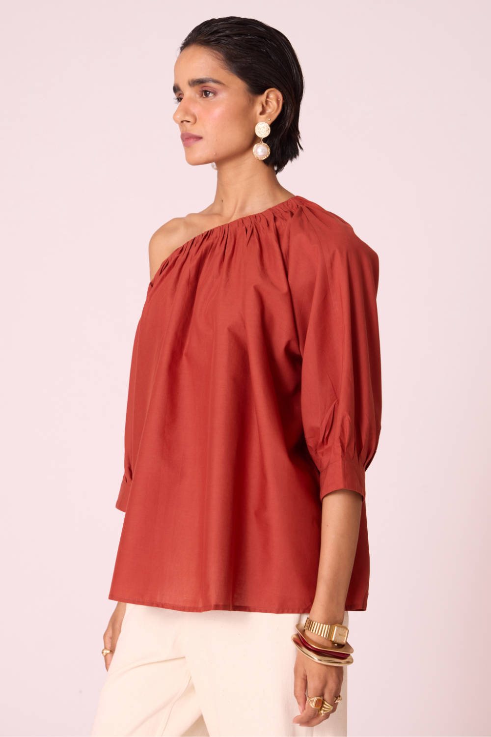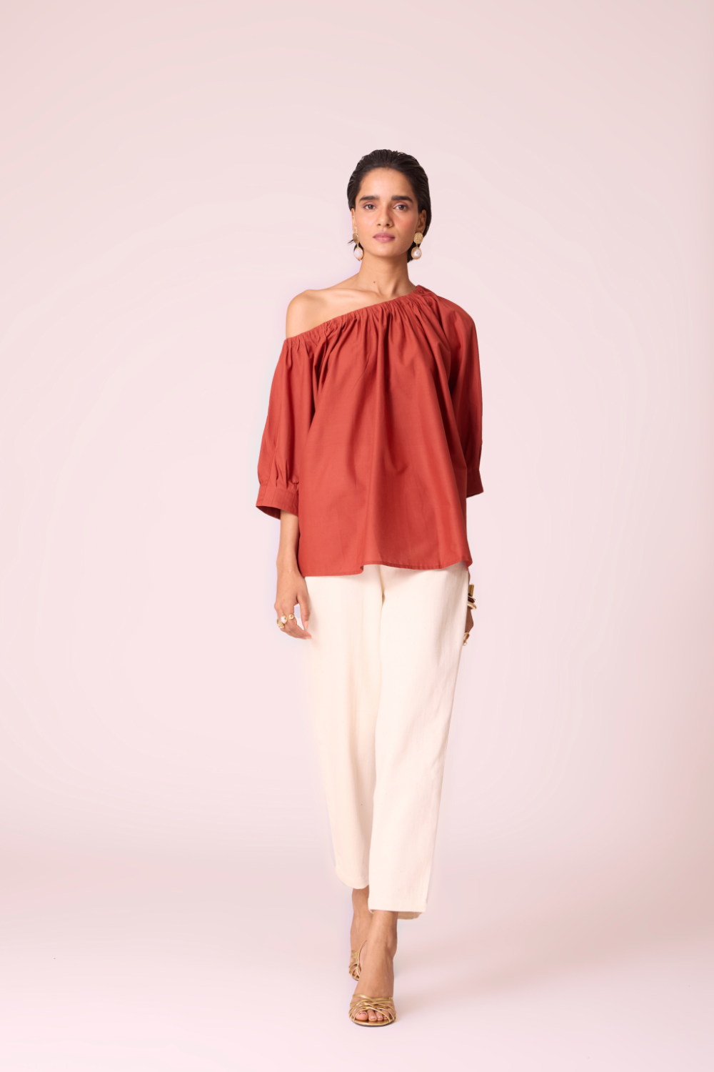 A light, gathered off-shoulder silhouette that frames the neckline with quiet ease. The Dina top brings softness and structure together, its pleated cuffs lending measured volume to an otherwise fluid form.