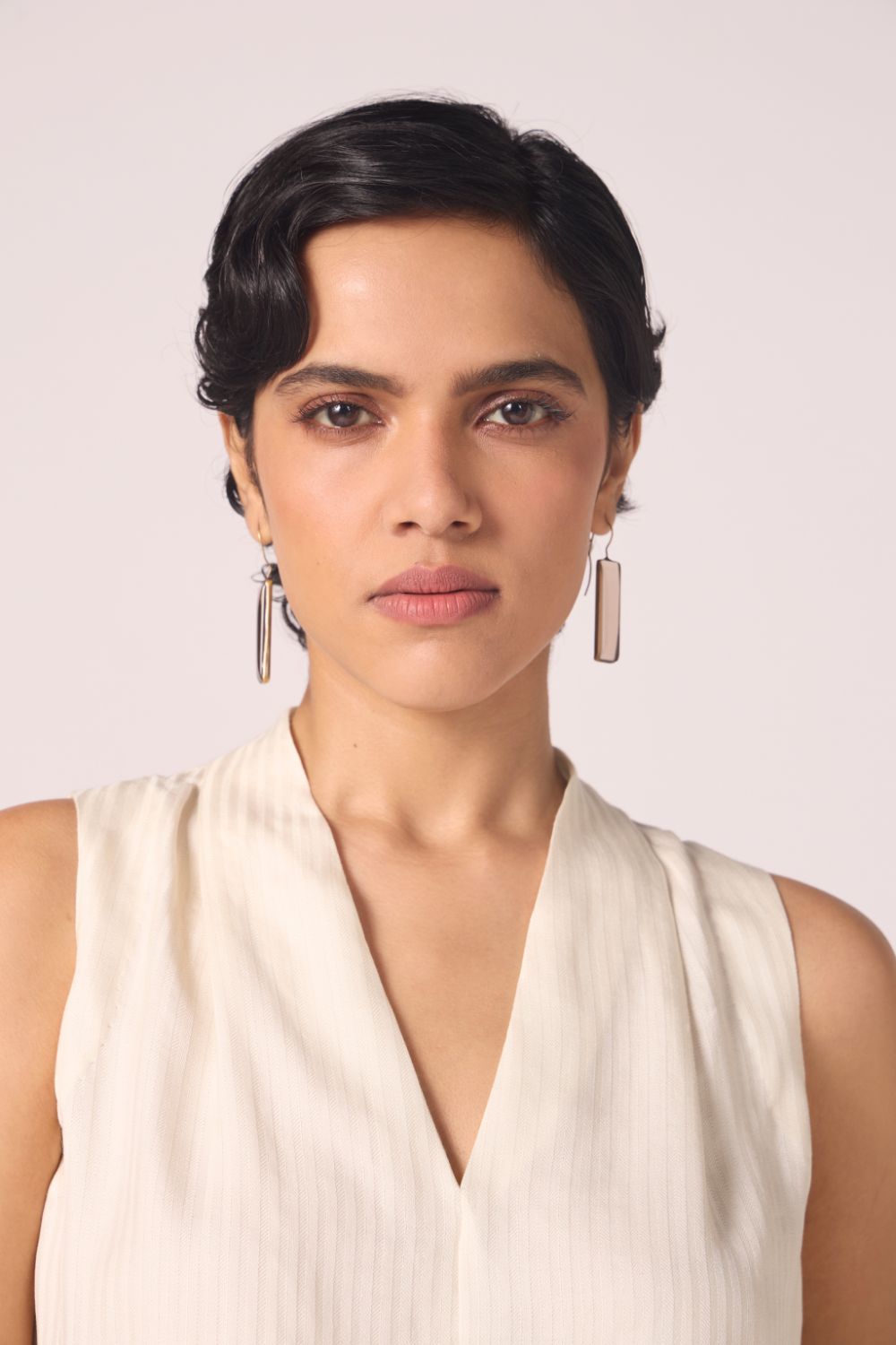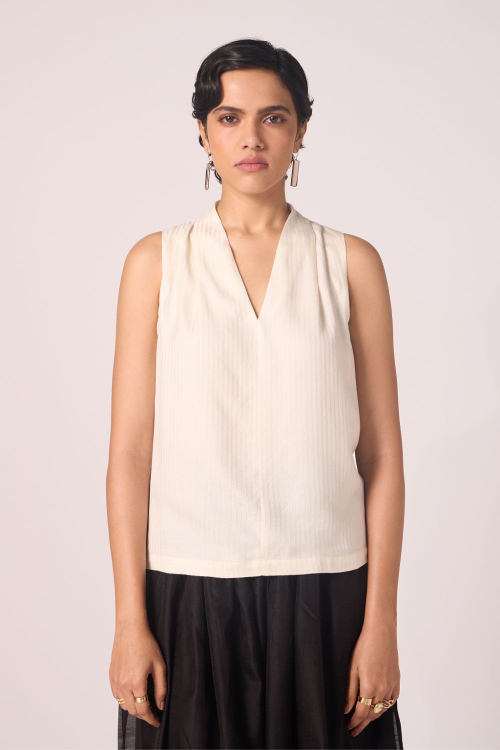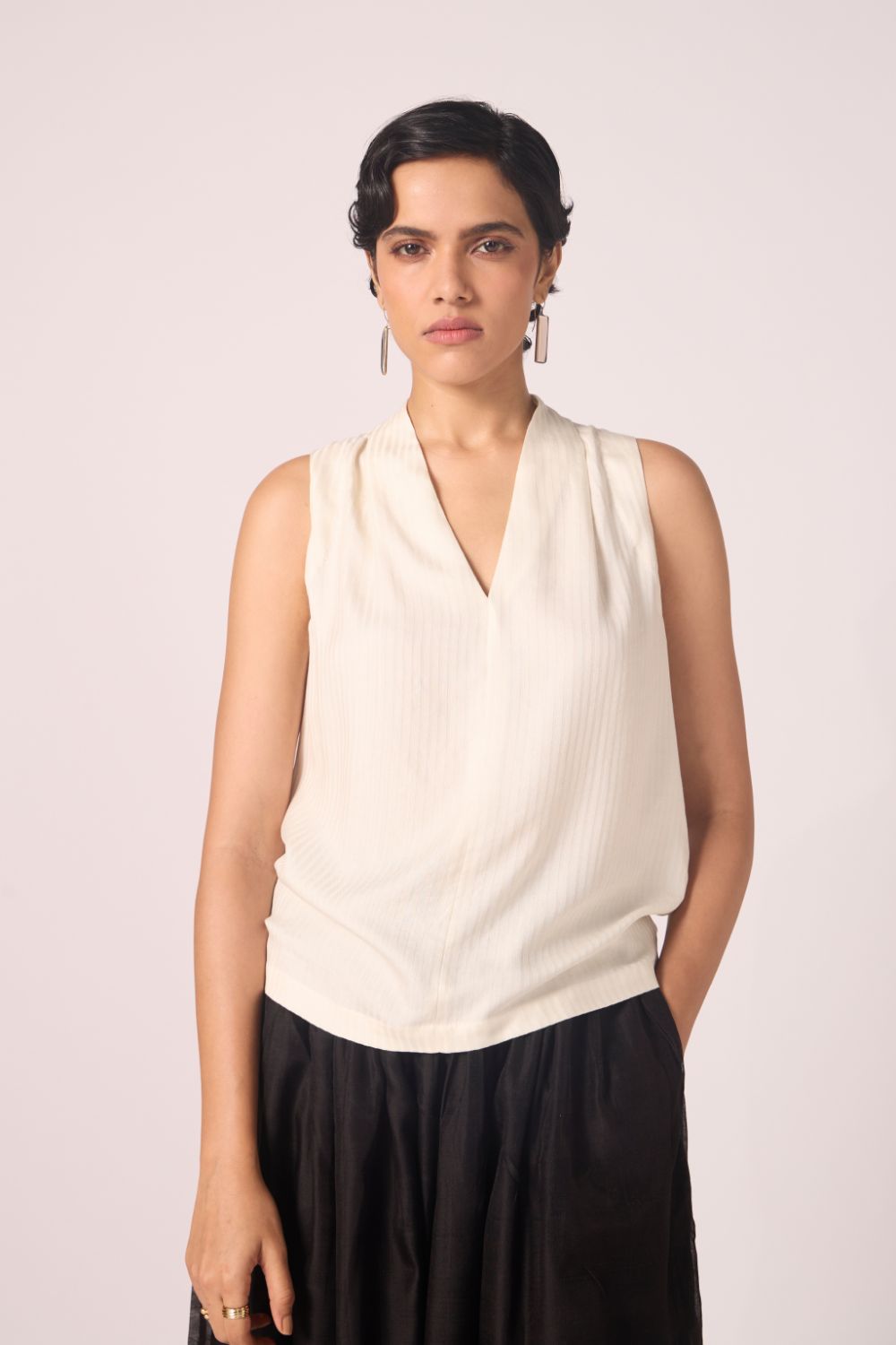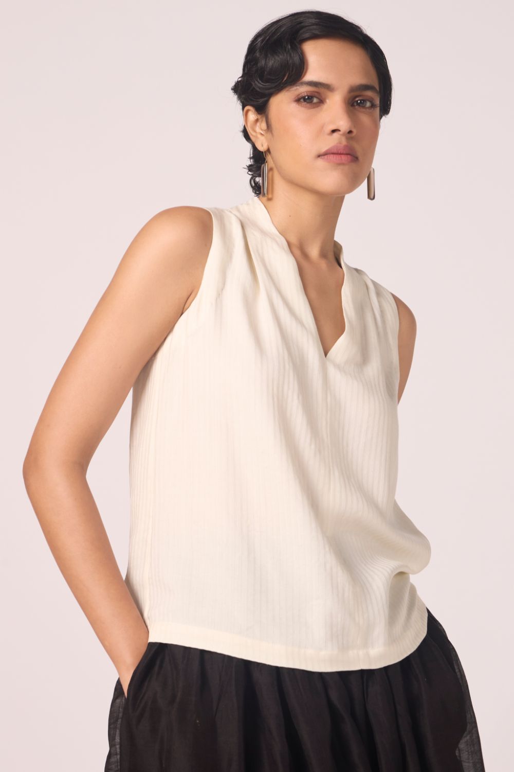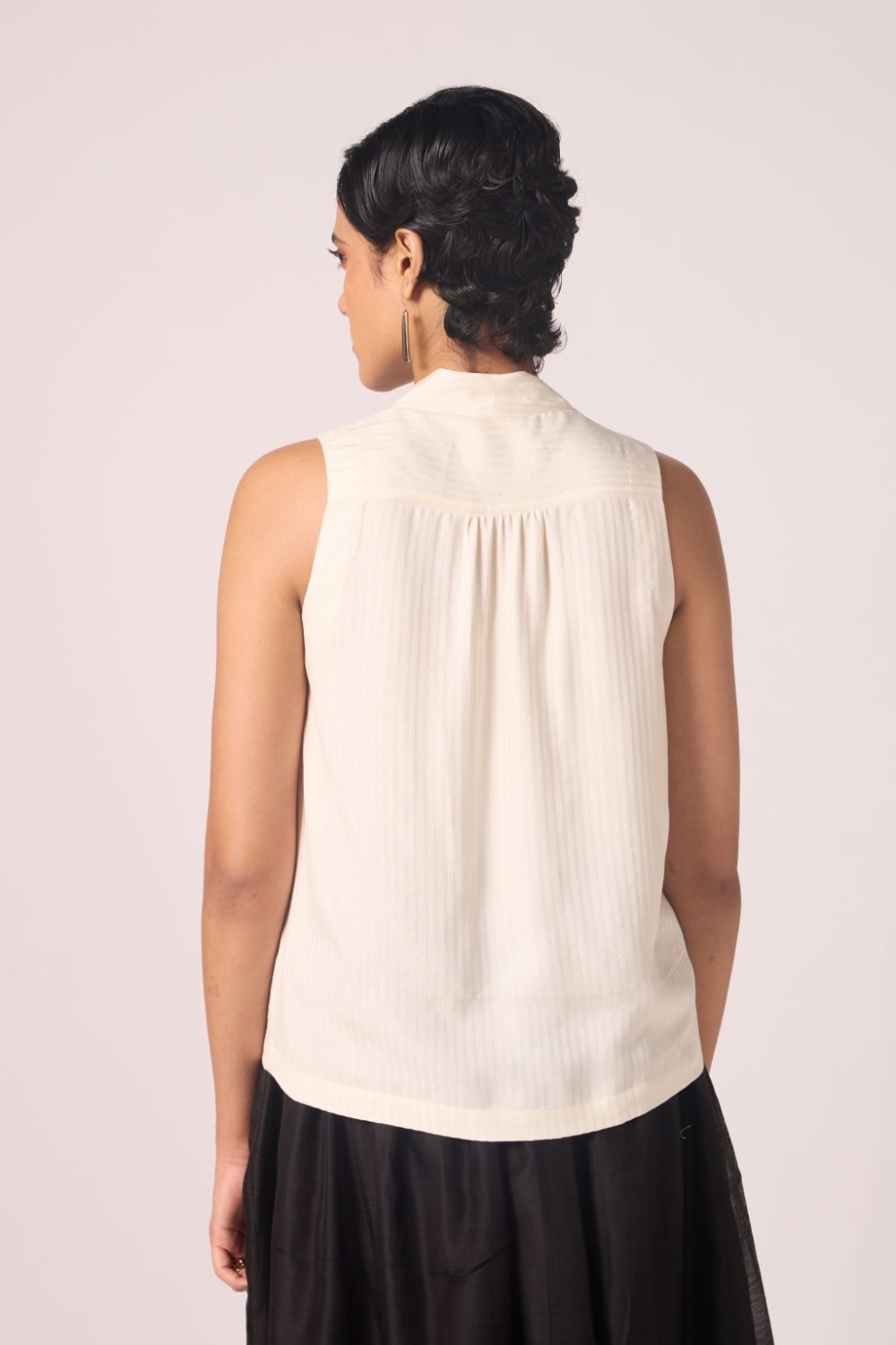 Quiet architecture at the neckline; softness through the back. A sleeveless essential with presence.