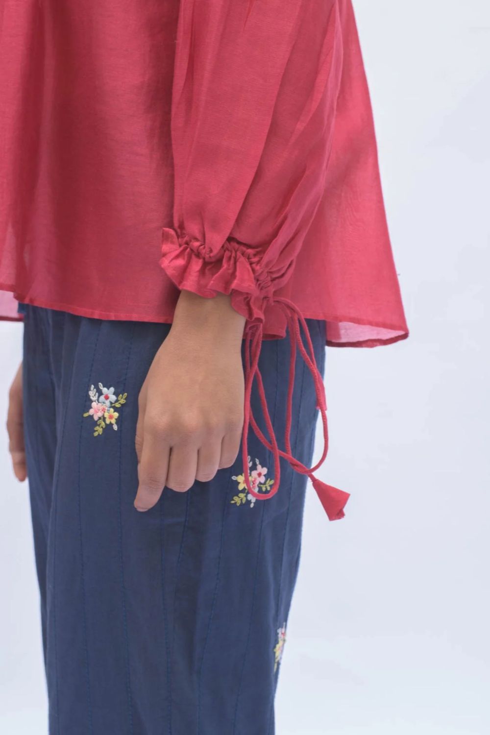 Cotton pants are layered and stitched with bunches of flowers hand-embroidered on them, and hand-block printed cotton turn up detailing. These pants are paired with handloom chanderi with handmade fabric buttons detailing, and neck gathers.It comes paired with a cotton slip top.