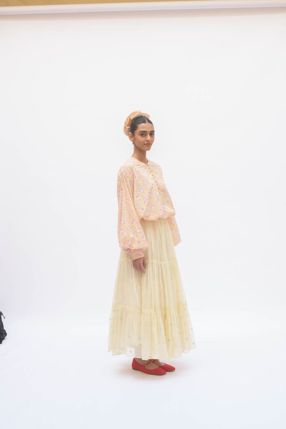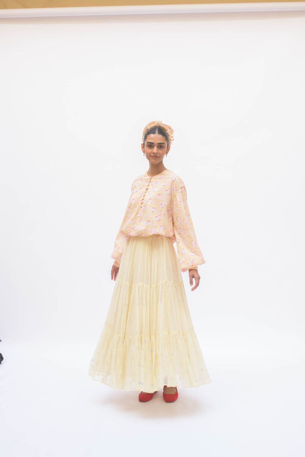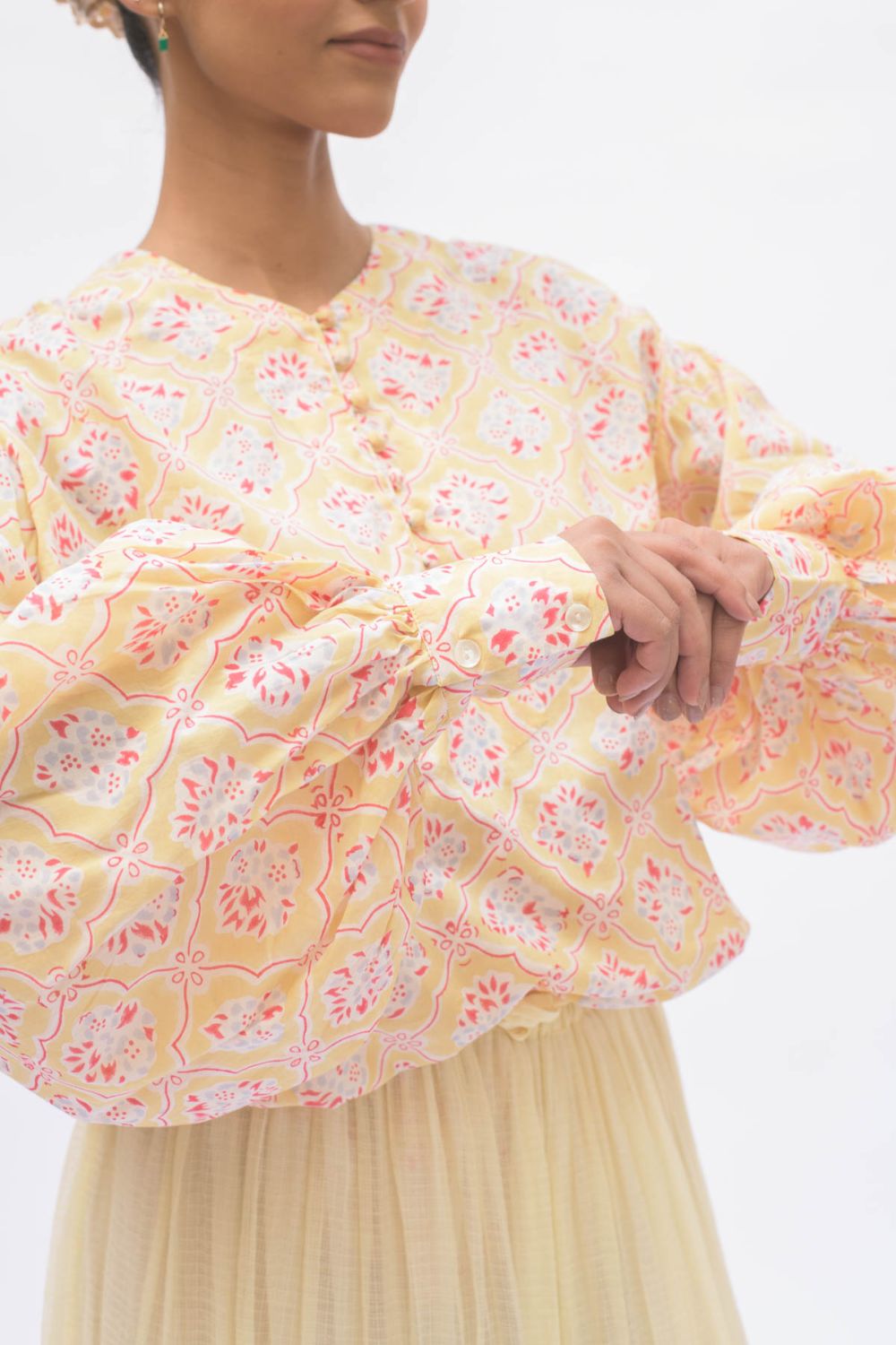 Hand spun cotton shirt in madder red with handmade fabric buttons.It is seen here paired with a skirt in handwoven Kota Doria fabric .