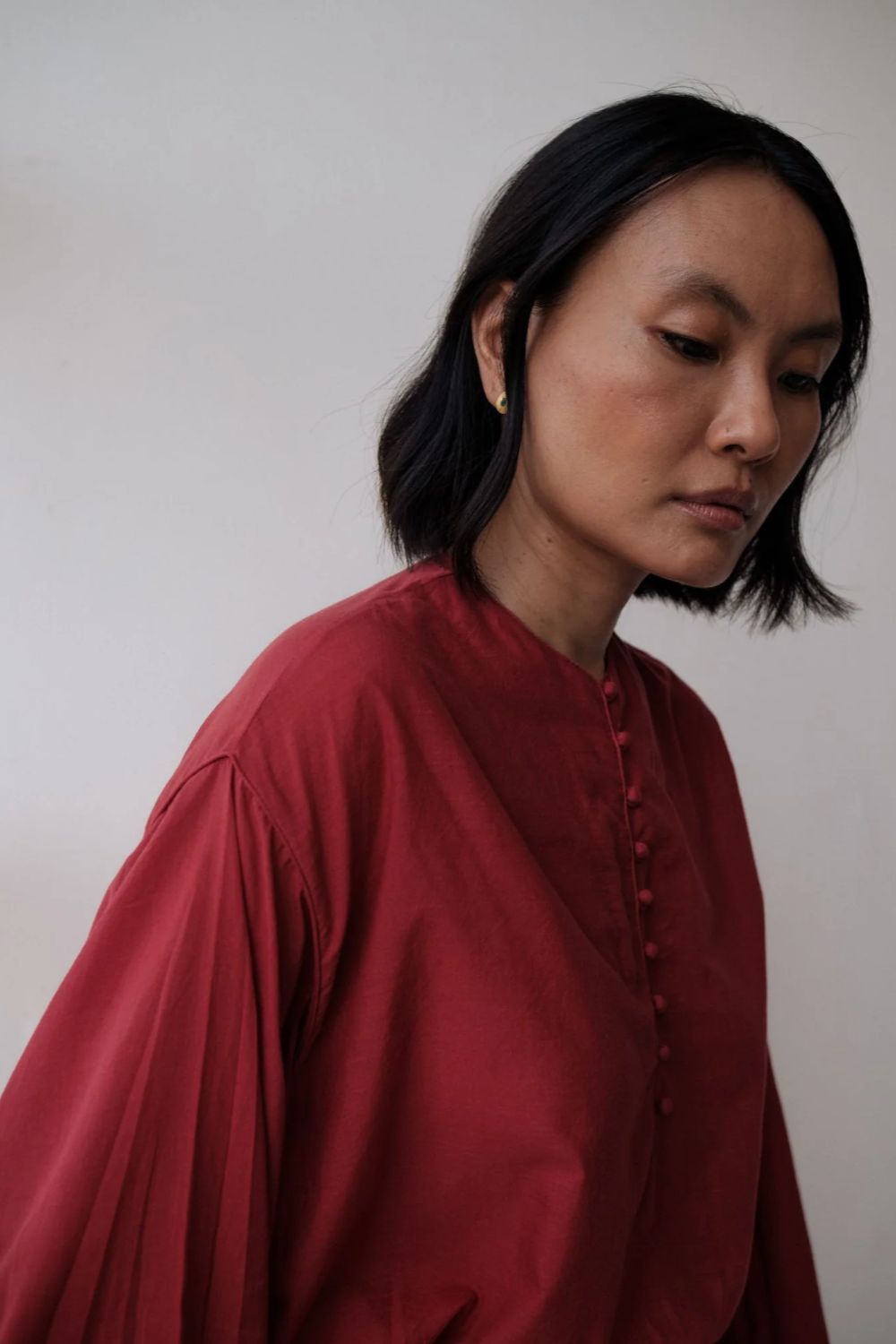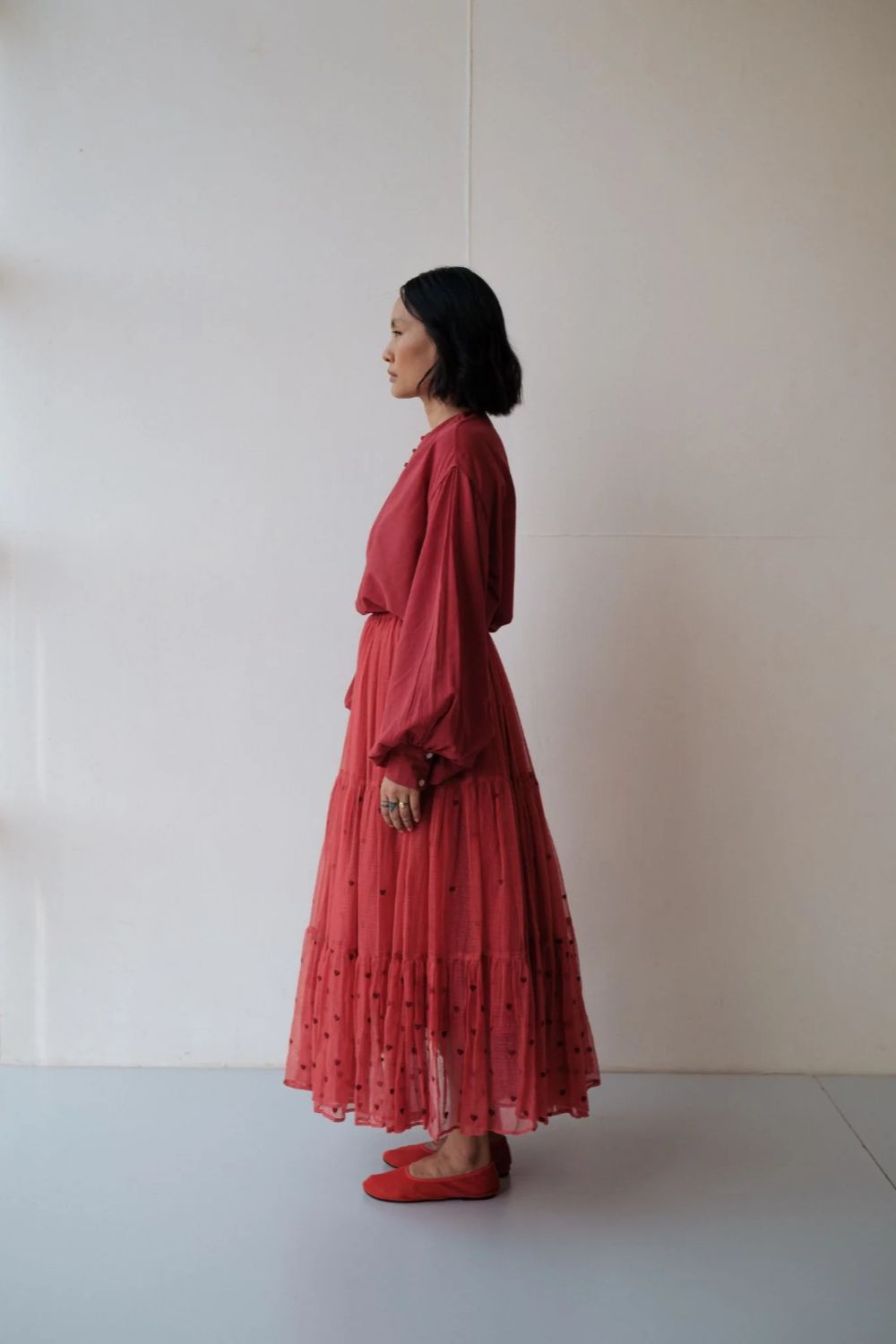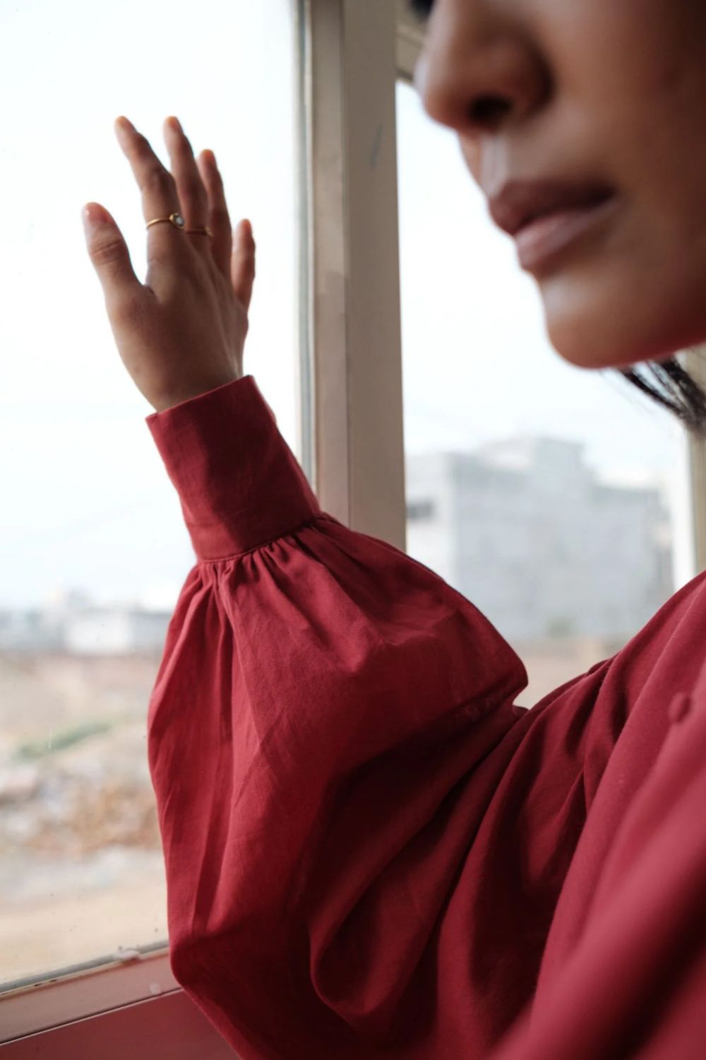 Hand spun cotton shirt in madder red with handmade fabric buttons.It is seen here paired with a skirt in handwoven Kota Doria