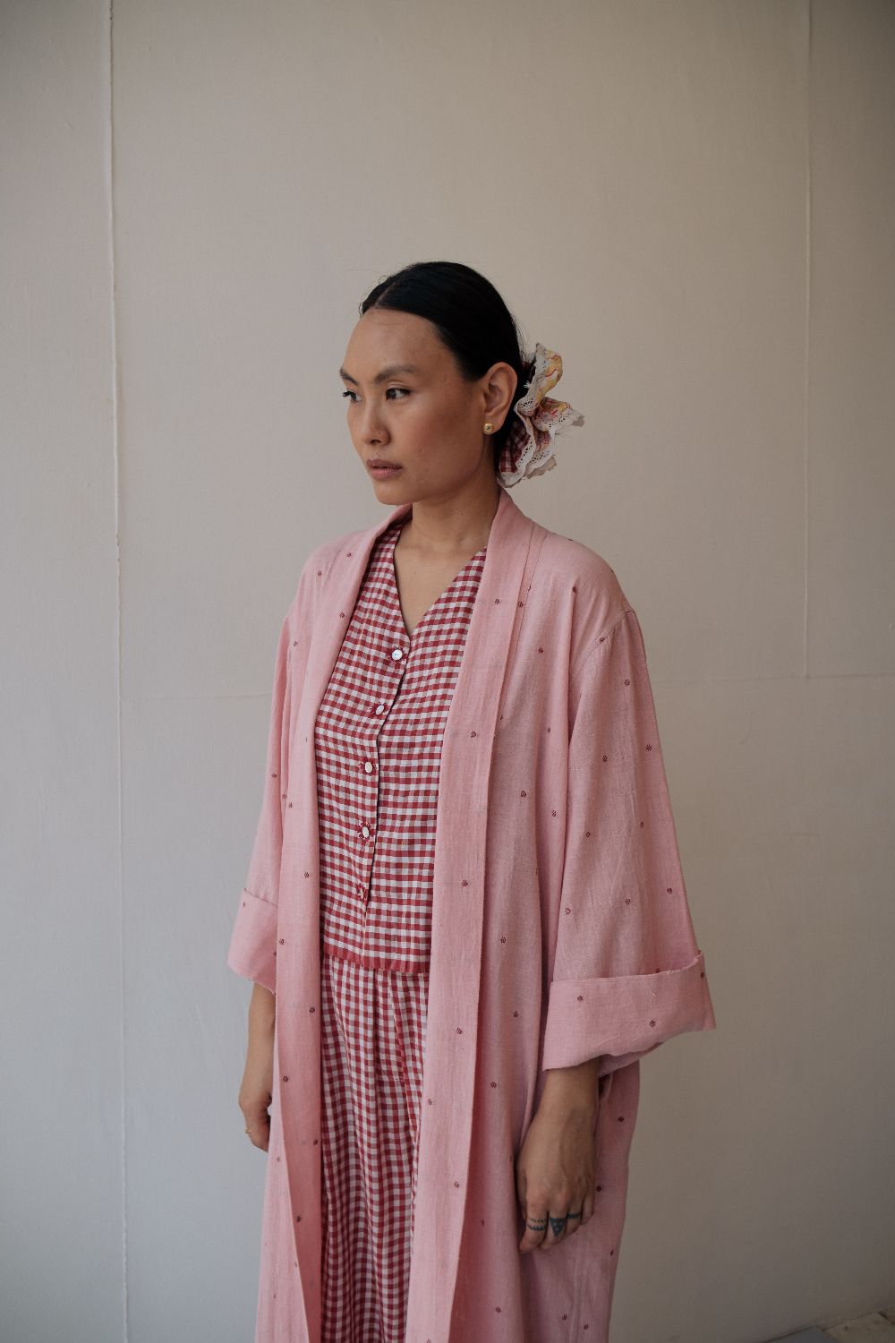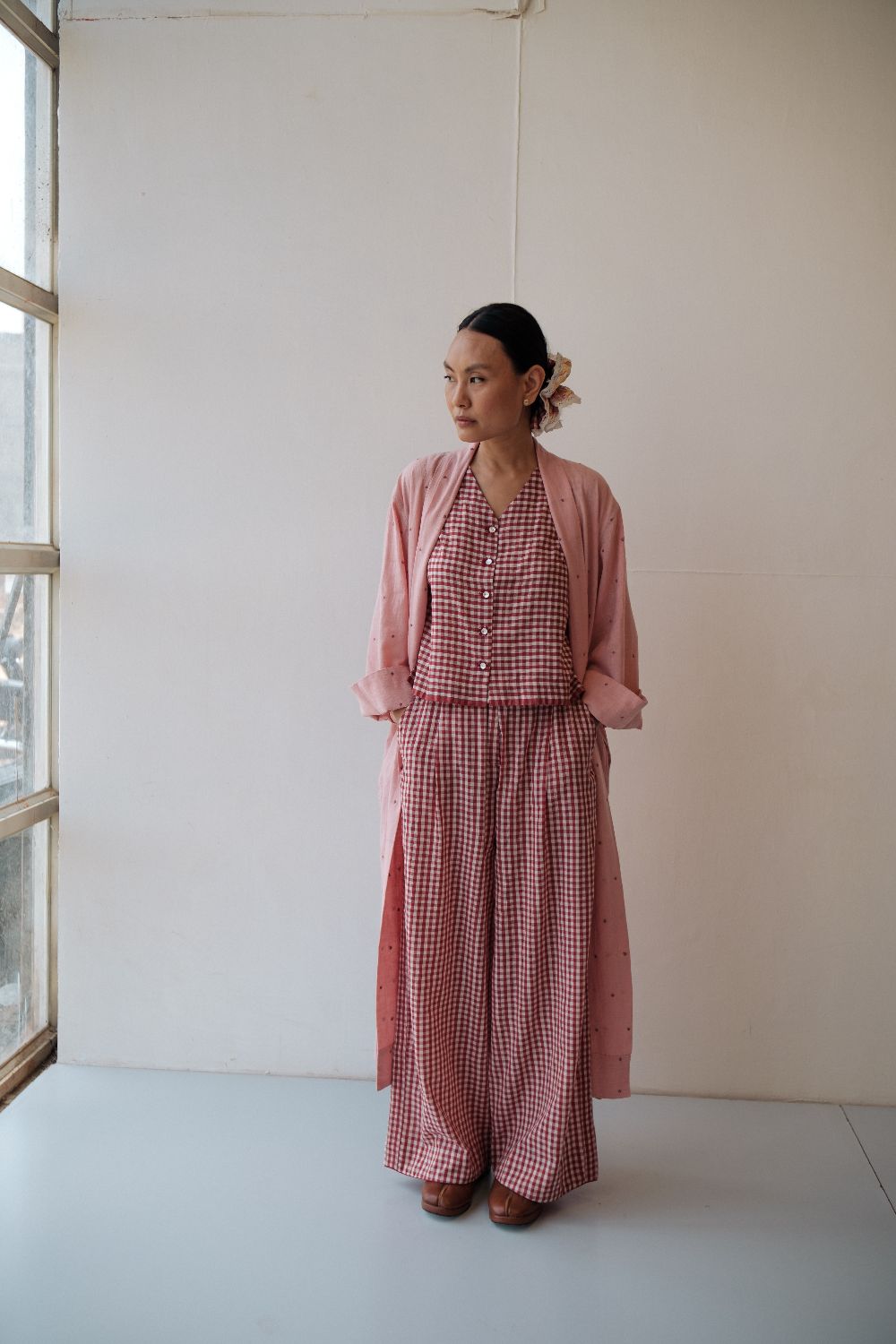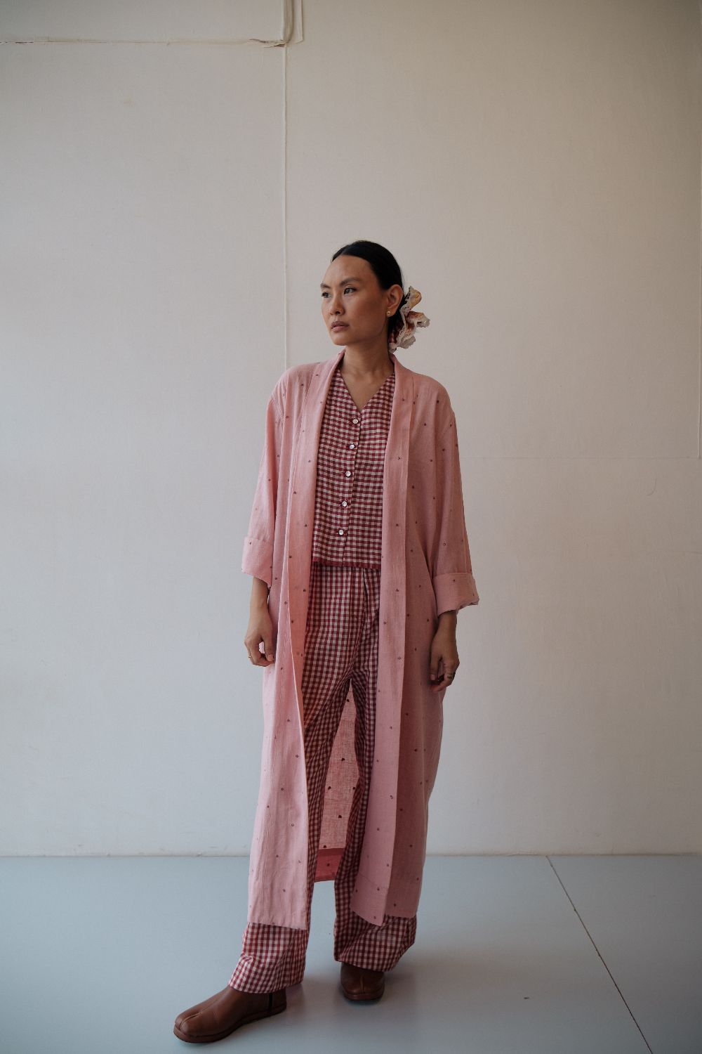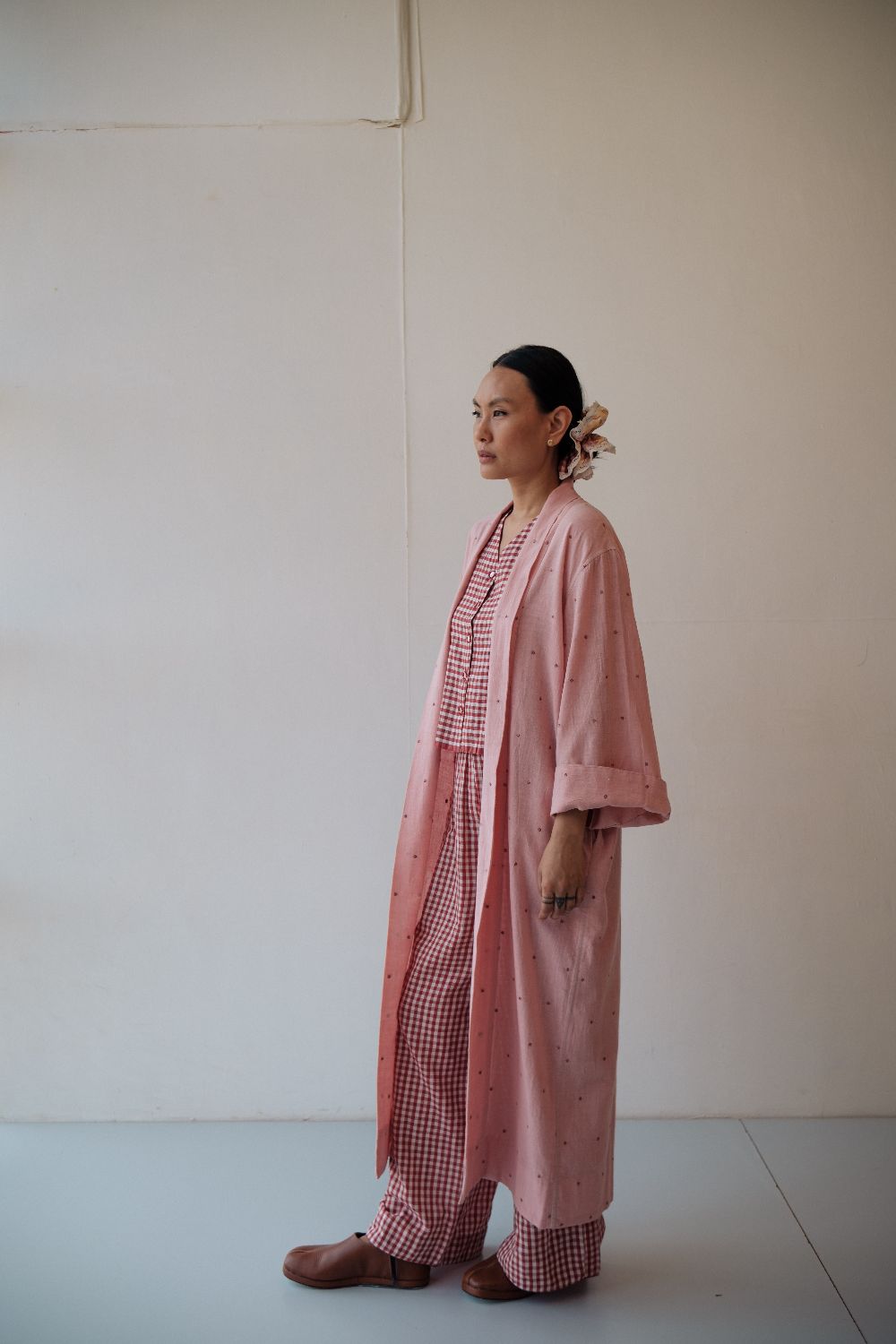 The silhouettes are simple but considered: relaxed cuts, thoughtful details, and fabrics that breathe — from handwoven cottons to delicately finished textiles rooted in Rajasthan’s craft culture. Colours stay close to the earth: muted florals, soft neutrals, and tones that age gracefully rather than fall out of season.