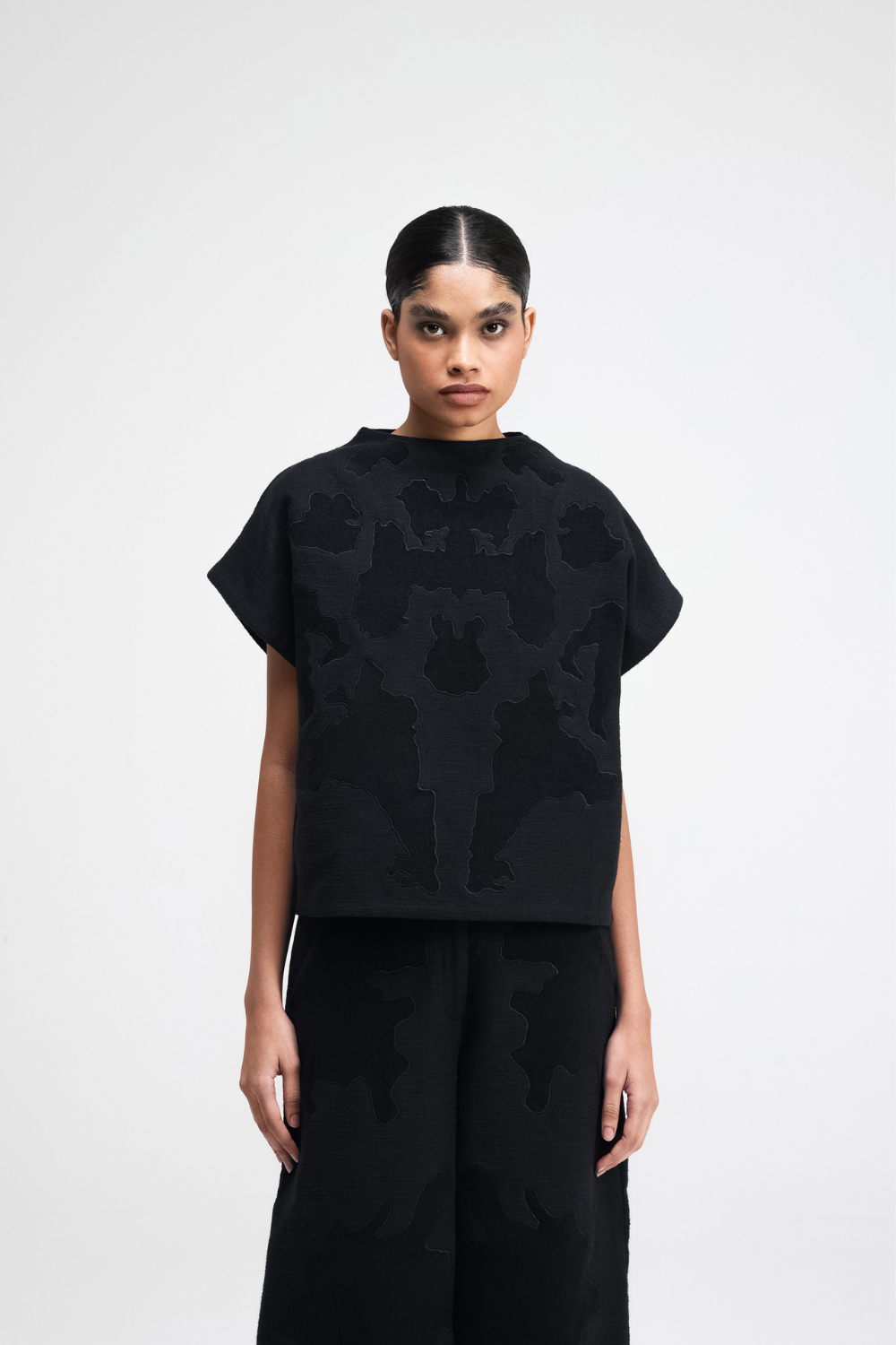 A relaxed-fit chenille top with a high neck and cap sleeves, featuring a concealed zip closure on the shoulder for ease. The front is adorned with intricate applique embroidery, adding a finesse to the piece. Top Comes in Size: ONE (2XS,XS,S), TWO (M,L,XL), THREE (2XL,3XL,4XL)