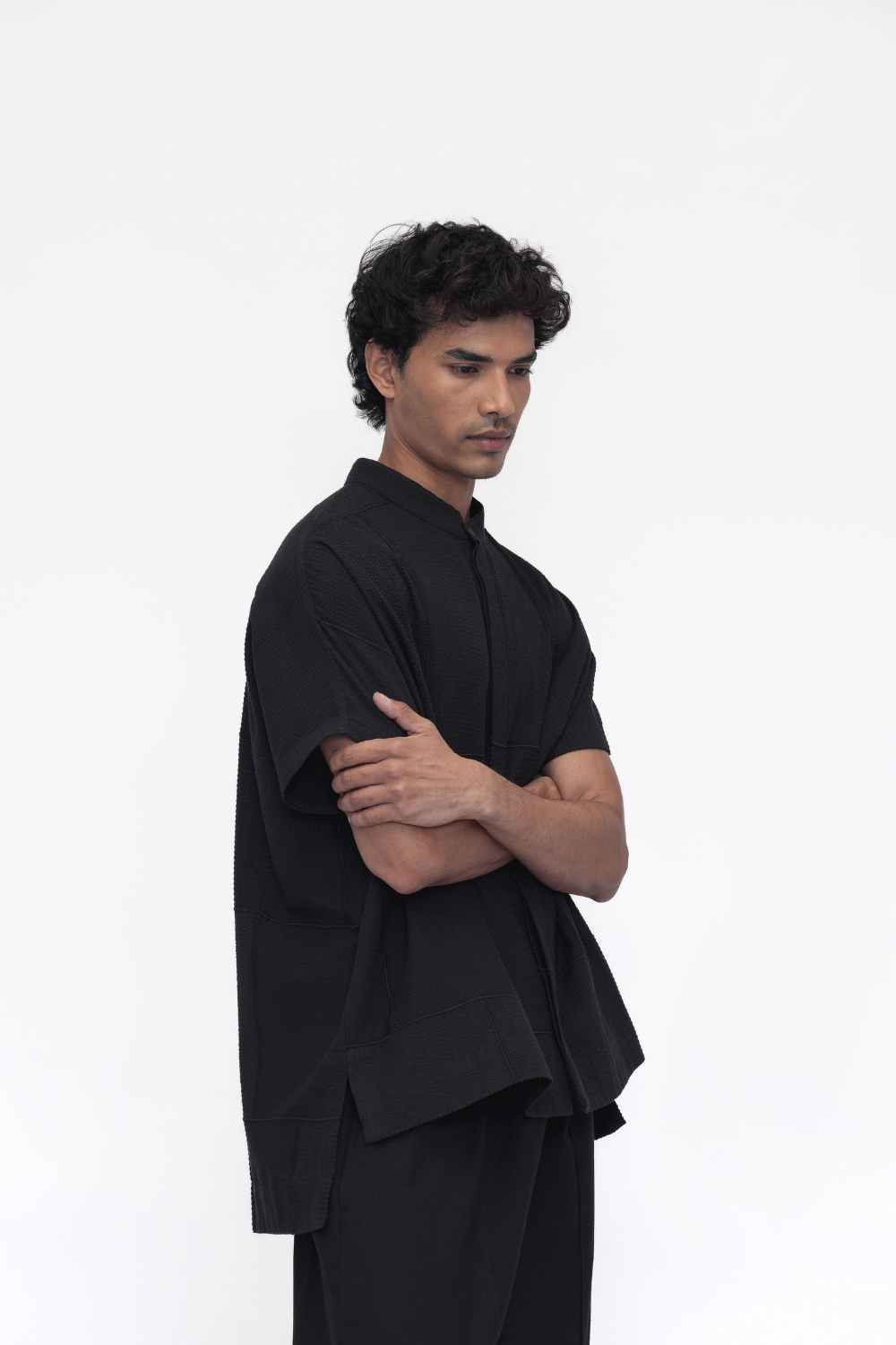 A relaxed unisex shirt in an oversized silhouette, crafted from intricately embroidered patchwork fabric. Features a band collar, drop shoulders, French placket, and side slits—where structure meets texture, and craft meets ease. Shirt Comes in Size: ONE (2XS,XS,S), TWO (M,L,XL), THREE (2XL,3XL,4XL)