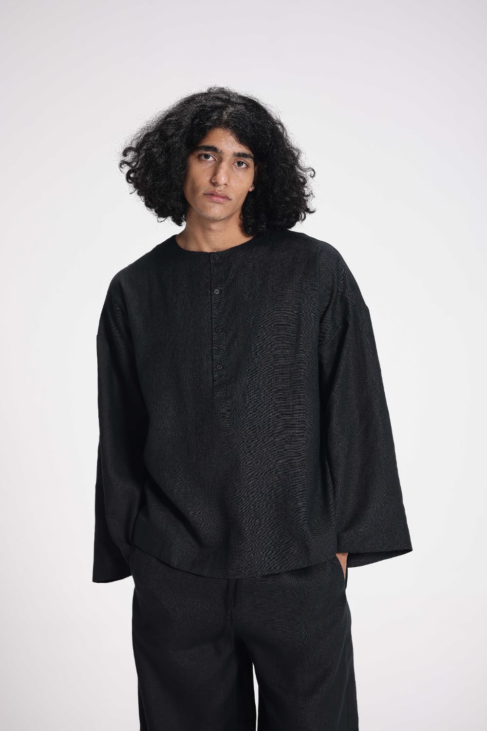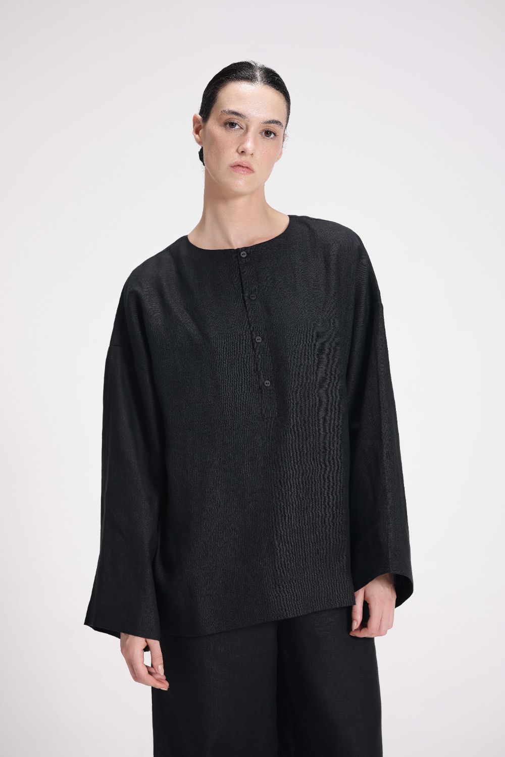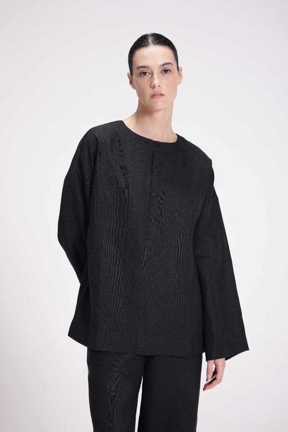 This top redefines simplicity with its minimal design. Crafted in linen, it features a round neck and a partial open placket. Full sleeves enhance its classic design, while the relaxed fit ensures maximum comfort and ease.