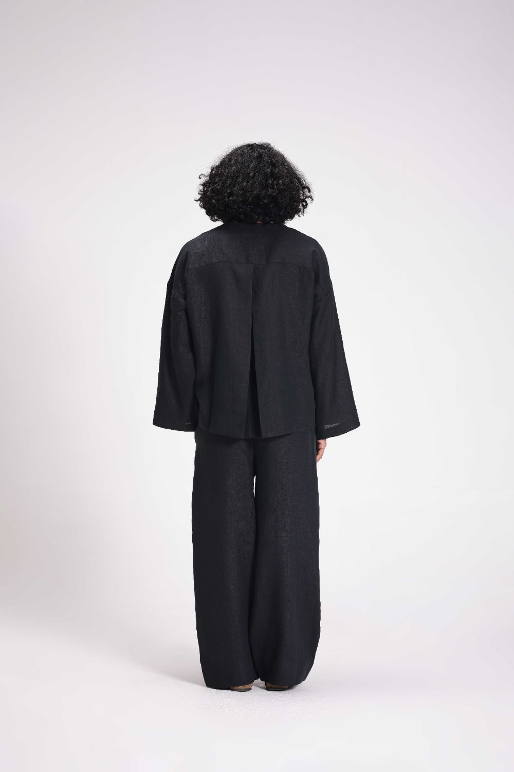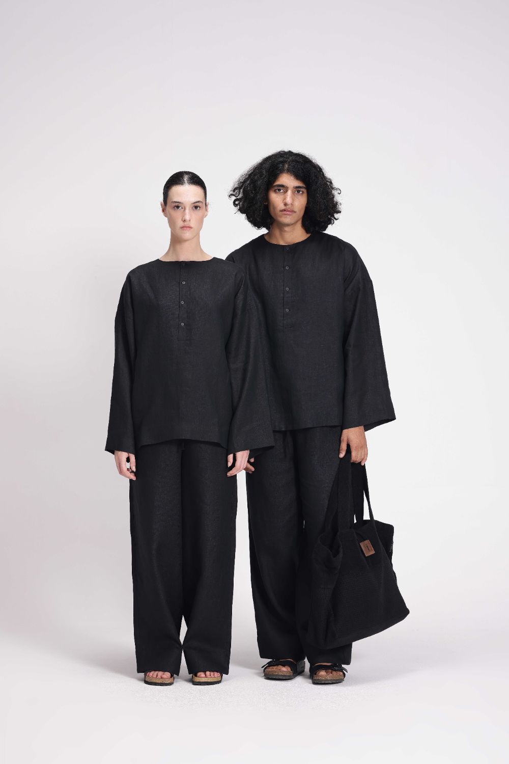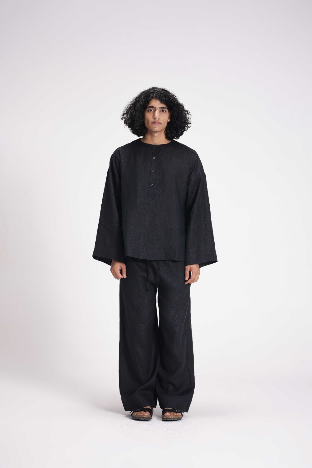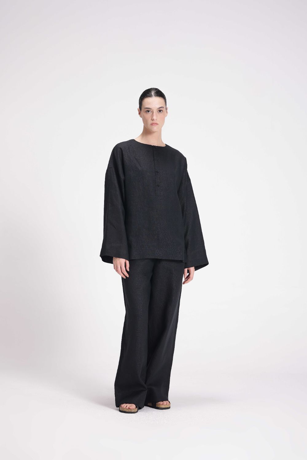 This top redefines simplicity with its minimal design. Crafted in linen, it features a round neck and a partial open placket. Full sleeves enhance its classic design, while the relaxed fit ensures maximum comfort and ease.