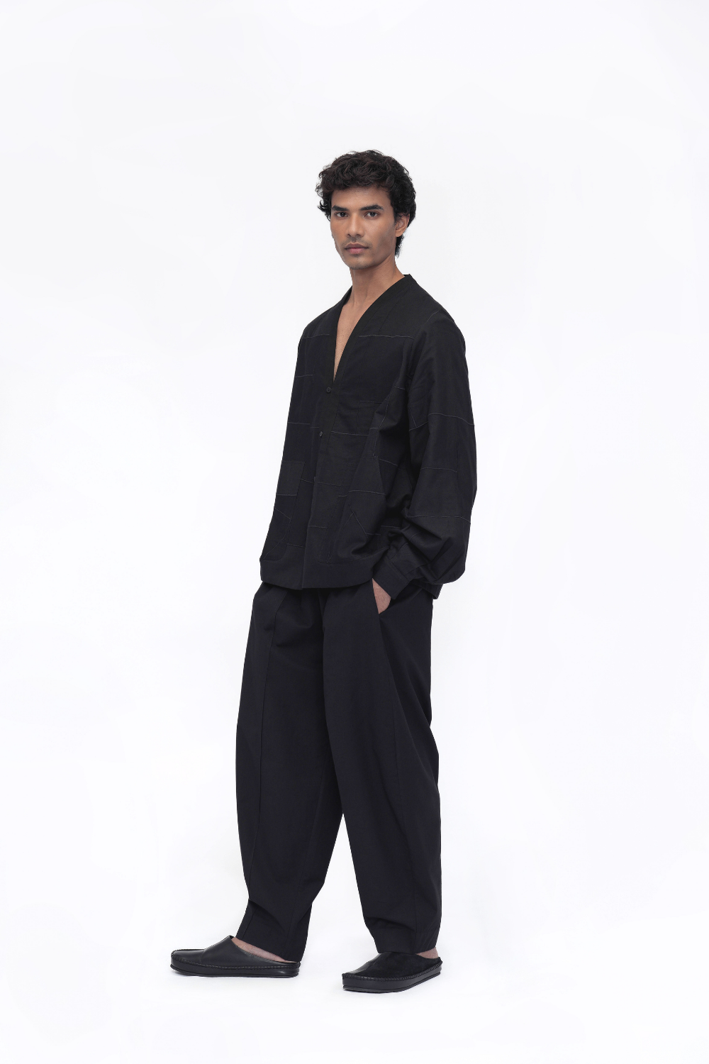 Relaxed-fit unisex overlay crafted from cotton flex, featuring patch pockets, full bishop sleeves with cuffs, and a loop button closure with a binding finish. The patchwork fabric is enhanced with intricate machine embroidery, blending detailed craftsmanship with a unique layered design.