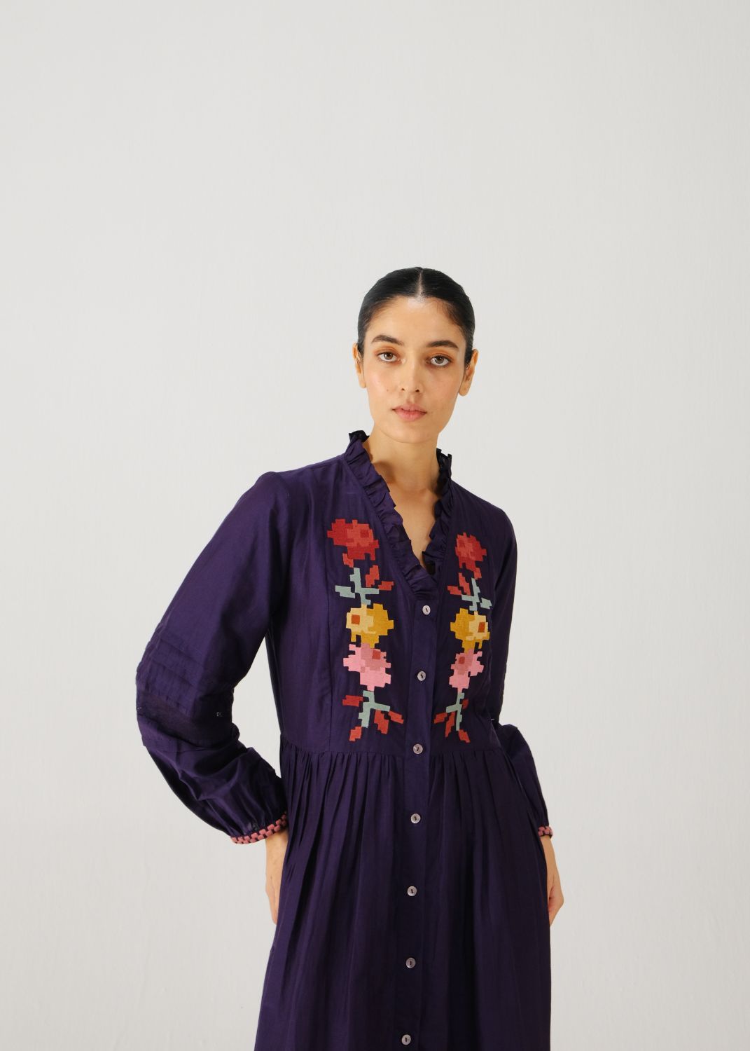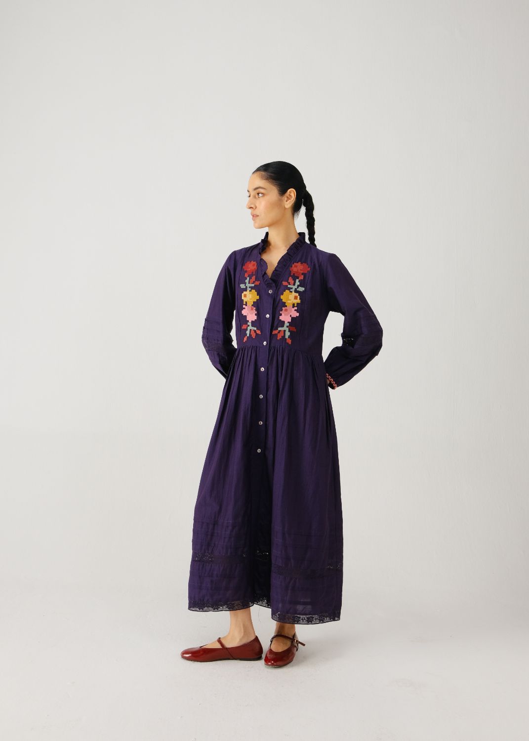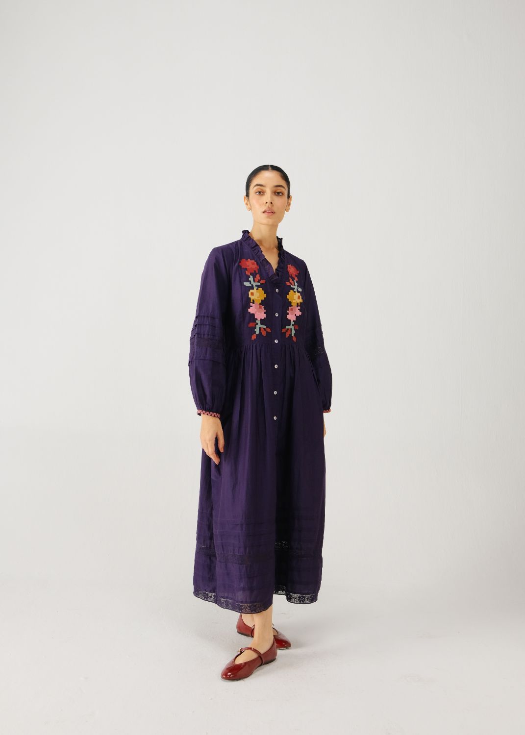 The Jade Dress, crafted in cotton-silk, features pixel embroidery on the front panels, frill collar, delicate embroidered cuffs, and lace along the hem. Pintuck and lace details adorn the sleeves and hem.