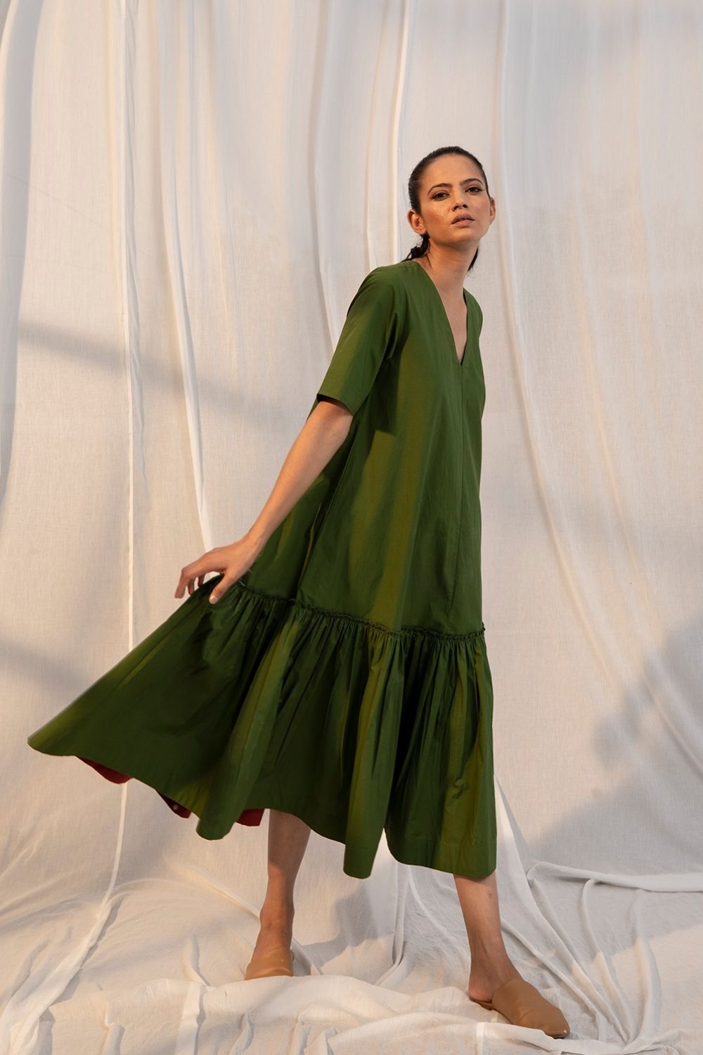 Like ferns growing out of a mossy roof is a thing of beauty to cherish while it lasts, this V-neck flounce dress in fern green featuring red polka detailing on the inside will add a little lush to your wardrobe. No lining.