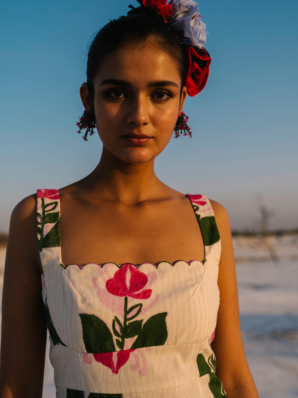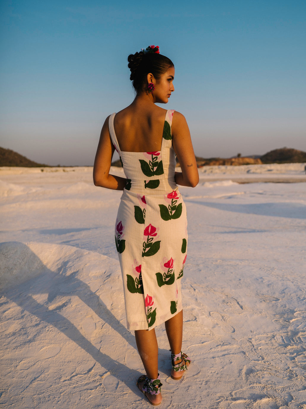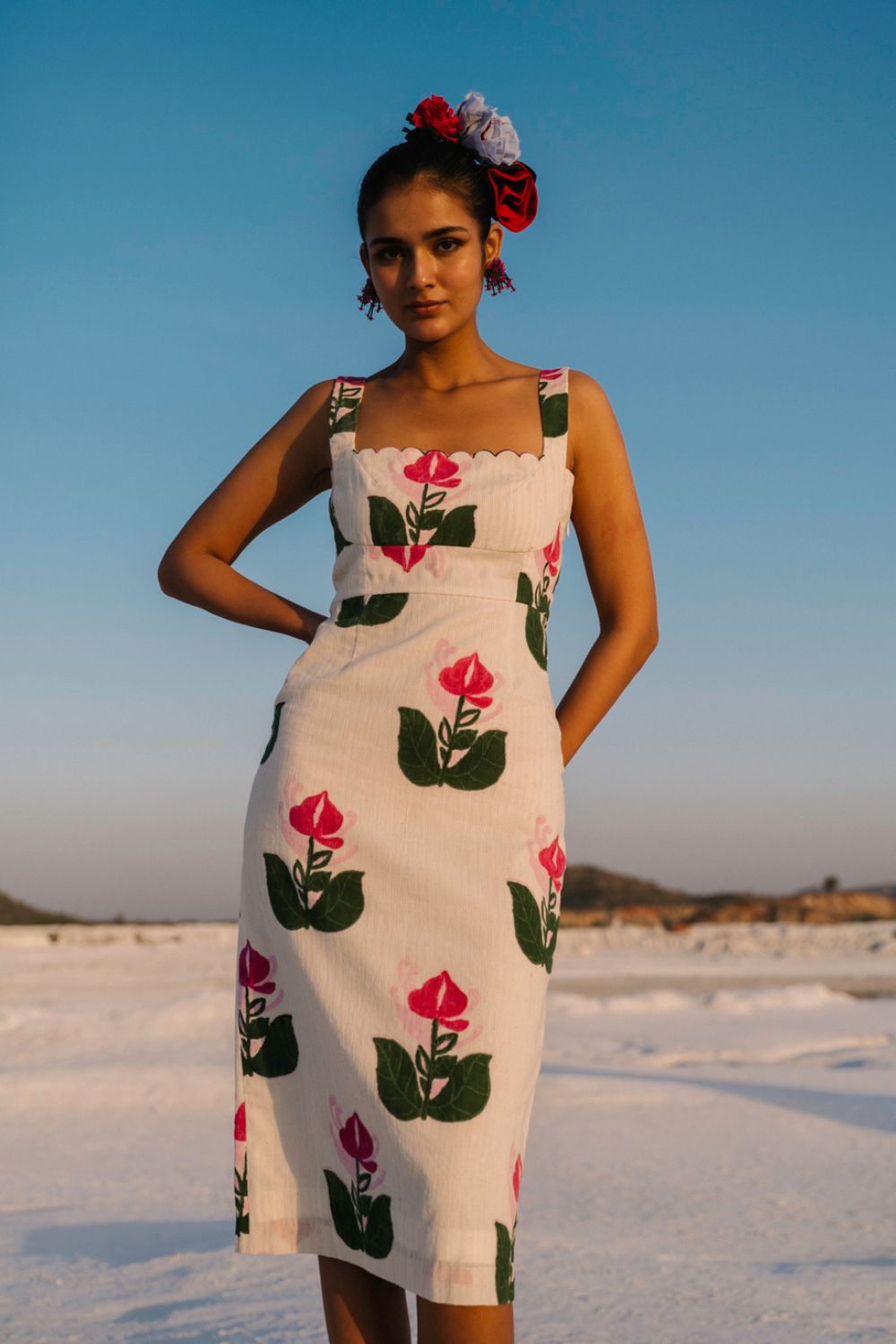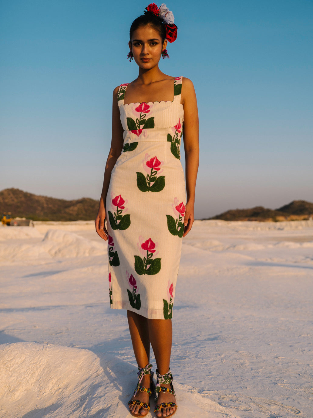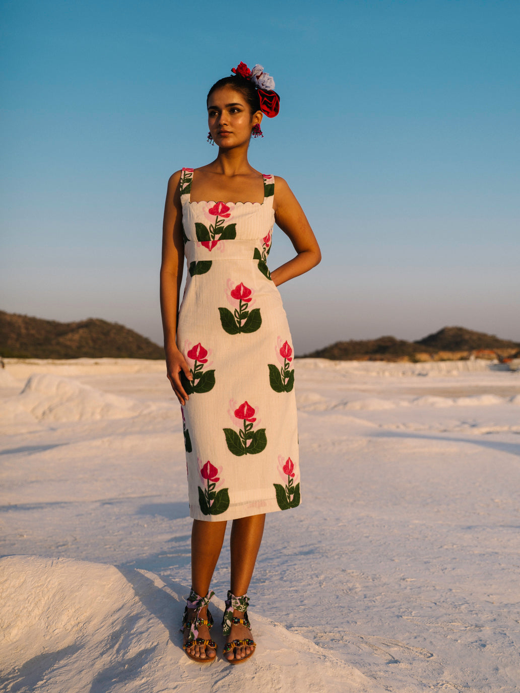 This elegant sheath dress has a flattering scalloped embroidered neckline and a classic pencil silhouette. It is crafted from handwoven cotton and hand block printed in JODI blooms. A special mention for this handcrafted fabric, it feels lovely on the skin and has a malleable texture.