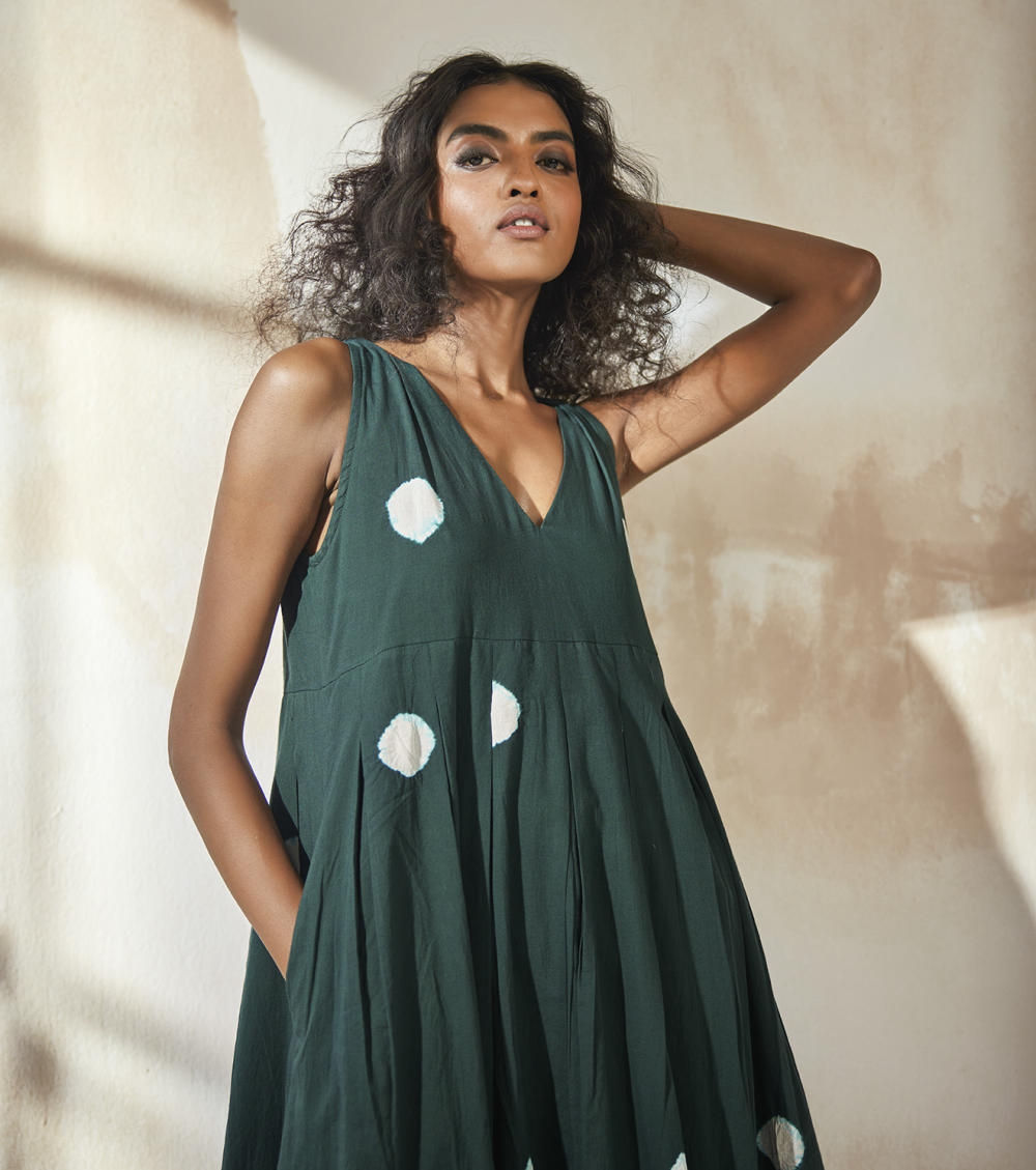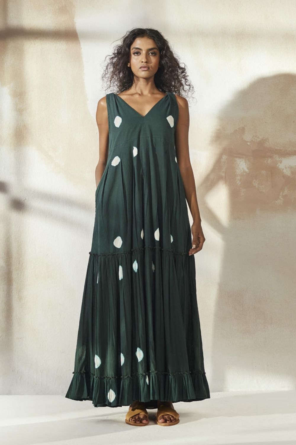 A breezy forest green shibori dyed tiered maxi dress. It comes with a frill detailing, box pleats and side seam pockets.