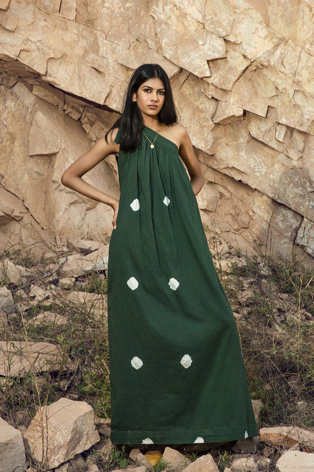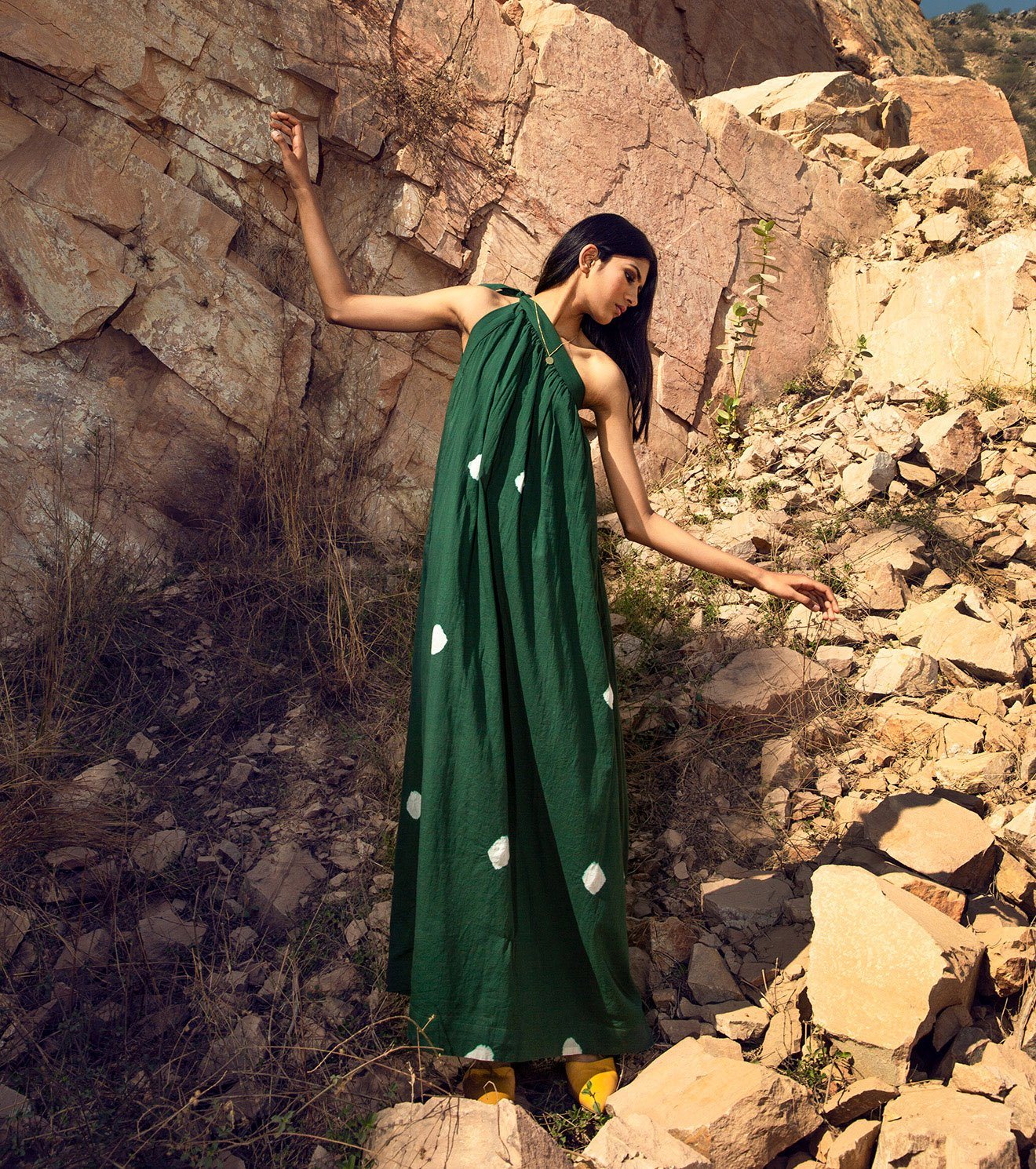 Our escapade will be the last of its kind. Shibori-dyed gathered tie-up long dress in deep green. Comes with an attached lining and a tie-up at one shoulder.
