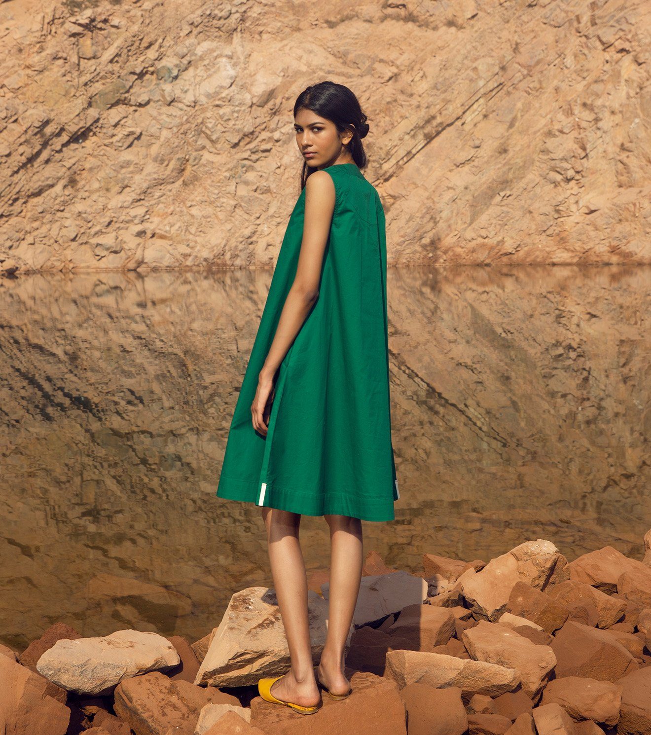 Harmony touches the soul, but you can't sing it alone. A sleeveless shift dress in emerald green made with Poplin. Features a V-neckline and knee-length hemline.