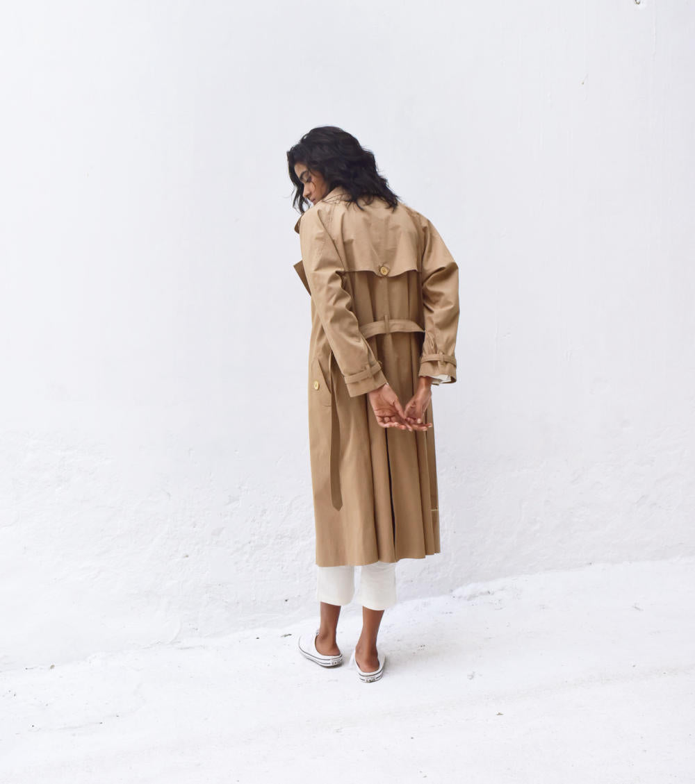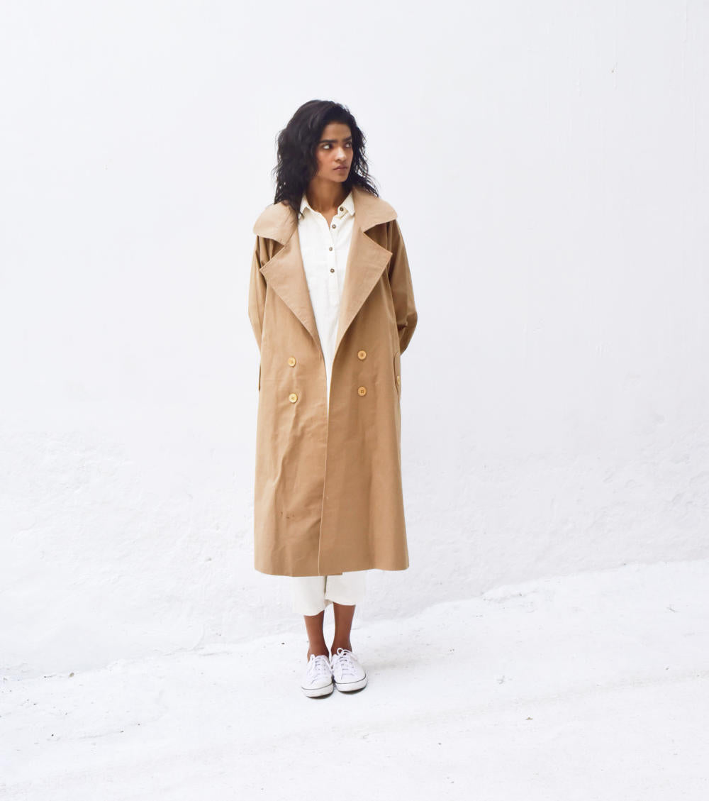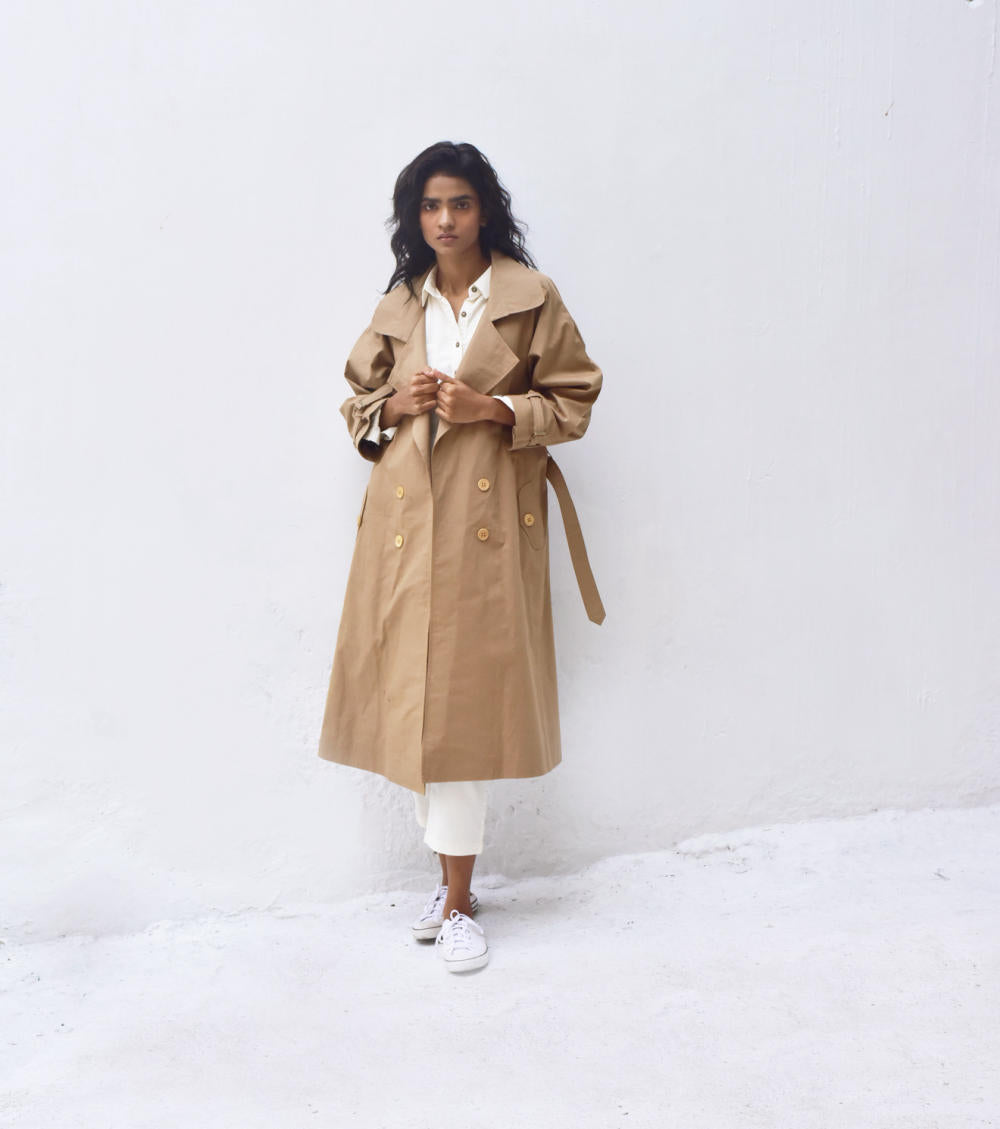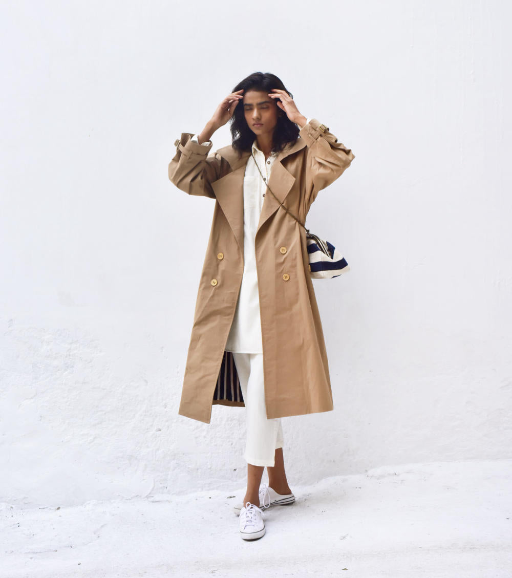 A double-breasted trench coat with buttoned epaulettes, bracelet cuffs, an adjustable belt, button pockets in the front. A back buttoned yoke with a back slit completes the look. It comes with a black and white striped cotton fabric detailing inside as the lining.
