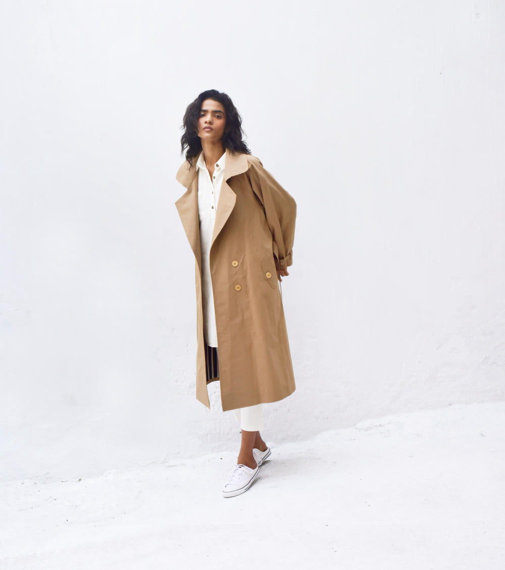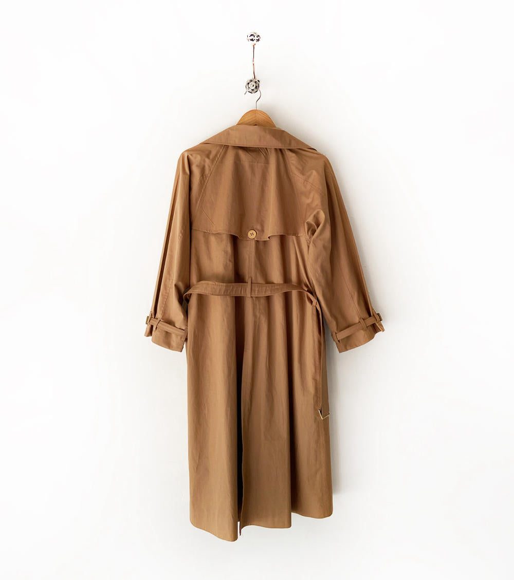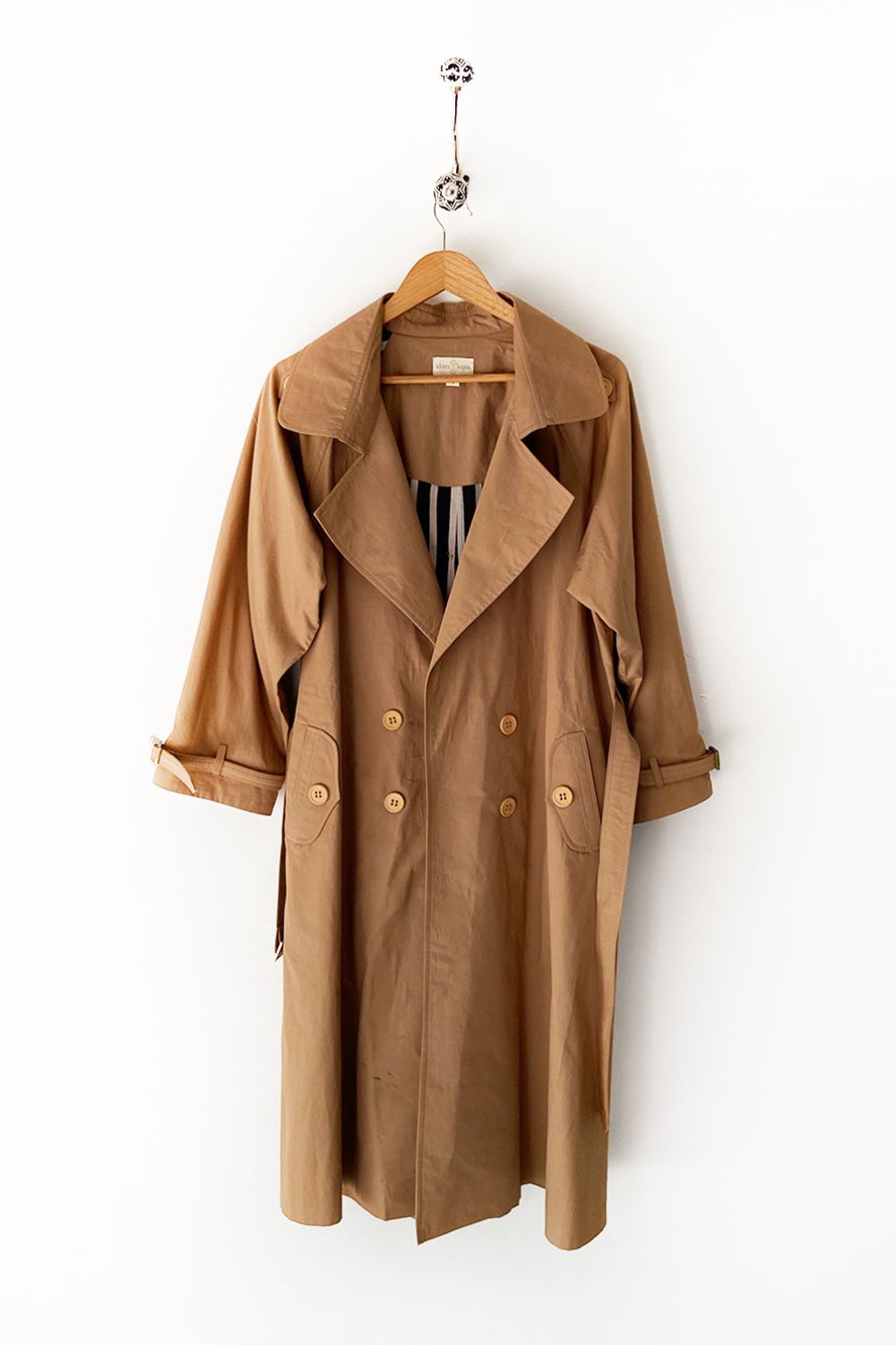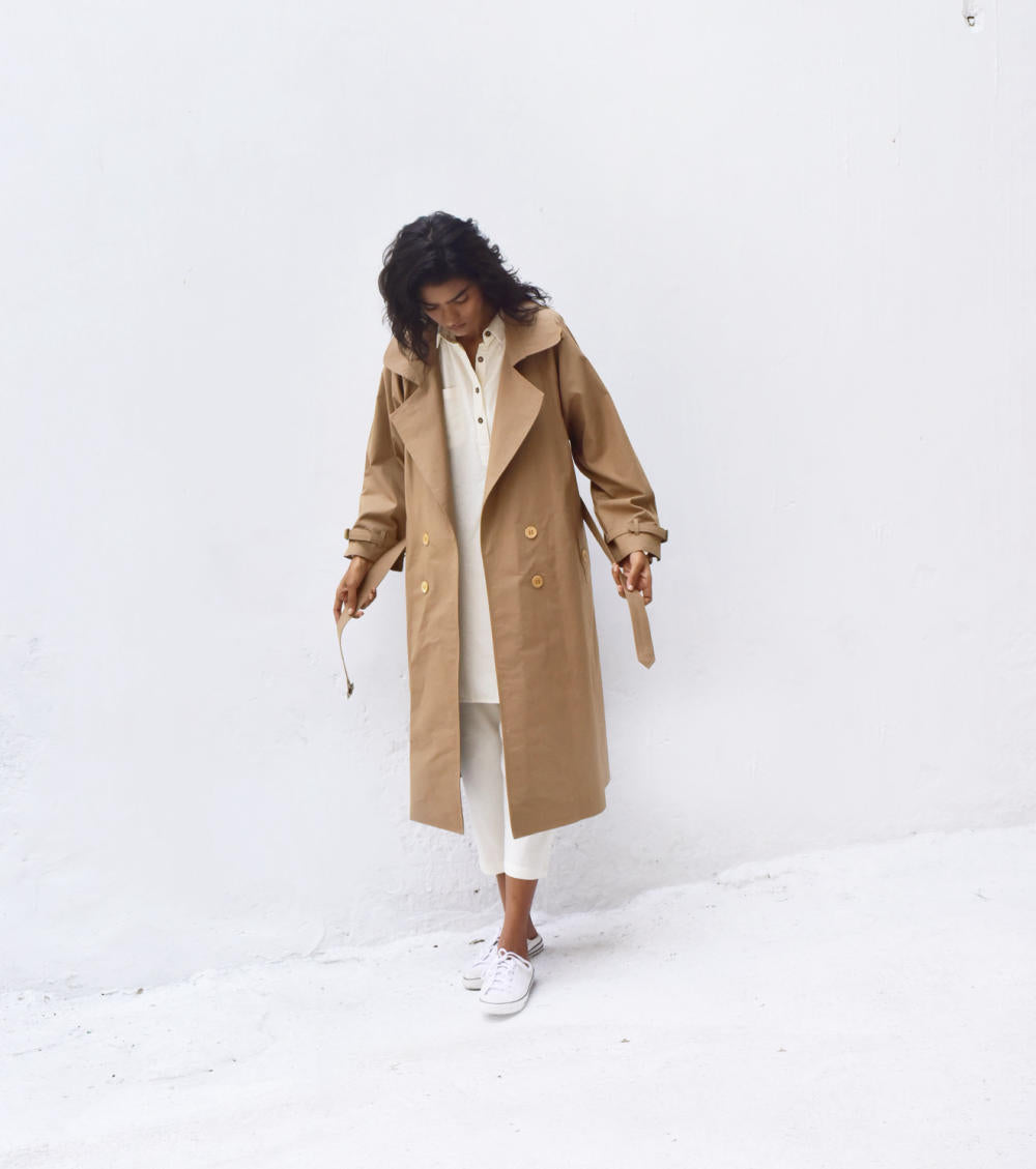 A double-breasted trench coat with buttoned epaulettes, bracelet cuffs, an adjustable belt, button pockets in the front. A back buttoned yoke with a back slit completes the look. It comes with a black and white striped cotton fabric detailing inside as the lining.