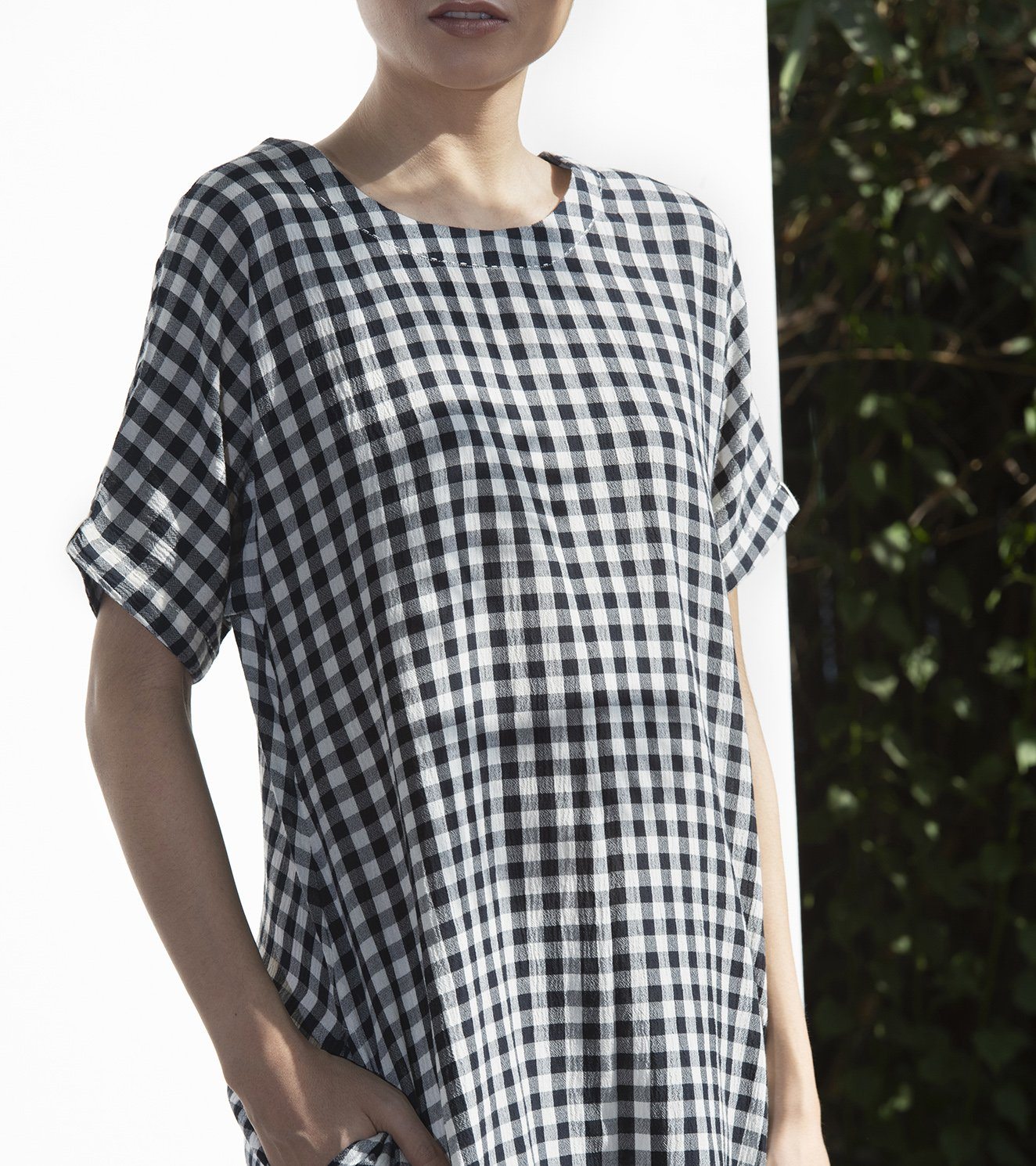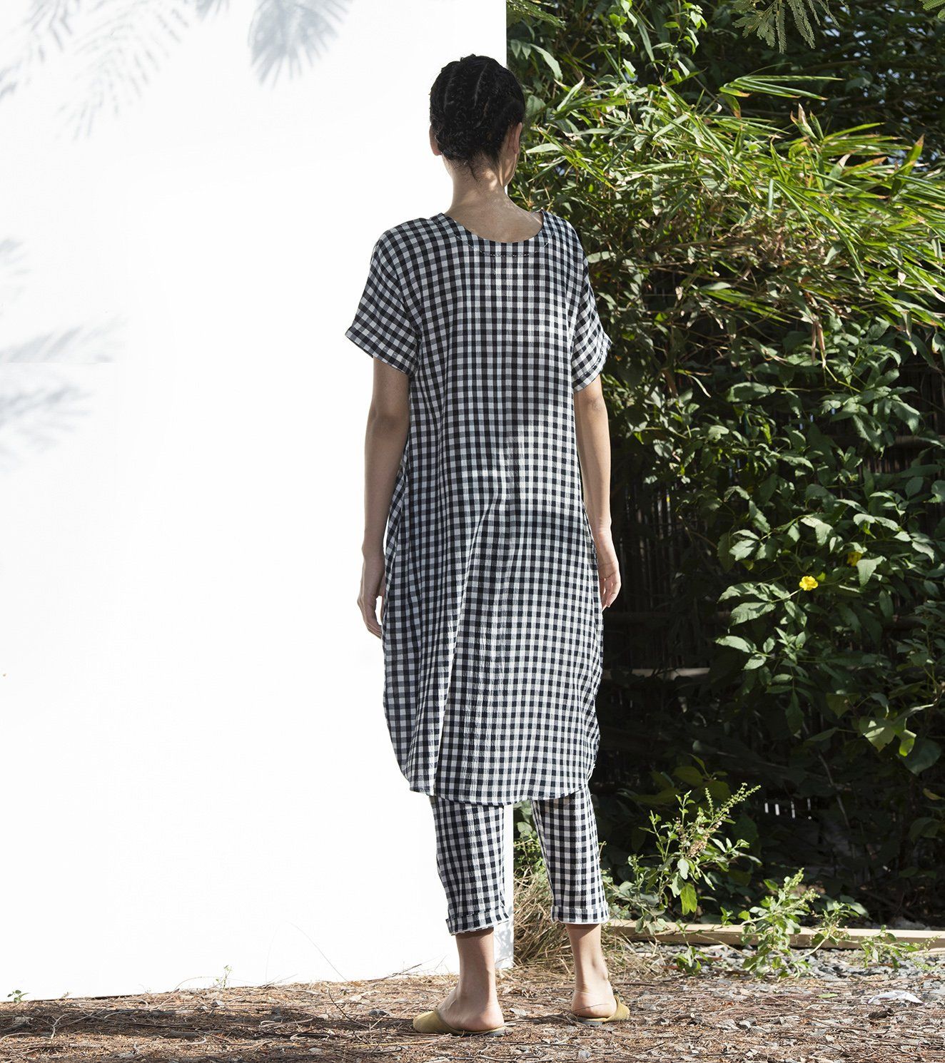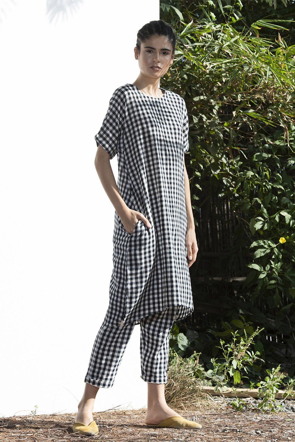Black and white checkered long tunic with side pockets. Comes with a matching pair of ankle length pants with a half elasticated waist, front zipper, button closure, and pockets.