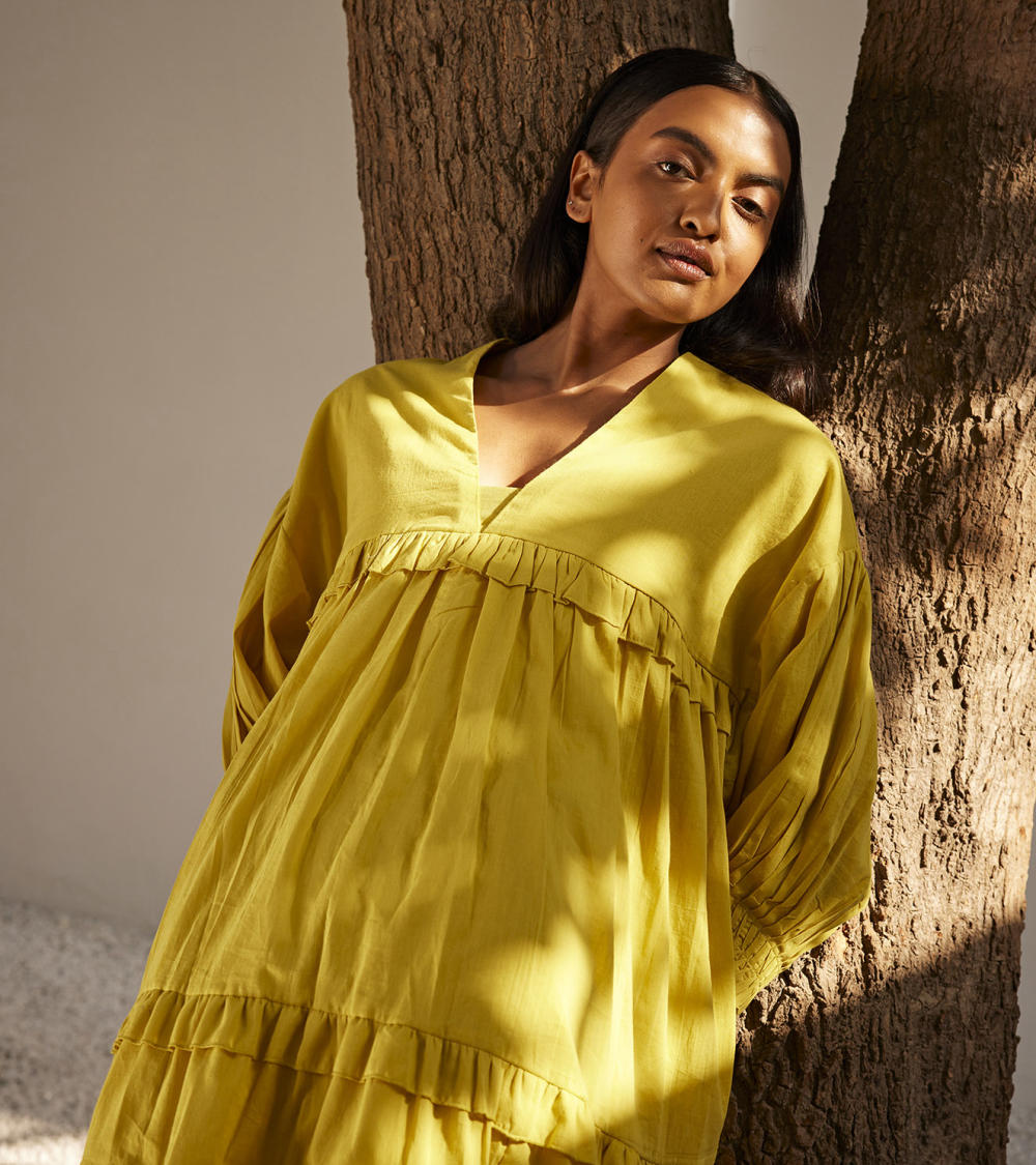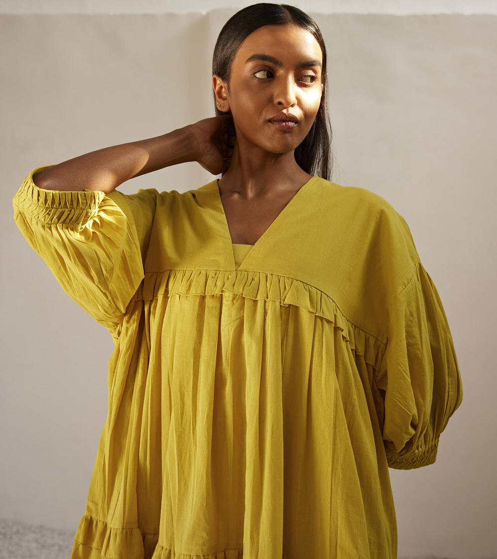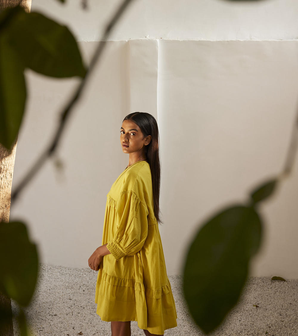 A lime yellow mulmul short dress with tiered ruffle detailing. The puff sleeves has pin tucks detailing that completes the look.