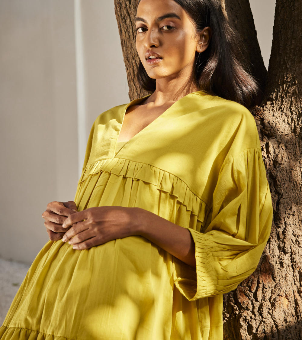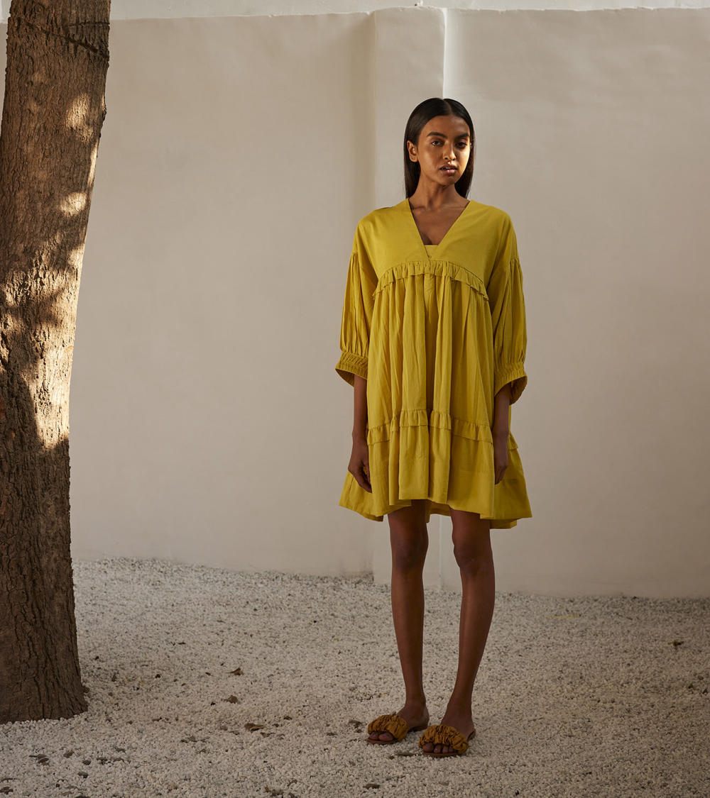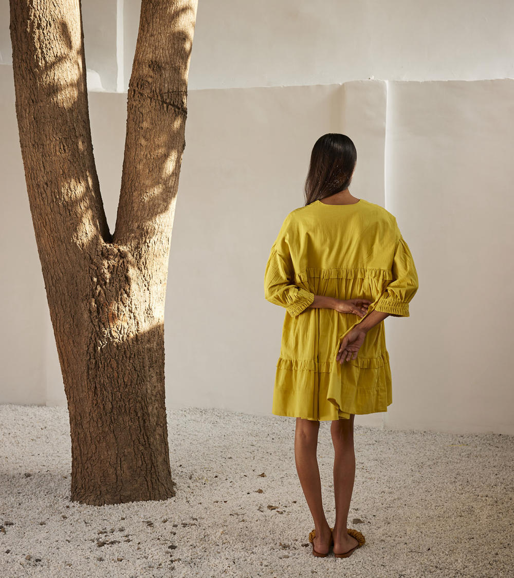 A lime yellow mulmul short dress with tiered ruffle detailing. The puff sleeves has pin tucks detailing that completes the look.