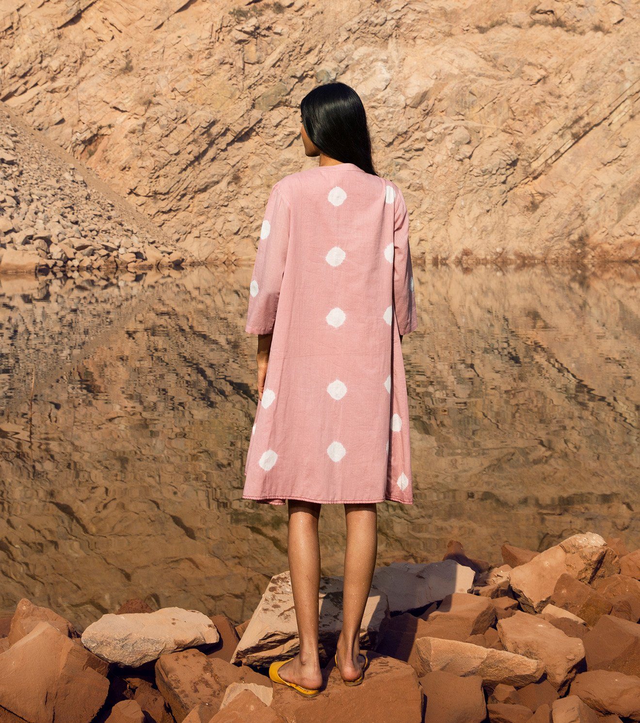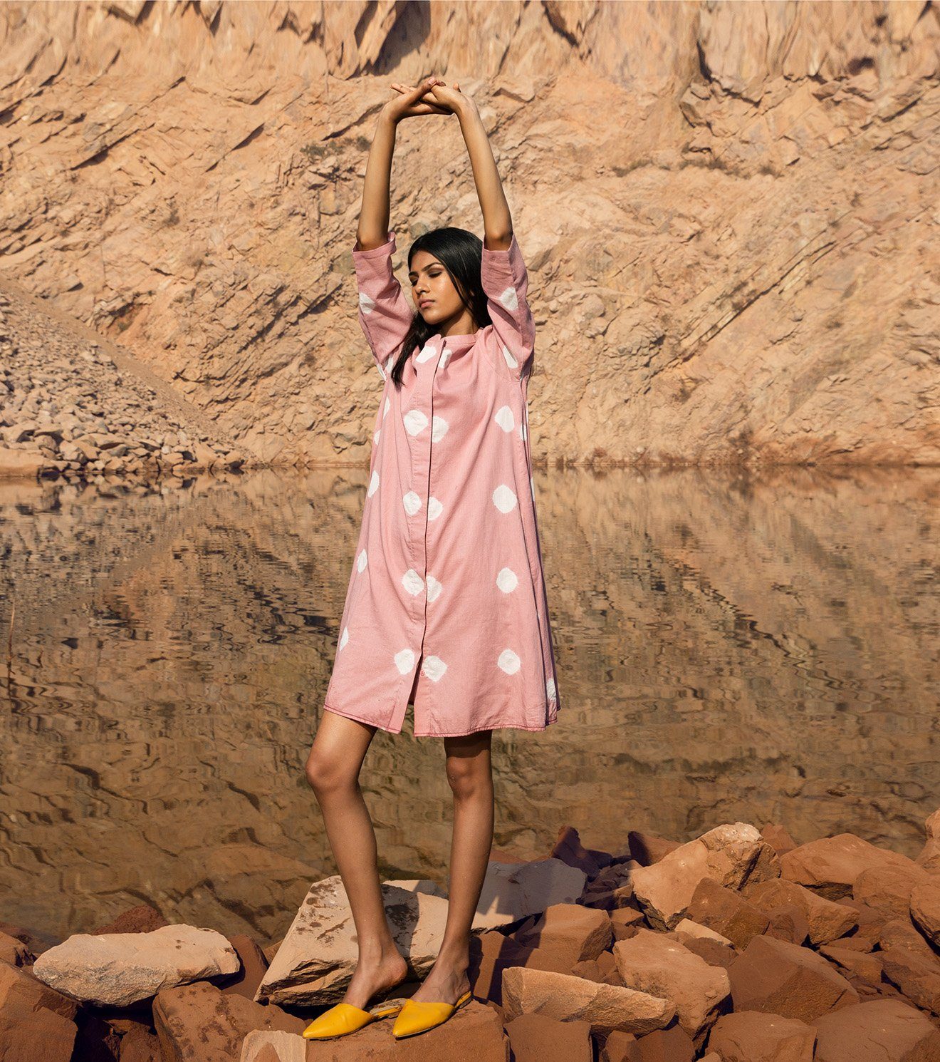 The universe may be full of mysteries, but this cosmic connection is meant to be. Shibori-dyed jacket dress in mulmul with a button down front closure, invisible placket and front slash pockets. Comes with an attached lining.
