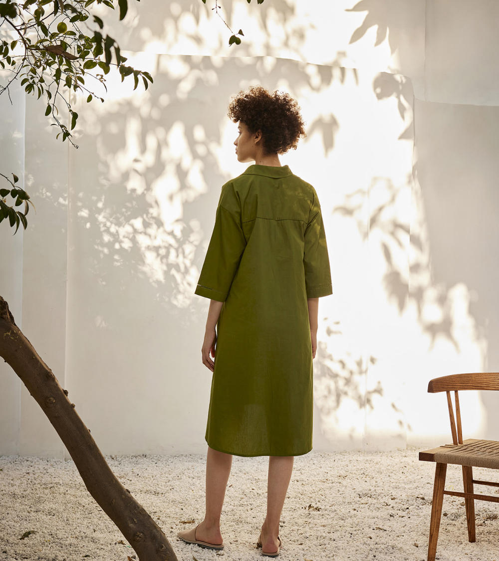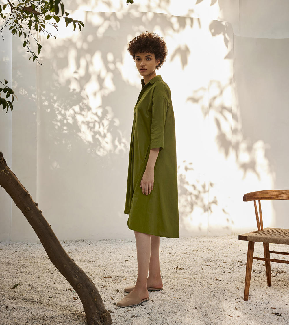 A sap green cotton poplin dress with box pleat at the center front, hand knot embroidery at the front, stitch embroidery at the sleeves and the across back.