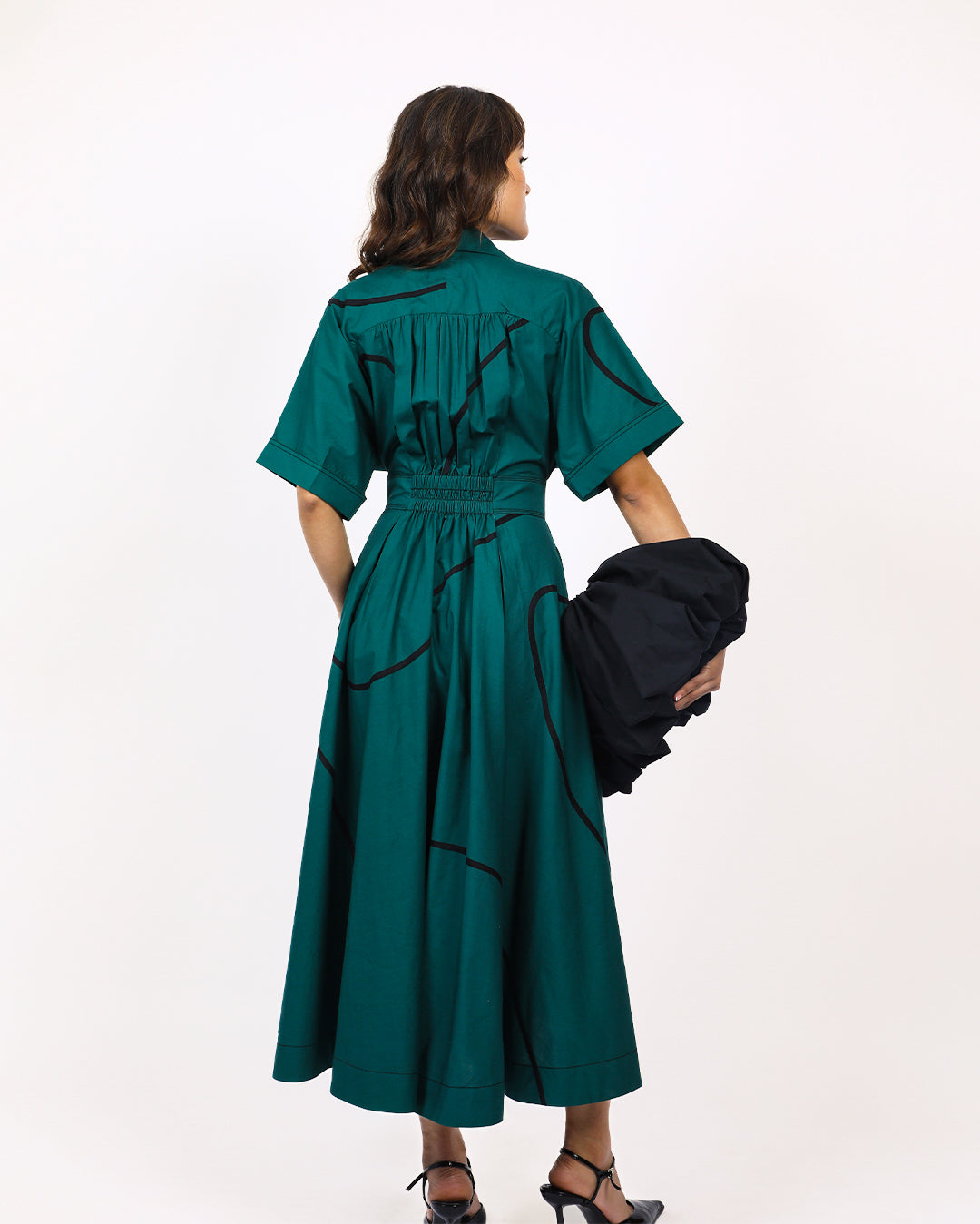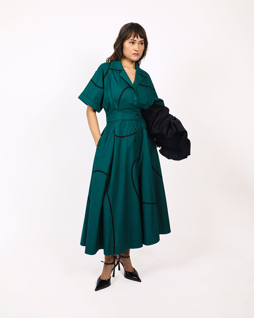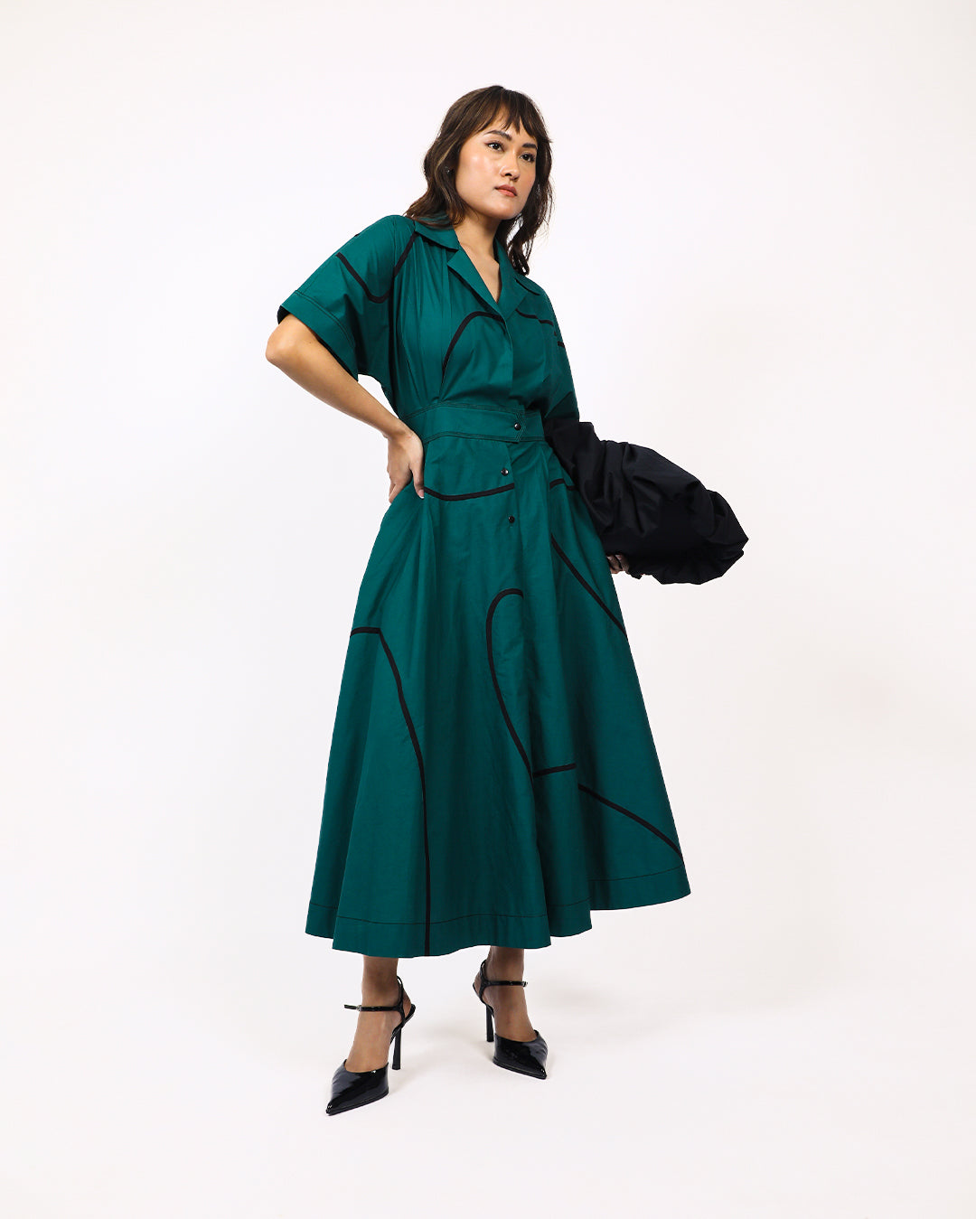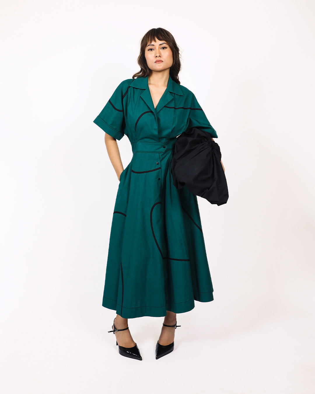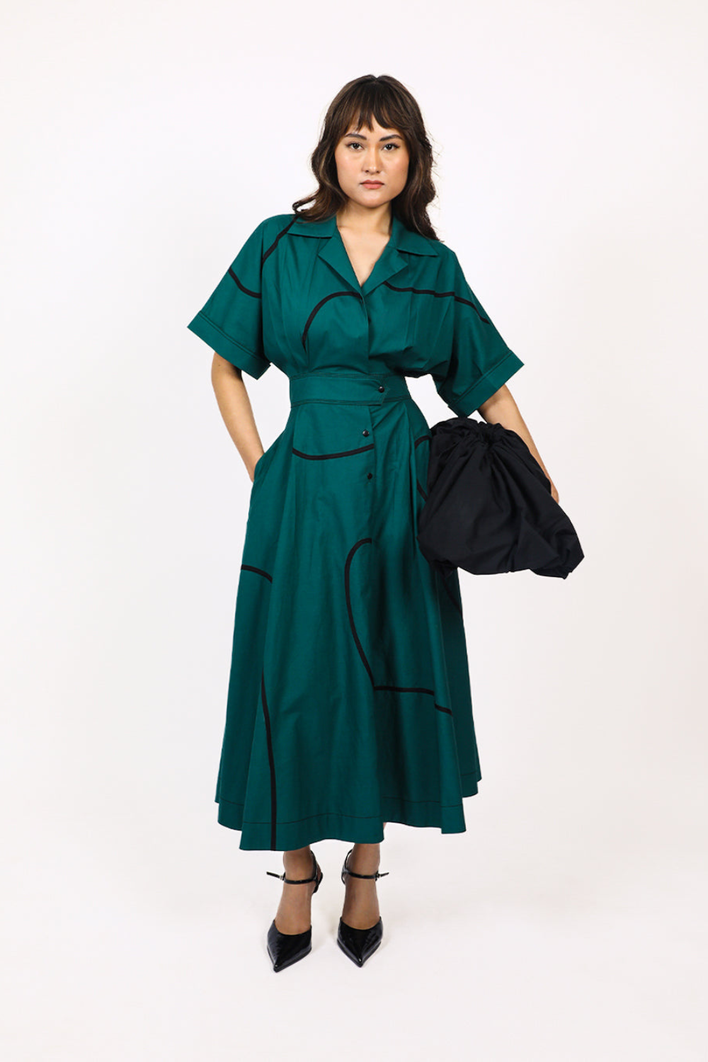 Made of 100% cotton fabric, this dress features contrast tape stems. The short kimono cuffed sleeves with contrast top stitching adds visual interest and detail. The back features curved yoke at bodice and an elasticated section at waist for a flexible and comfortable fit, and a cinched waistband accentuates the shape of the dress. The front half opening with button closure provide easy wearability, complementing the flowy circular skirt. Model wear size S model height is 5'8 garment length is 50"