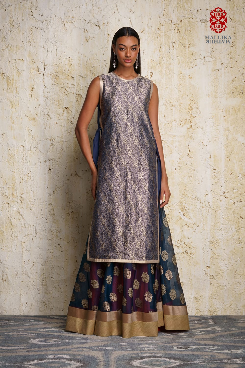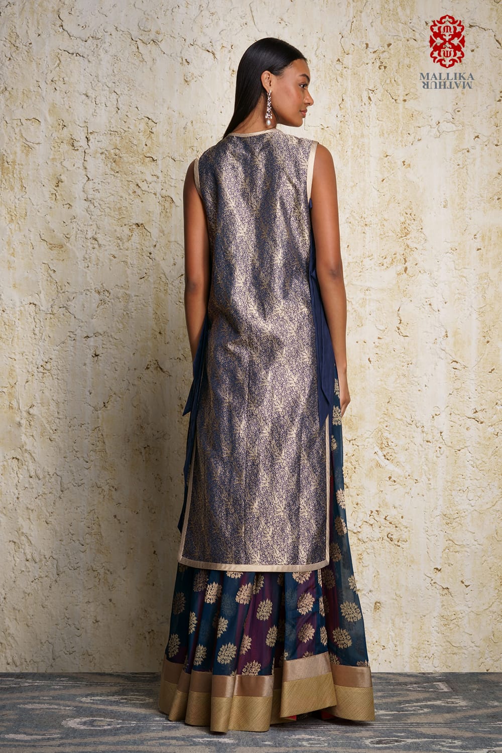 ‘Mizuki’ silk brocade oriental tunic navy blue with satin tie ups on both sides paired with a midnight blue ‘Mughal Bloom’ kora silk skirt handwoven in zari and resham Mughal floral motifs.