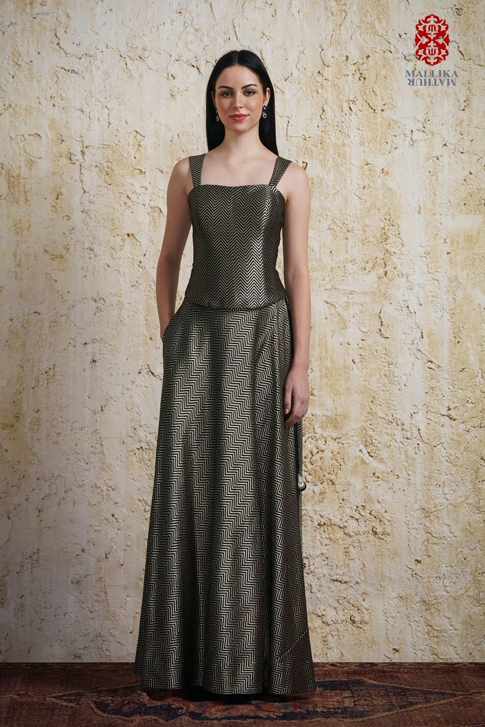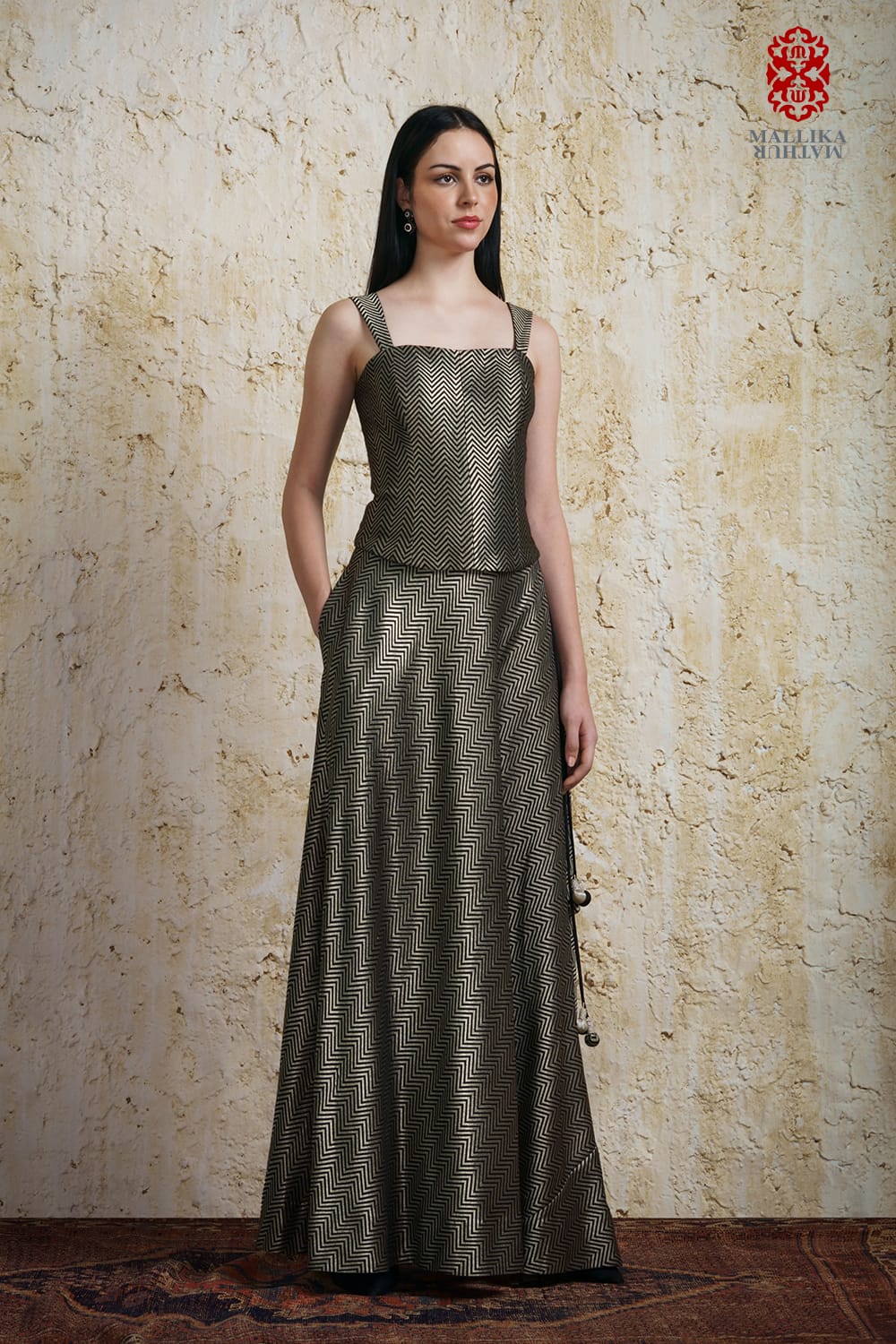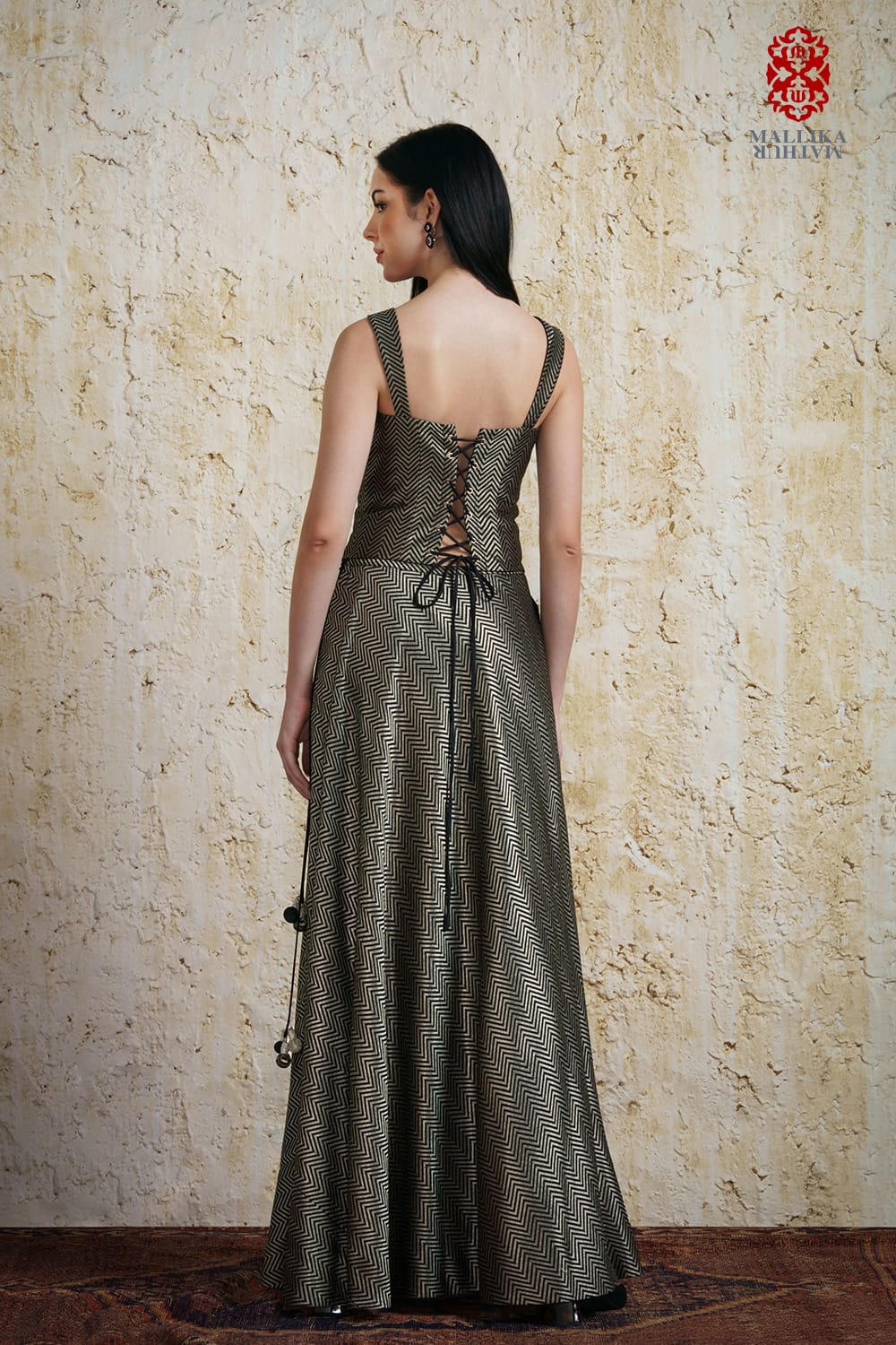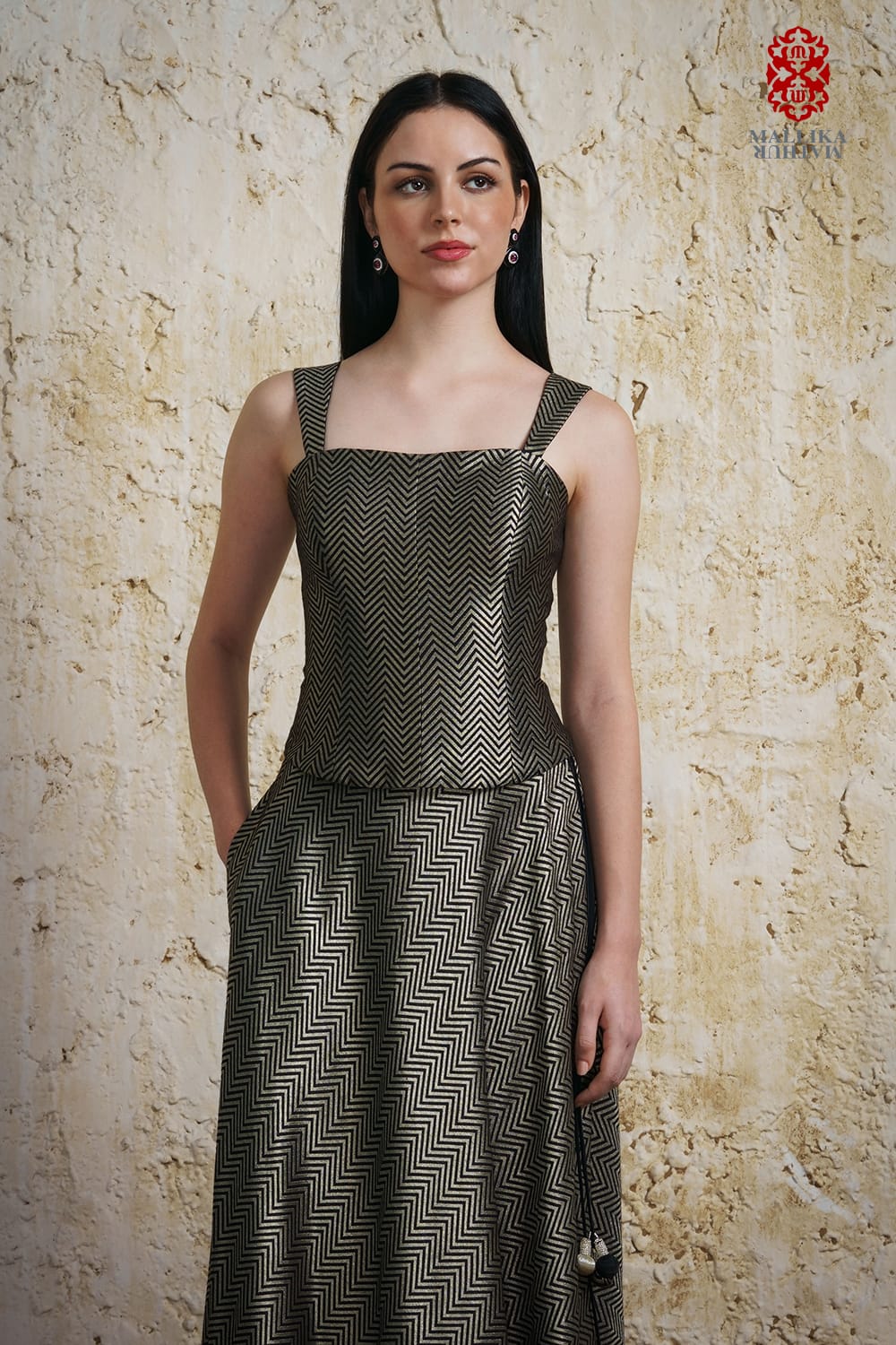 ‘Runa’ munga tussar silk skirt black and gold chevron design skirt paired with a lace up eyelet corset with straps. These ubiquitous zig-zags have roots that date back to 1800 BC and hence the chevron is a classic design.