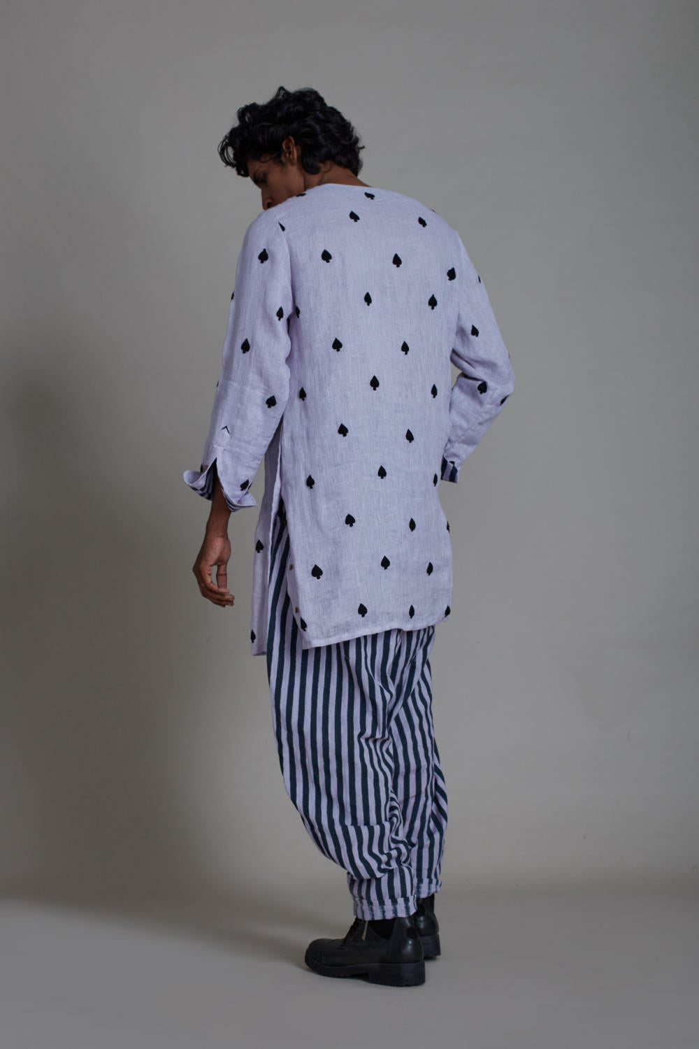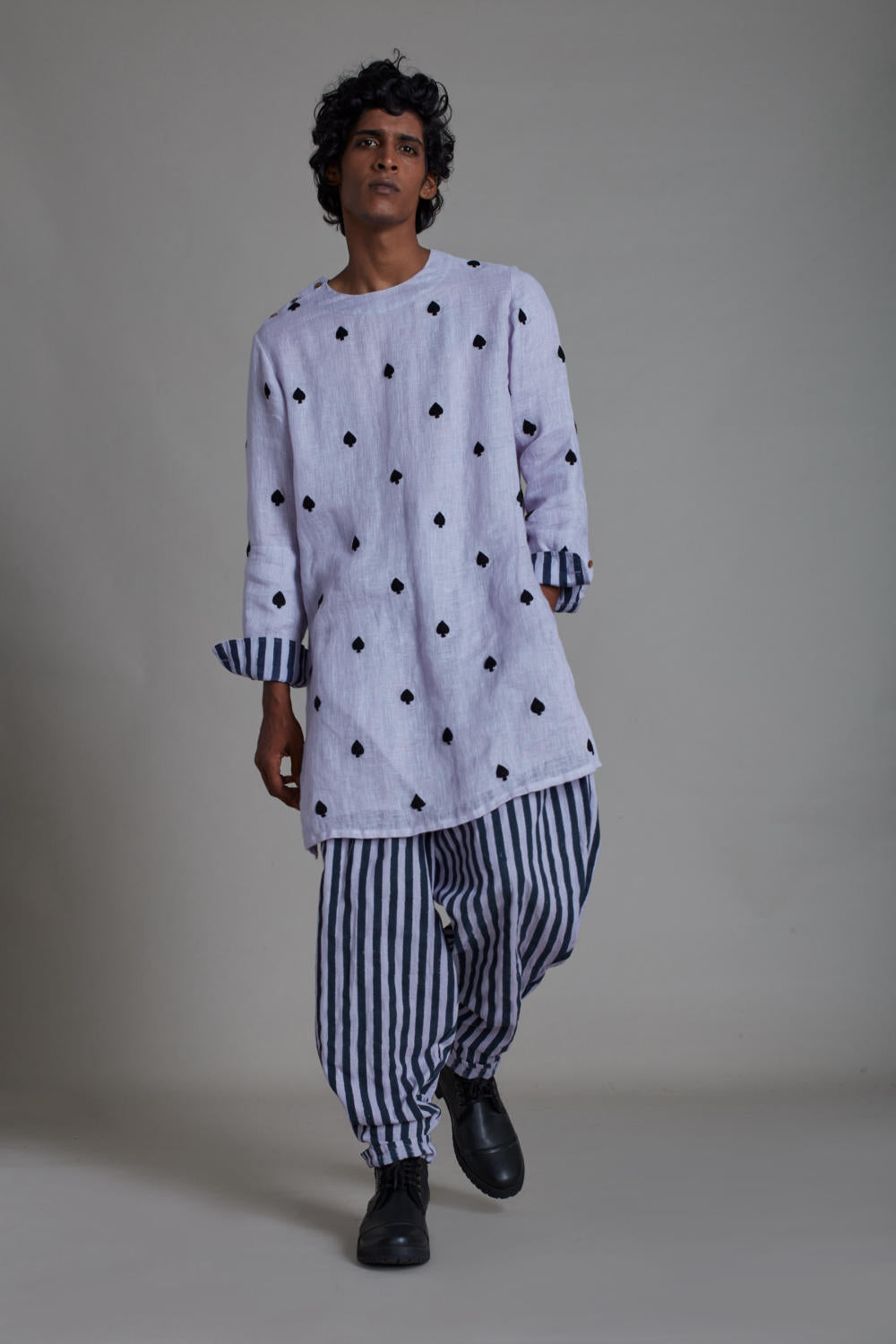 KURTA PANT SET: Stylish & functional, this kurta set is the perfect example of sophisticated-meets-cool. The striped balloon pants on linen embroidered kurta enhances the look. Hand crafted in rich linen and cotton this is a perfect fit for any occasion.