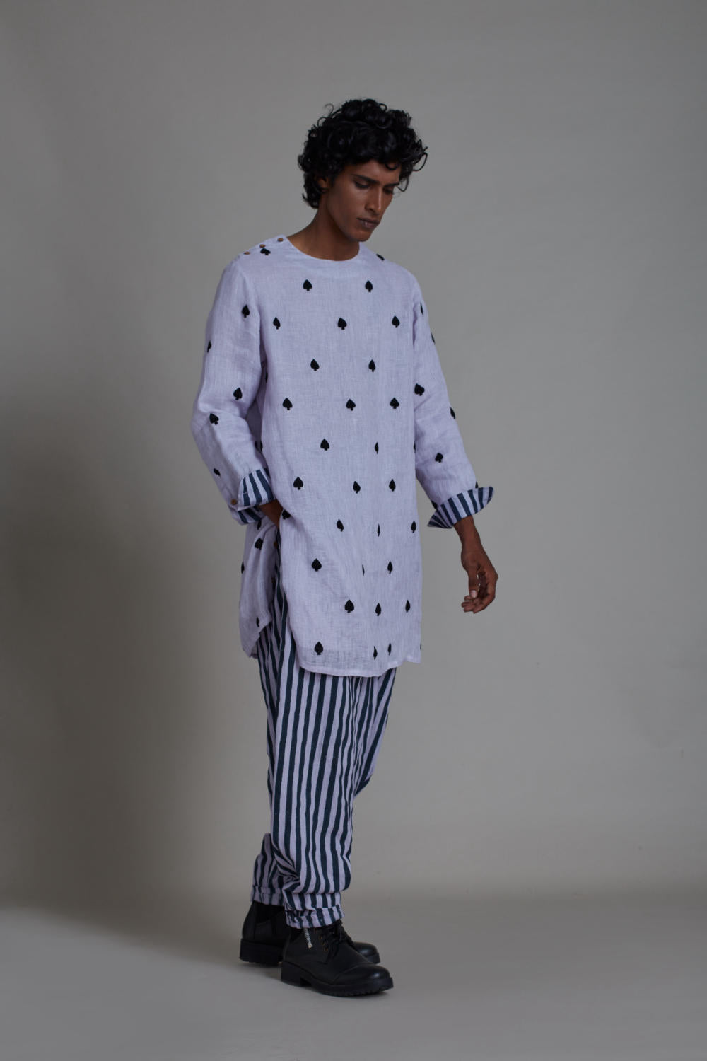 KURTA: This linen kurta is great for the festivities. Hand crafted in rich linen and thread embroidery this is a perfect fit for any occasion. The side button and side pockets adds definition to the kurta.