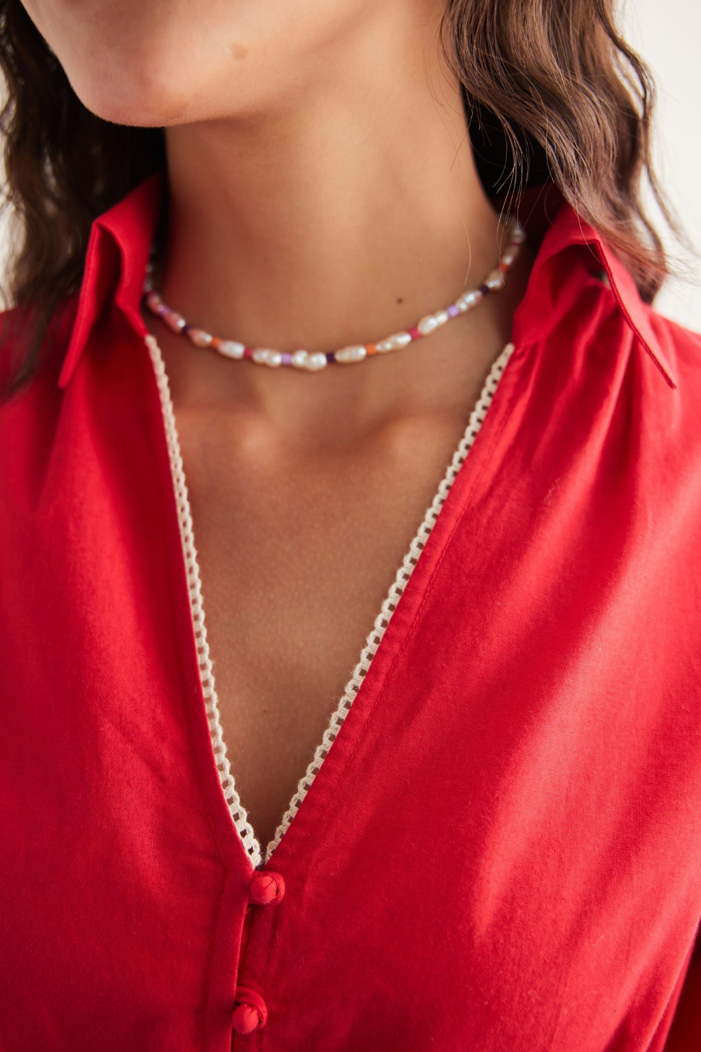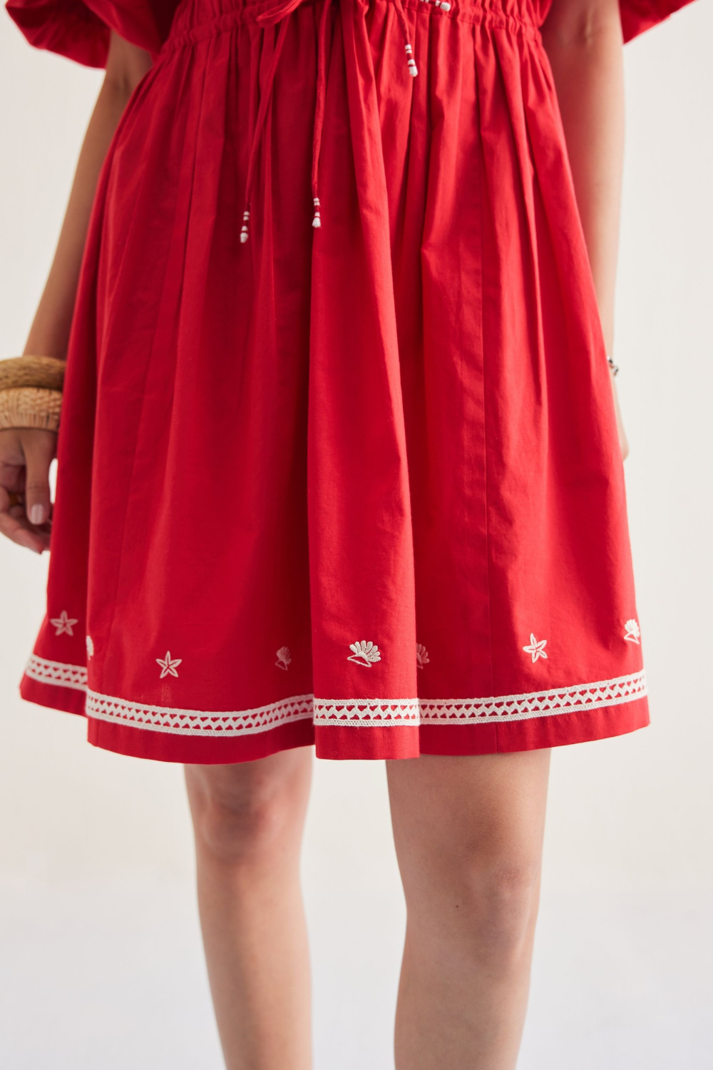 Fitted, v-neck, half puff sleeve, mini dress that buttons at the front and is fitted at the waist with drawstrings, crafted in azo-free dyed organic cotton poplin fabric, machine embroidered with seashell and starfish motifs.