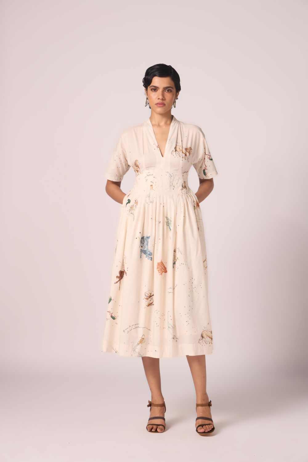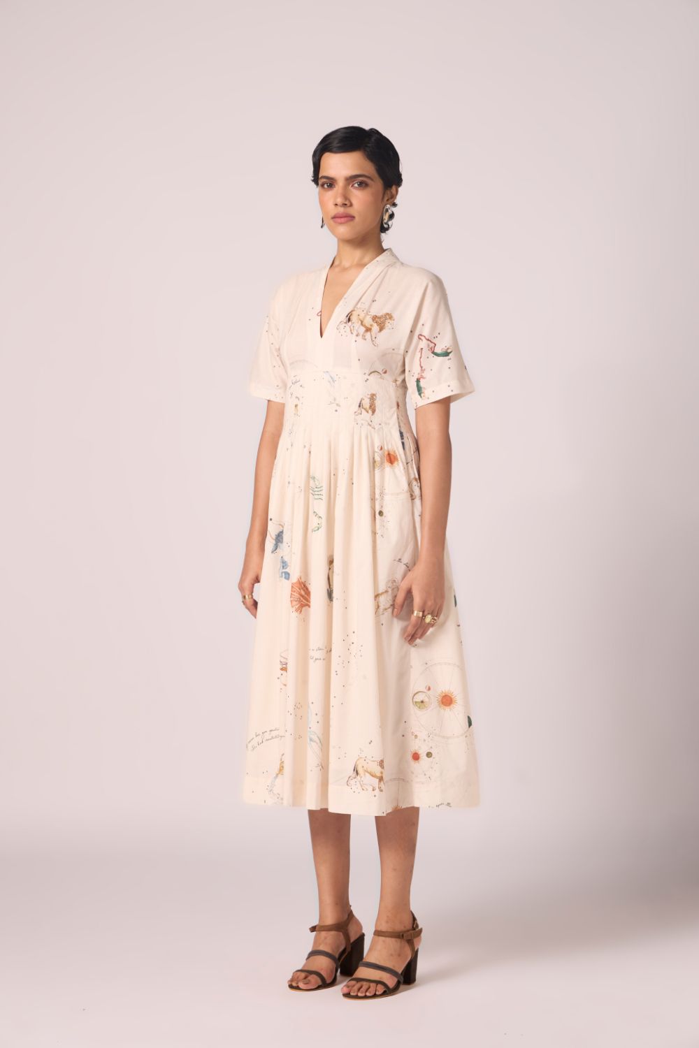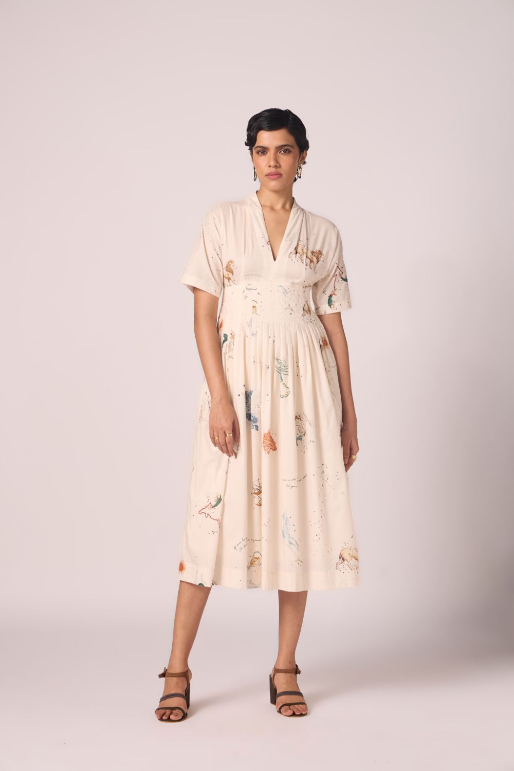 A graceful midi dress in our signature print, crafted from lush cotton cambric. Thoughtful pleating at the collar and waistline lends gentle structure, while relaxed sleeves and a flowing silhouette keep the mood effortlessly chic.