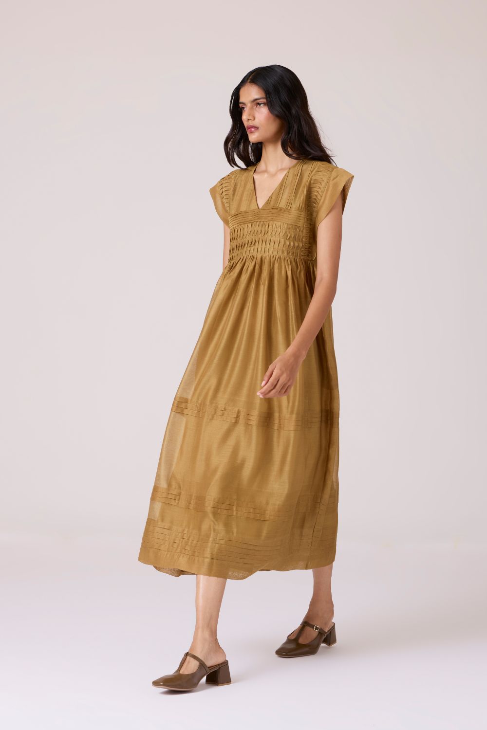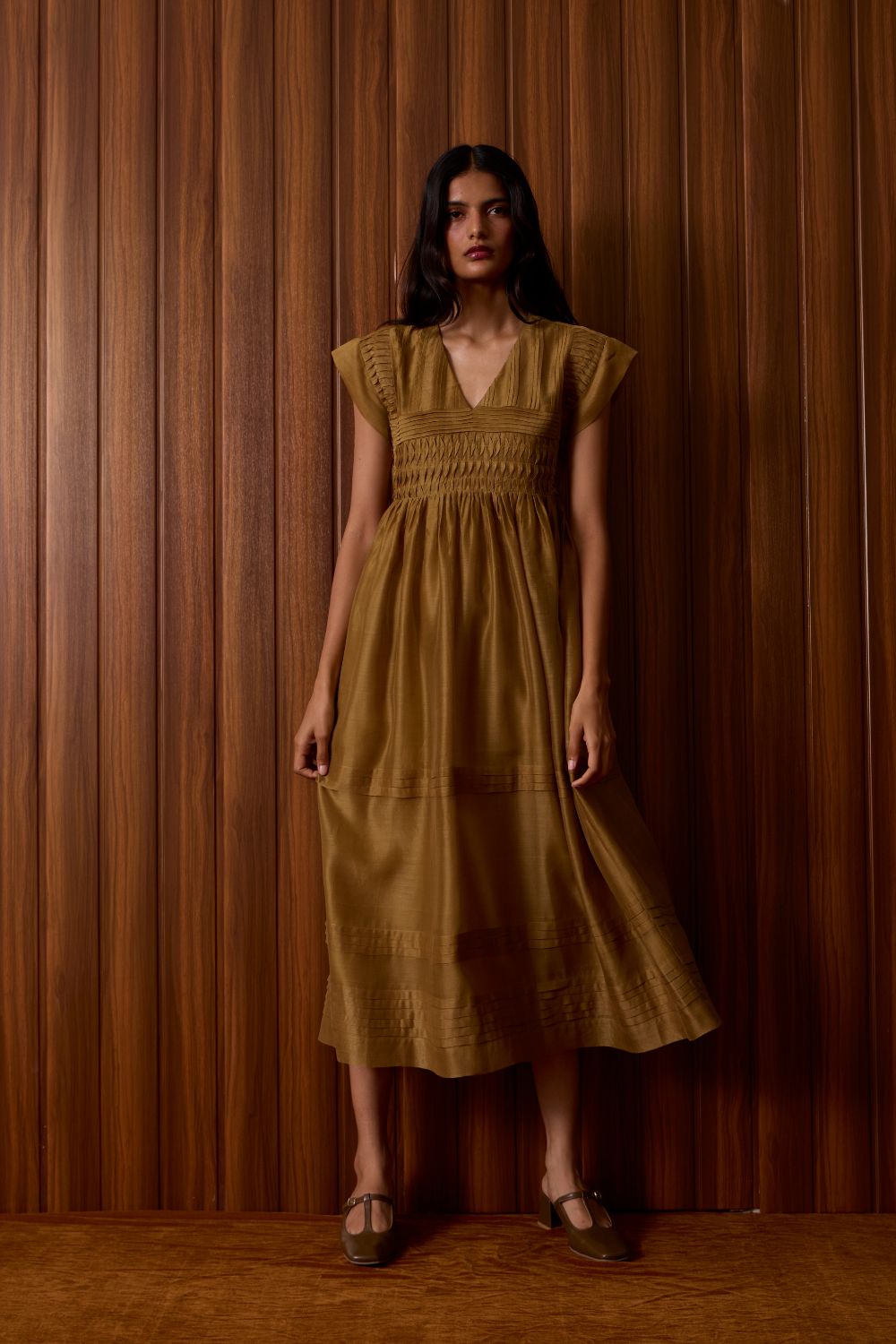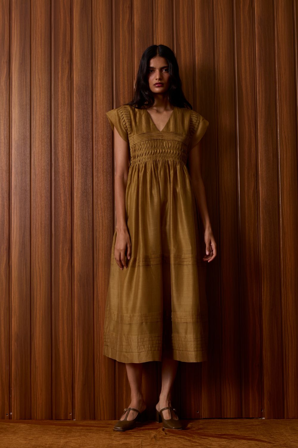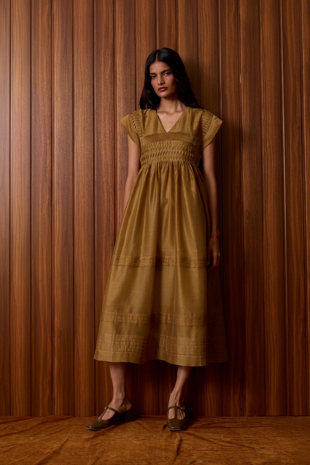Pintucks sharpen the surface, while the fluid cut maintains ease. A dress that carries structure without rigidity.