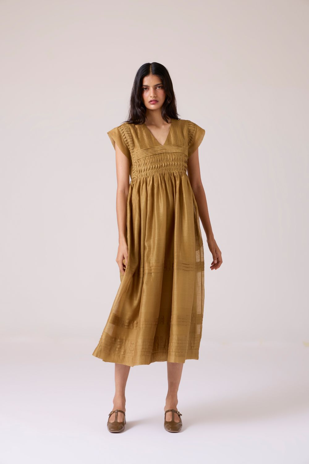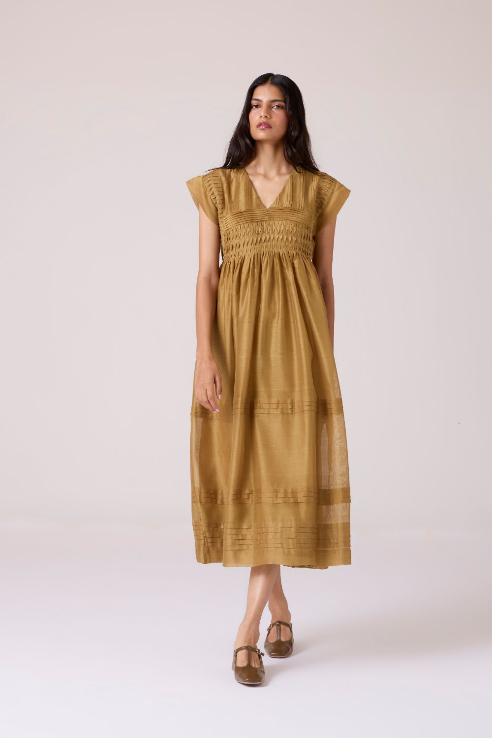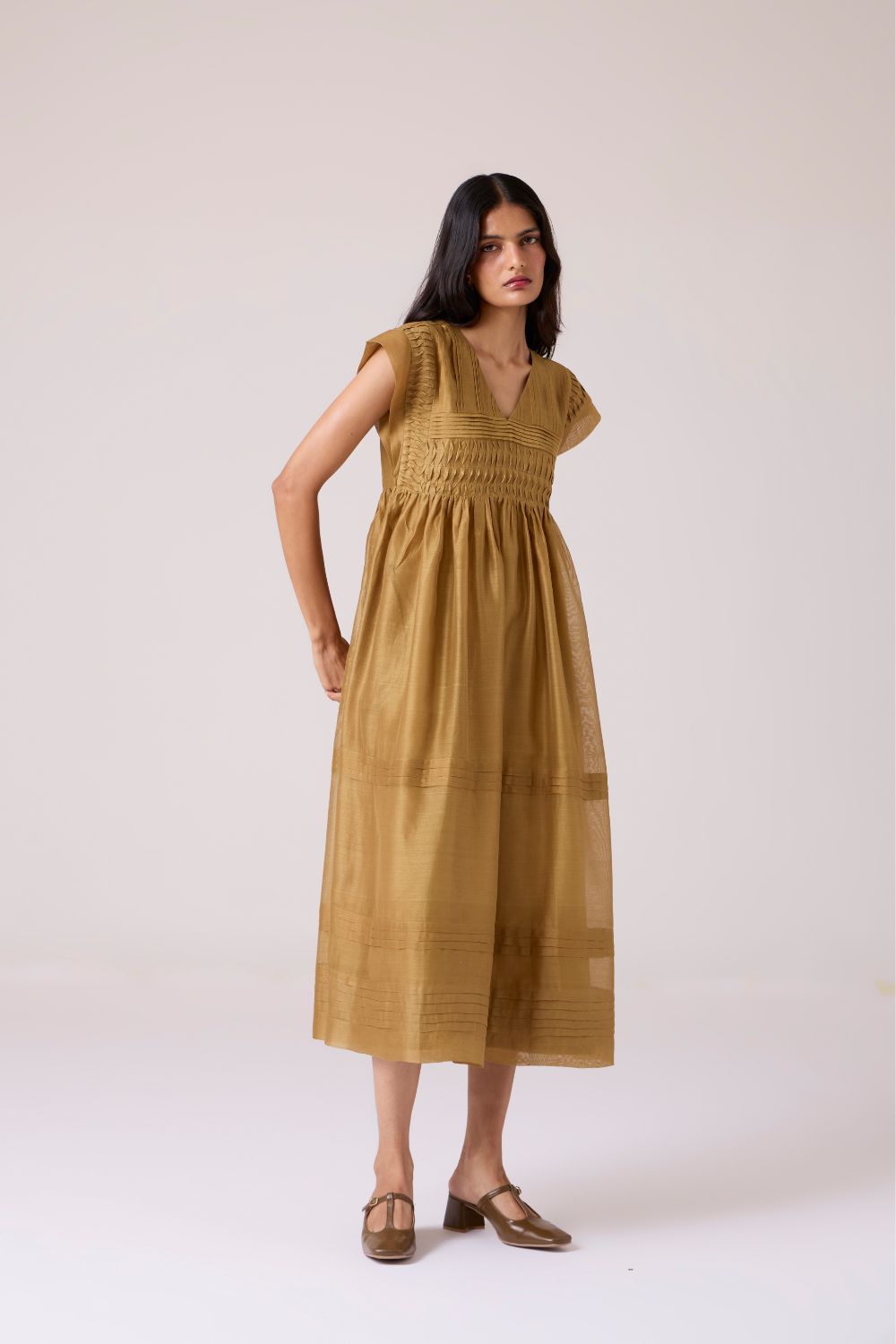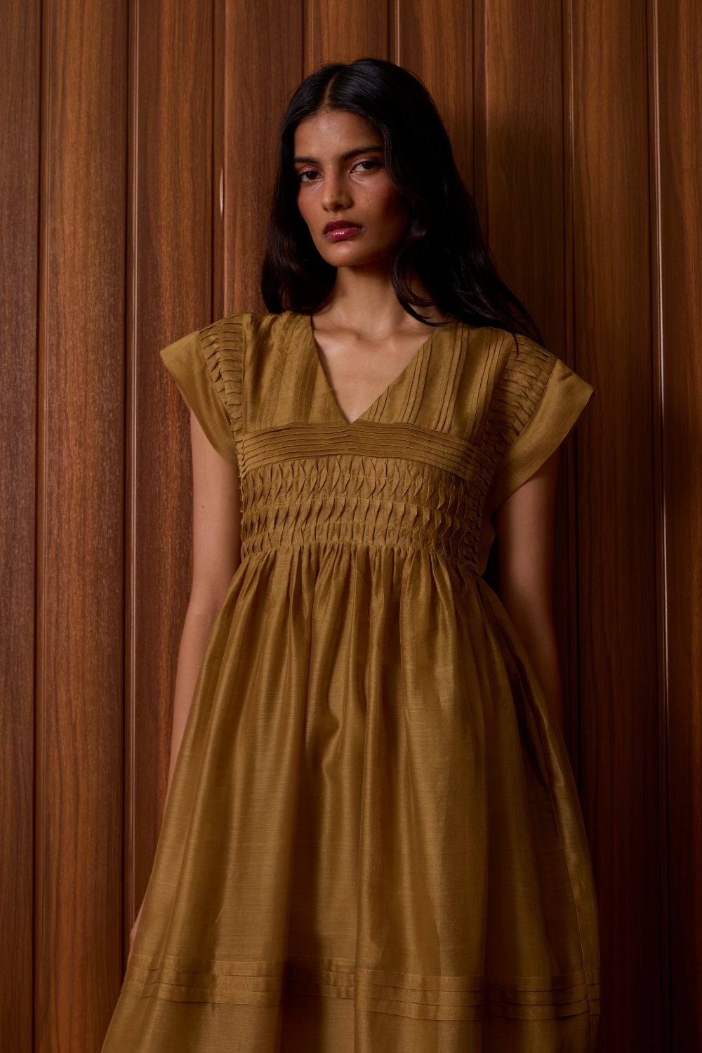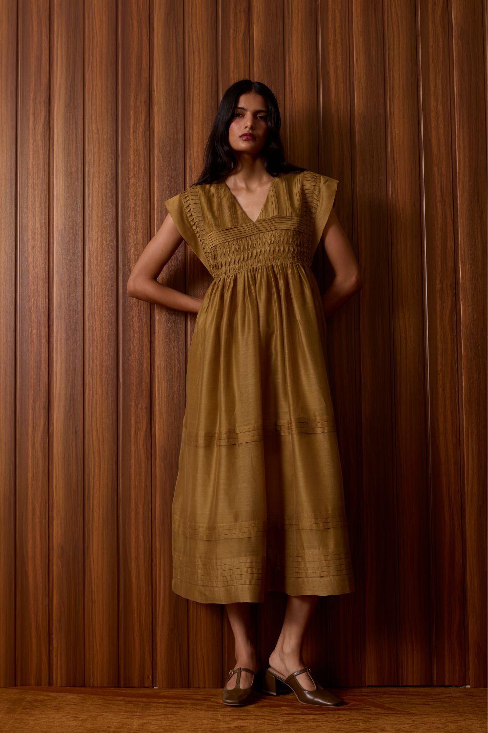 Pintucks sharpen the surface, while the fluid cut maintains ease. A dress that carries structure without rigidity.