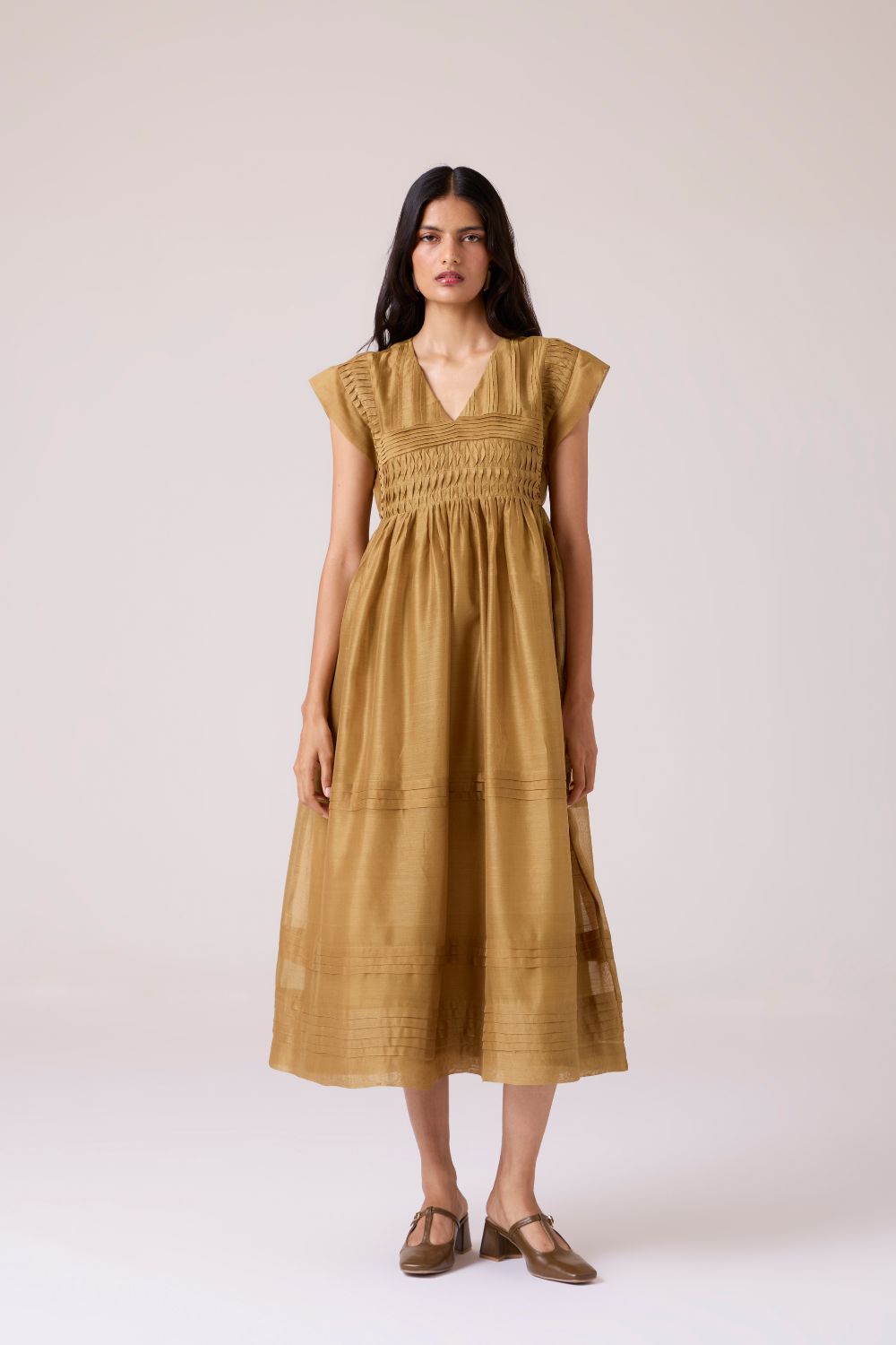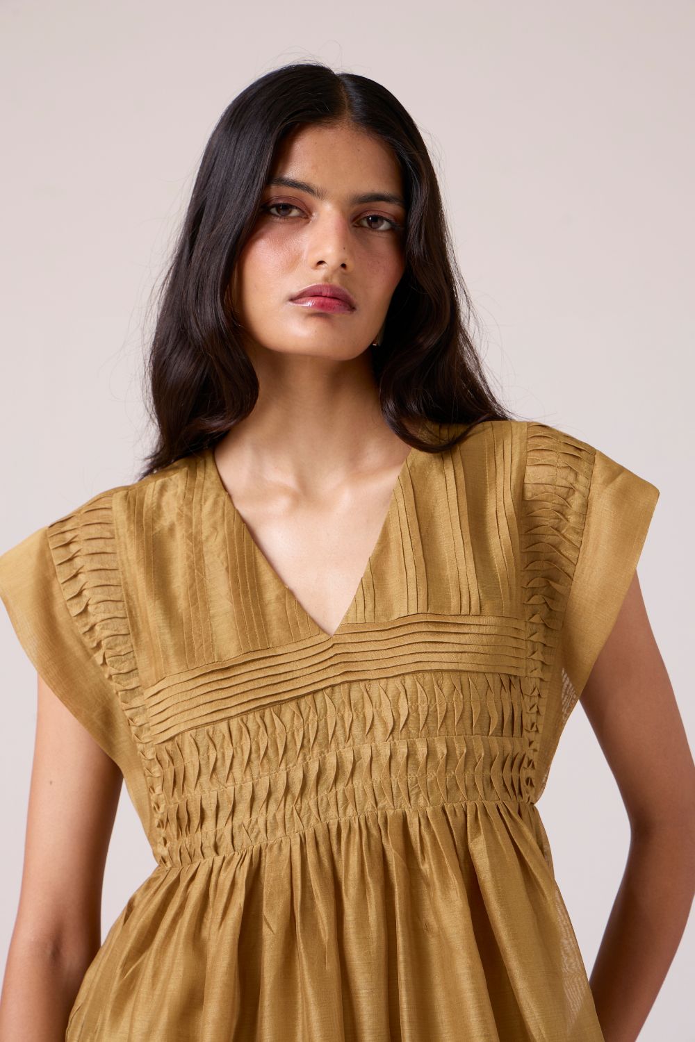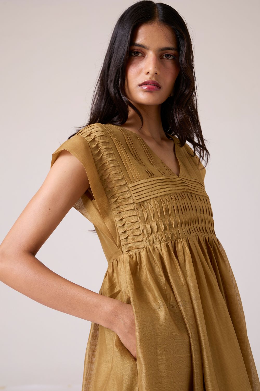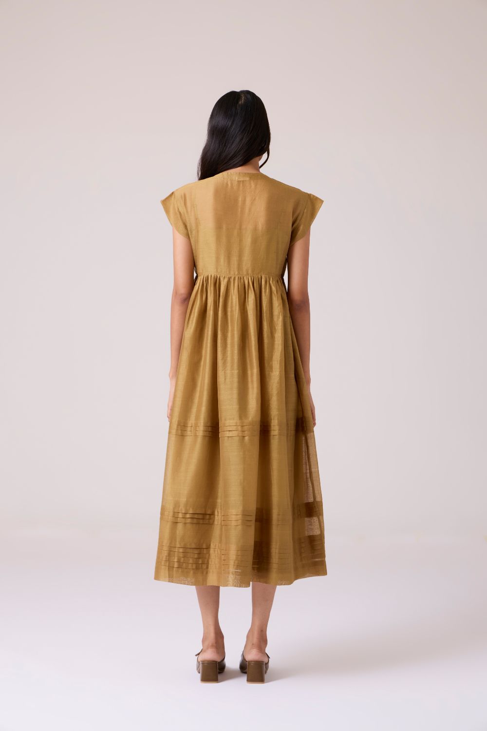 Pintucks sharpen the surface, while the fluid cut maintains ease. A dress that carries structure without rigidity.