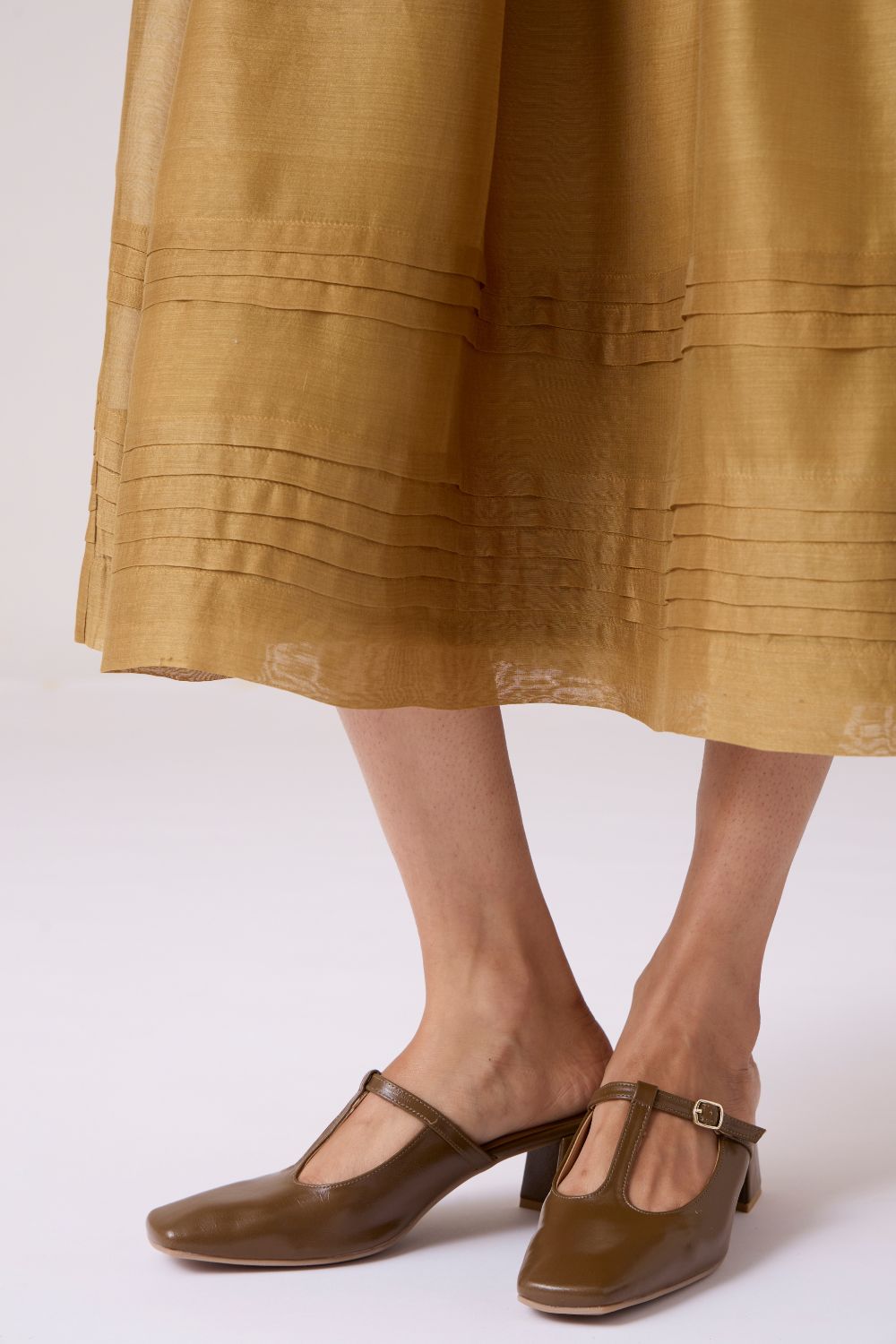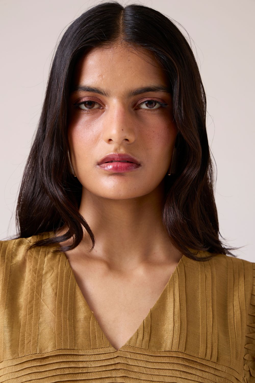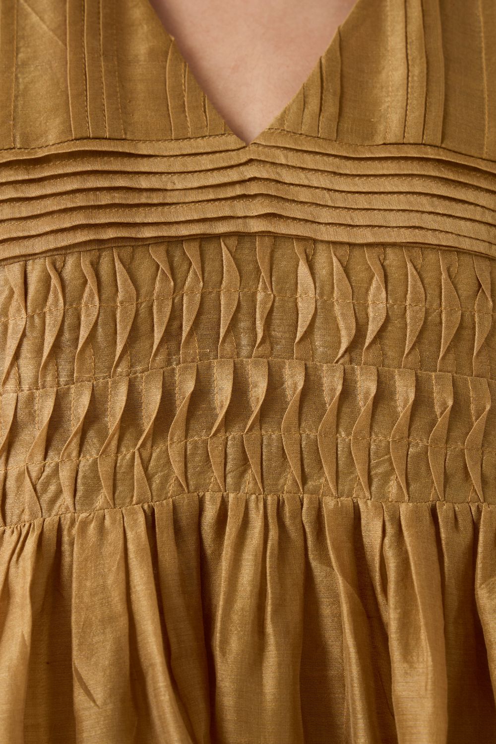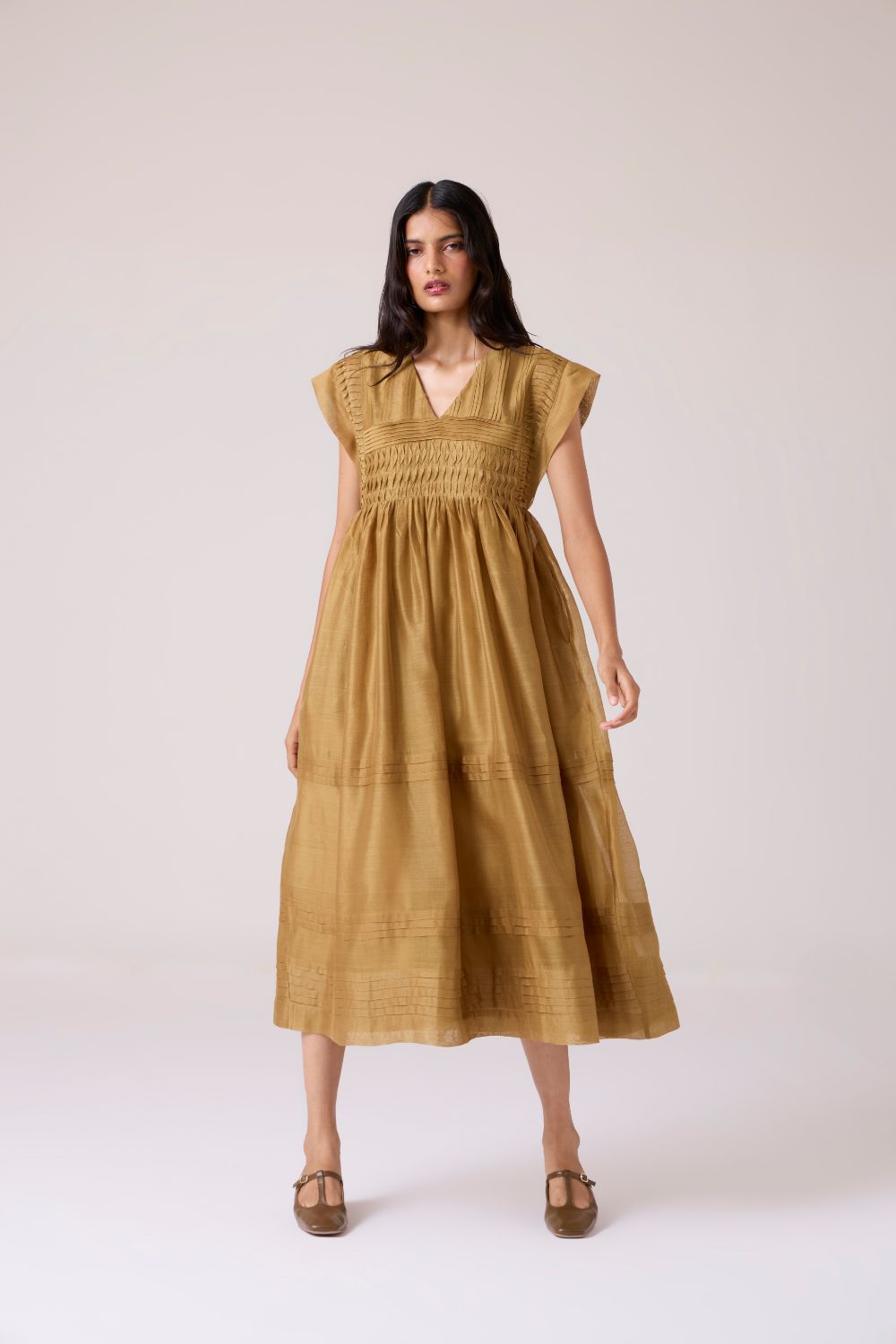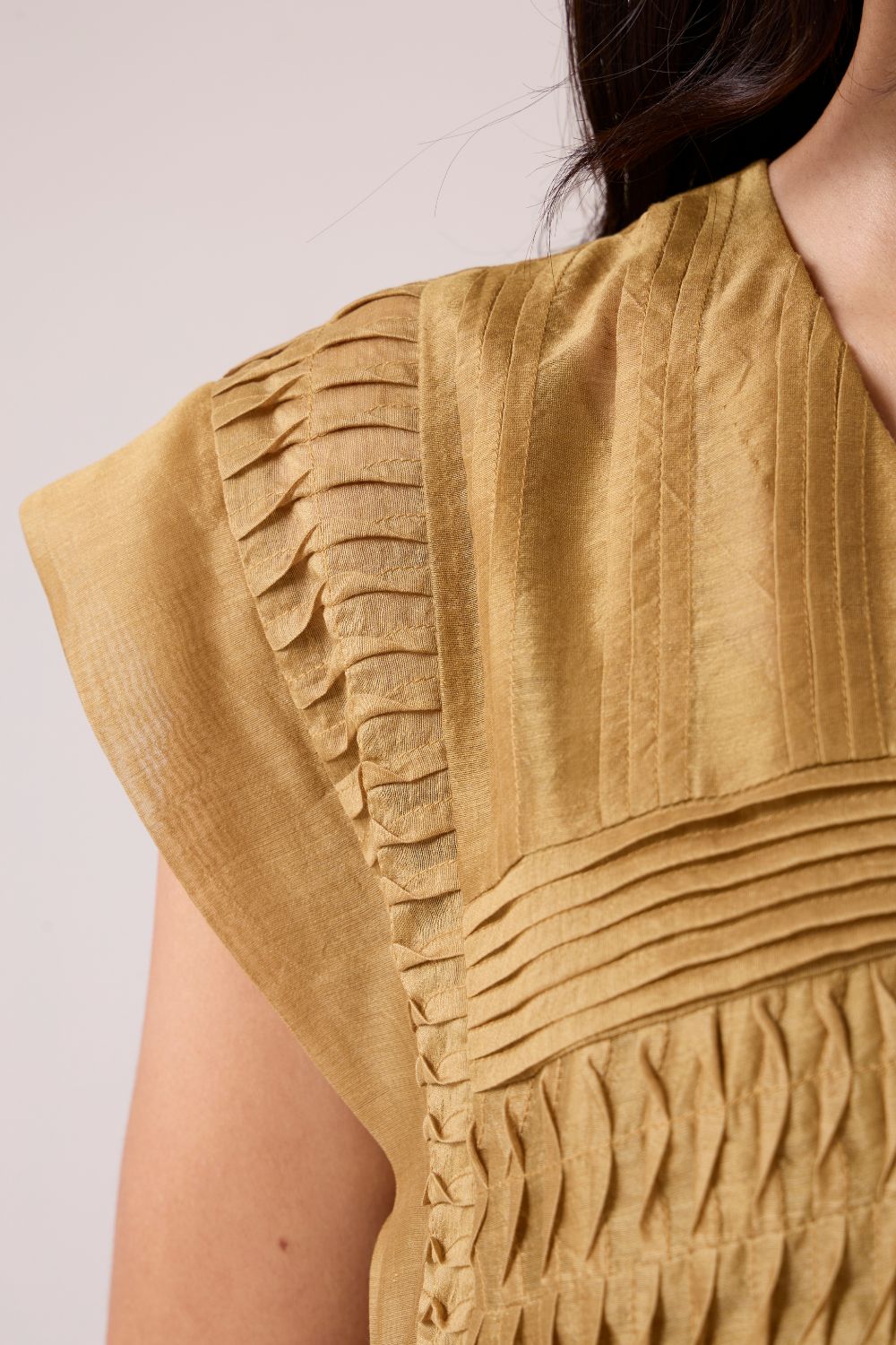 Pintucks sharpen the surface, while the fluid cut maintains ease. A dress that carries structure without rigidity.