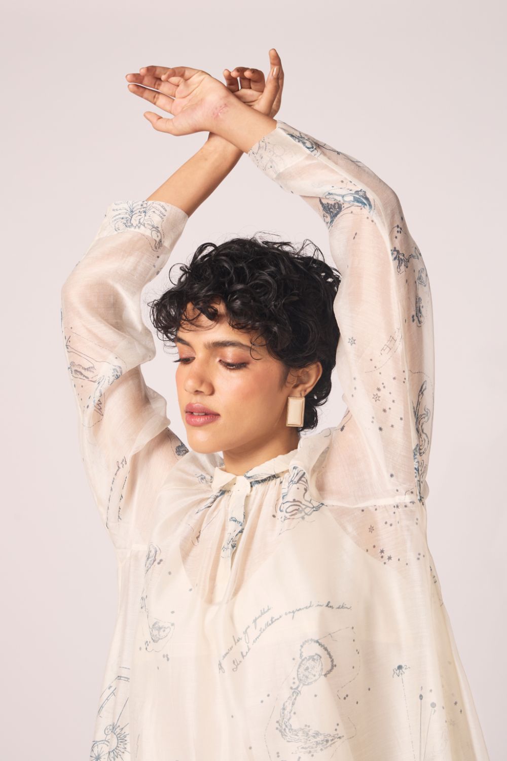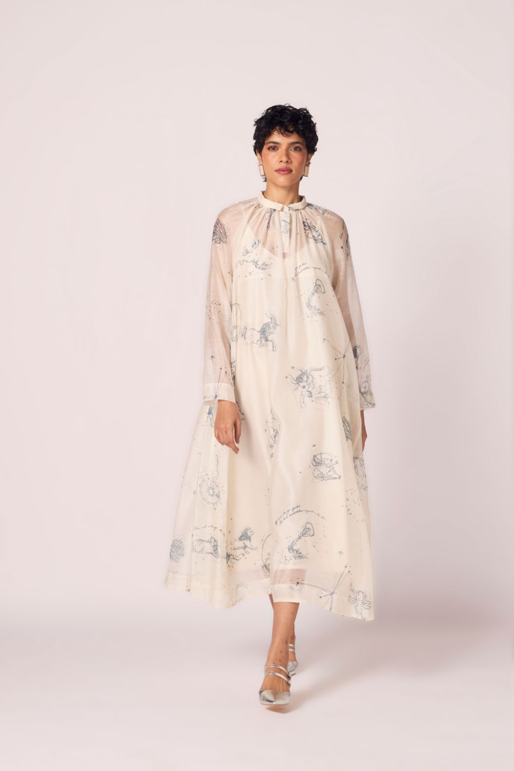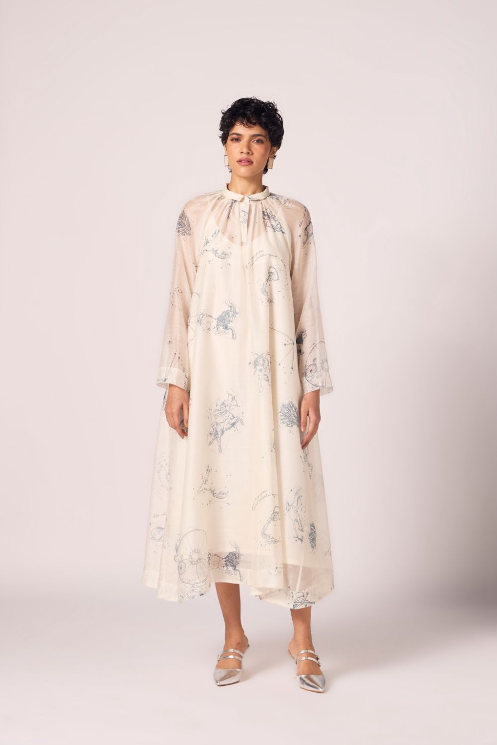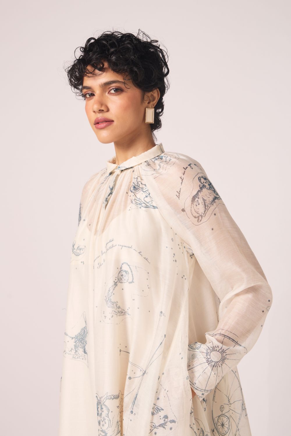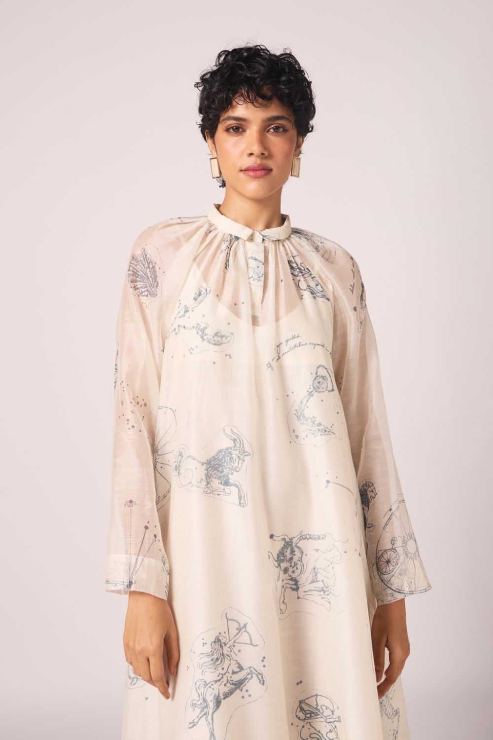 Airy Chanderi carries zodiac-inspired print with quiet elegance. Gentle gathers at the neckline meet a slim collar, while raglan sleeves fall fluidly to the wrist. Designed with in-seam pockets and a slip, it blends ease with refinement.